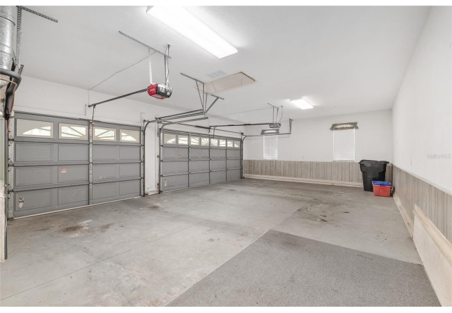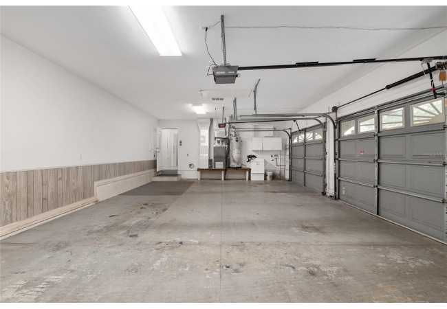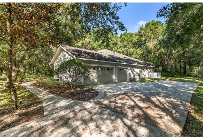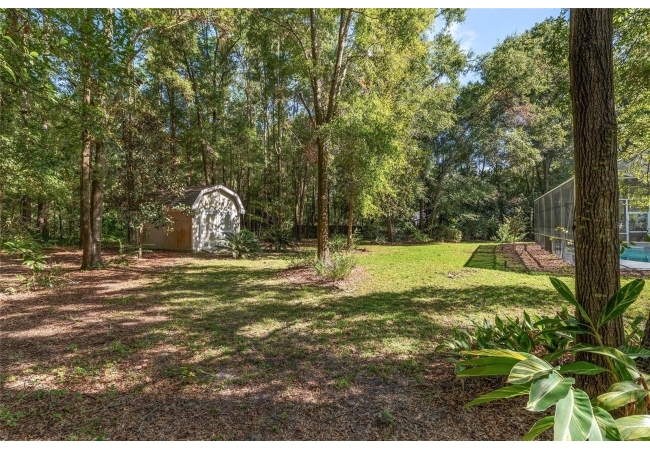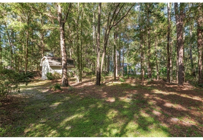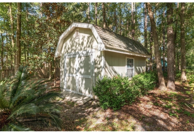 Additional features include a laundry room with washer, dryer, sink, and built-in ironing board, a three-car garage, and a matching storage shed for extra utility. The wooded backyard provides privacy and a serene setting for outdoor relaxation.