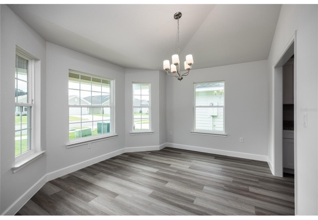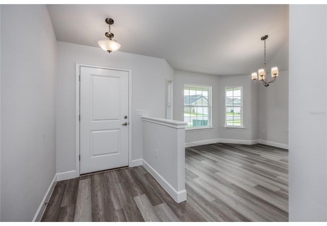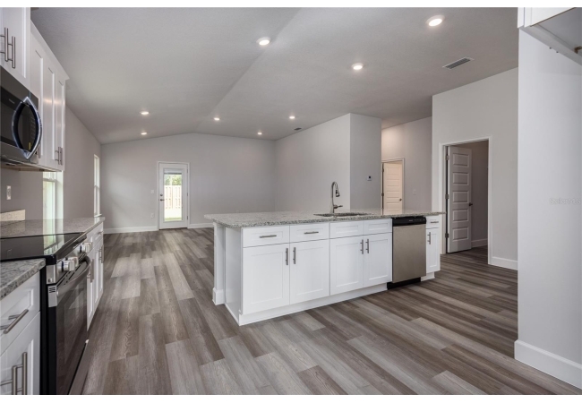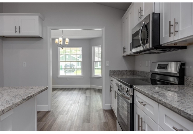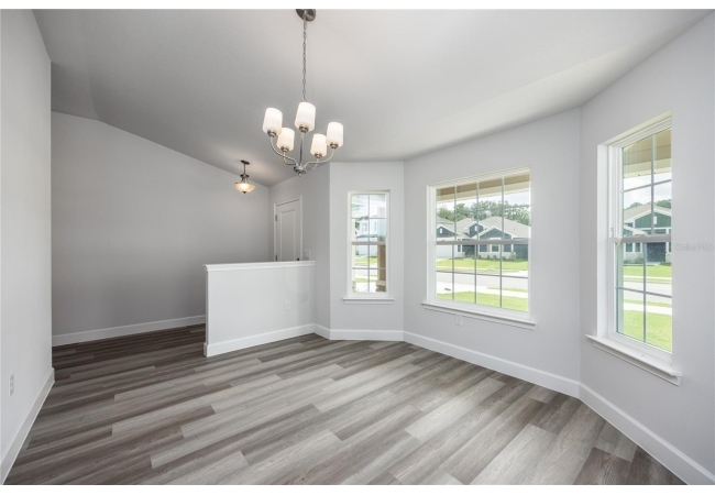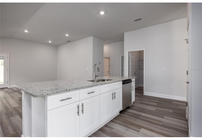 The exterior showcases Hardie siding, stacked stone accents, a large front porch, and timeless curb appeal. Enjoy an open floor plan with luxury vinyl plank flooring, a spacious great room, and a formal dining area perfect for entertaining. The chef-inspired kitchen features a large island, granite countertops, and stainless steel Frigidaire appliances. Step out to the covered lanai overlooking a peaceful pond view, which is ideal for relaxing or hosting gatherings.