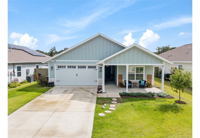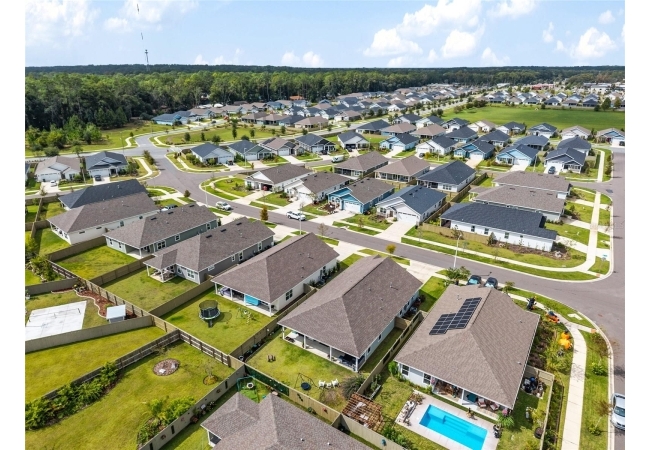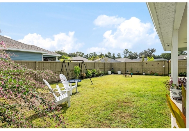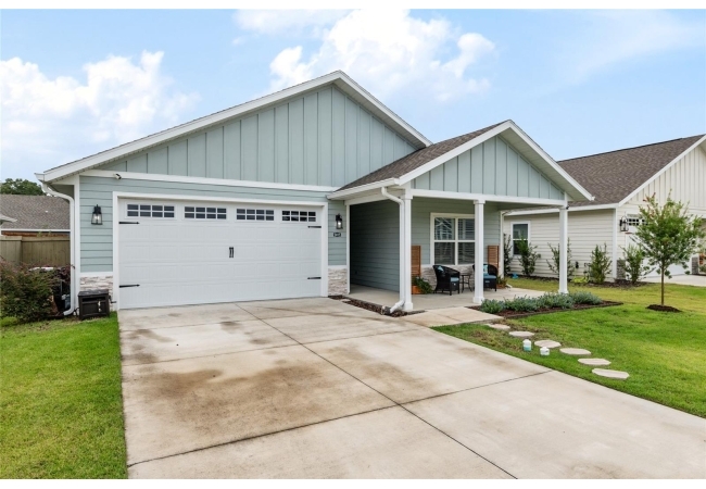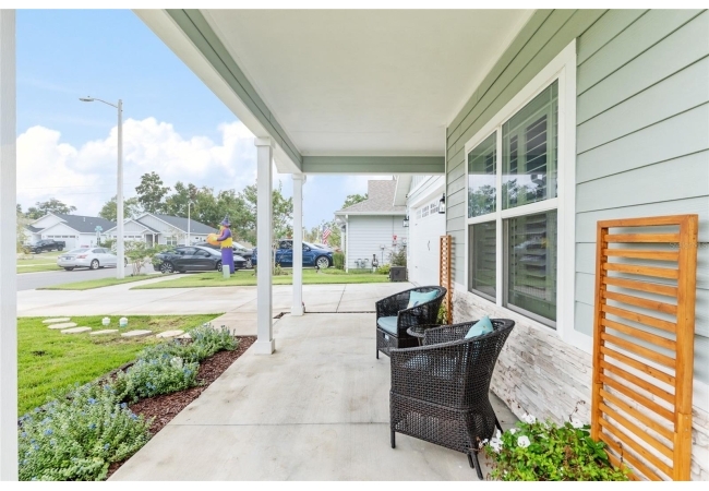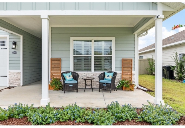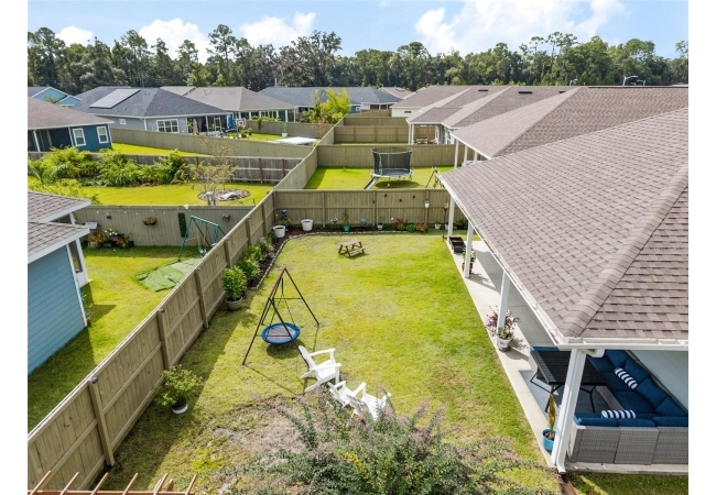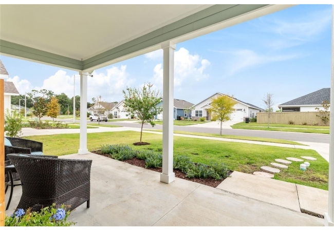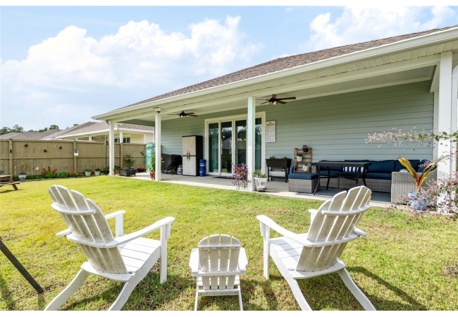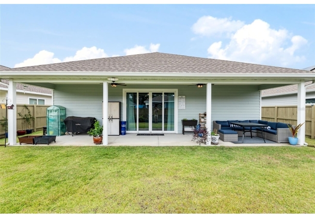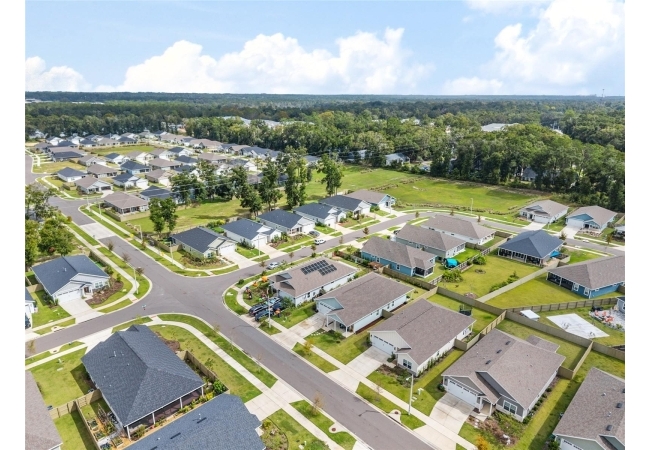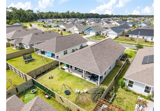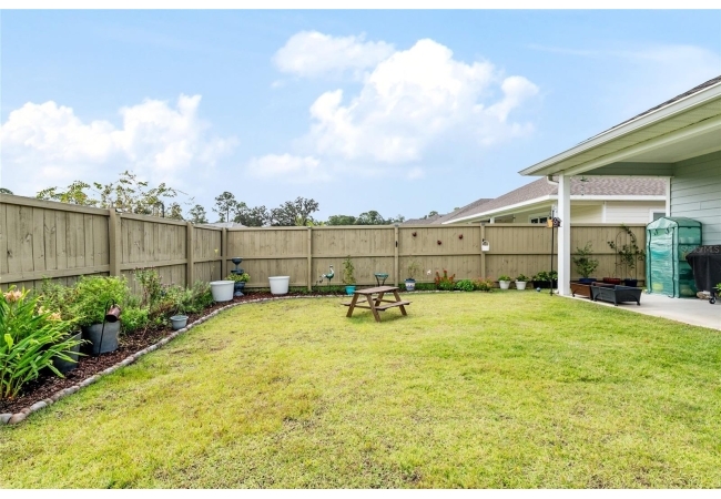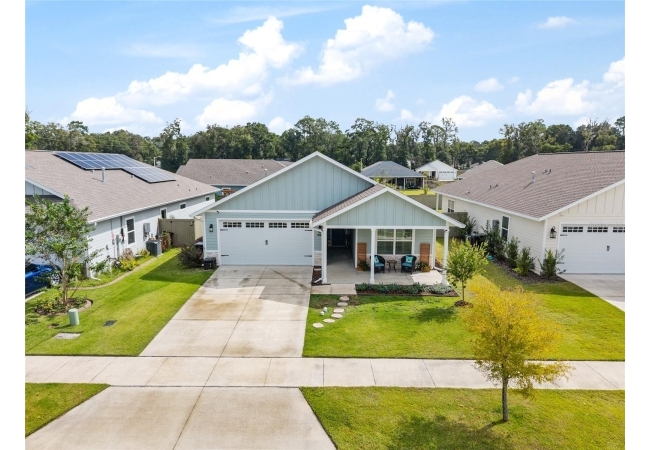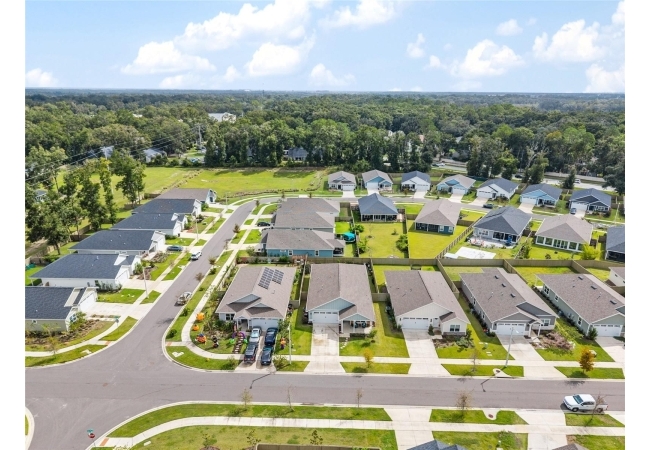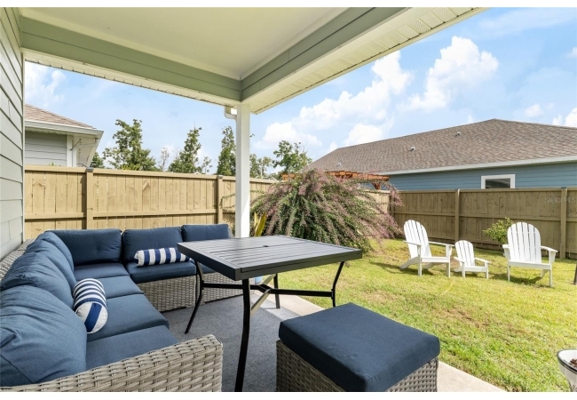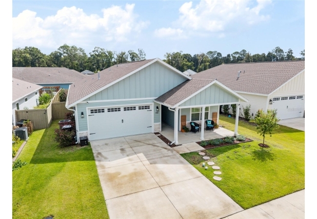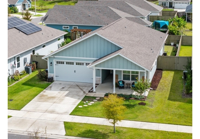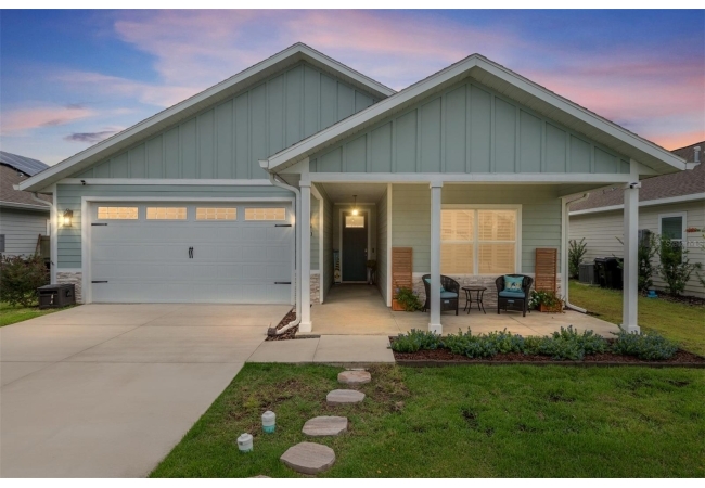 Stylish Comfort Meets Smart Luxury in Grand Oaks! Built in 2022, this stunning Hayleigh II Plan by Weseman Homes & Renovations offers modern craftsmanship, thoughtful upgrades, and a touch of luxury—all in the heart of SW Gainesville’s sought-after Grand Oaks community. Enjoy the convenience of a pool, playground, and covered pavilion just minutes from UF, UF Health, Celebration Pointe, and Butler Plaza.This 4-bedroom, 2.5-bath home features 1,871 square feet of well-designed living space with no carpet, luxury vinyl plank flooring, and ceramic tile throughout. The inviting open layout is filled with natural light, 9-foot ceilings, and tray details with crown molding in both the living area and owner’s suite.The chef’s kitchen impresses with shaker-style soft-close wood cabinetry, quartz countertops, tile backsplash, and stainless steel appliances, including a gas cooktop, wall oven/microwave combo, and a Samsung Bespoke 4-Door Smart Refrigerator in Morning Blue & White Glass. The living room flows effortlessly to a large 17.4ft x 10ft covered back porch overlooking a private, fully fenced backyard with lush zoysia grass and colorful garden beds—perfect for entertaining or relaxing outdoors. The spacious owner’s retreat feels like a private spa with a double-sink vanity featuring deep storage drawers, a large walk-in shower with dual shower heads, a private water closet, and an expansive walk-in closet with a custom wood organization system. Every detail adds comfort and sophistication: custom wood shutters, a decorative mud bench, a closetmaid system in one of the bedrooms, and an extra pantry/linen closet for smart storage. The owner's Energy-efficient features include 15 SEER HVAC, Low-E vinyl windows, R31 attic insulation, R13 walls, radiant heat barrier, and a gas tankless water heater. The home’s curb appeal shines with Hardiboard siding, board and batten accents, stone finishes, and 8-ft carriage-style garage doors for the 2-car garage. The RARE front, side and back irrigation system, and covered front porch complete this beautiful, move-in-ready home. Experience modern living with lasting quality—a rare combination of comfort, luxury, and location in Grand Oaks.