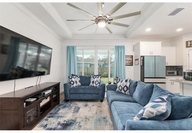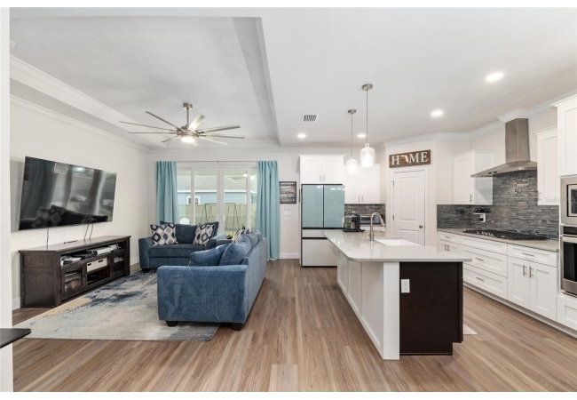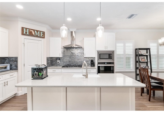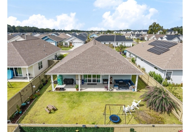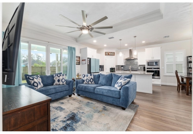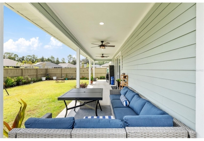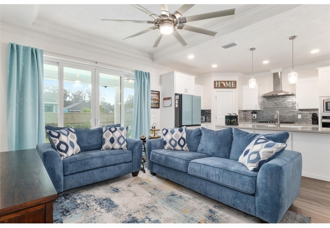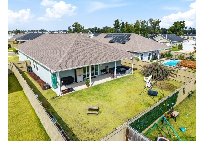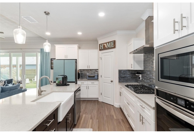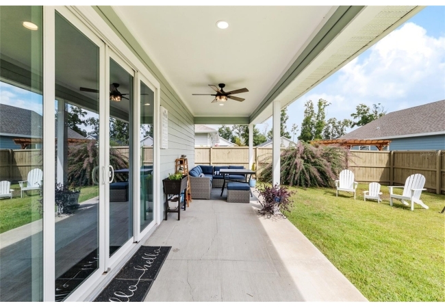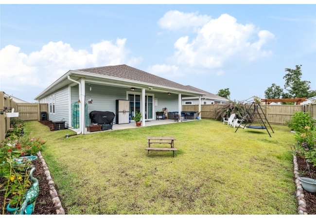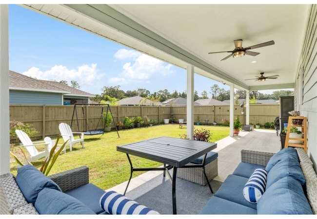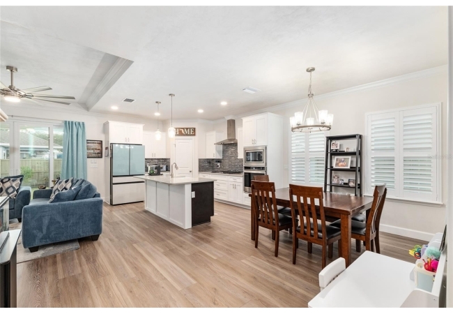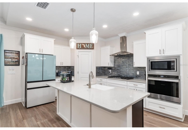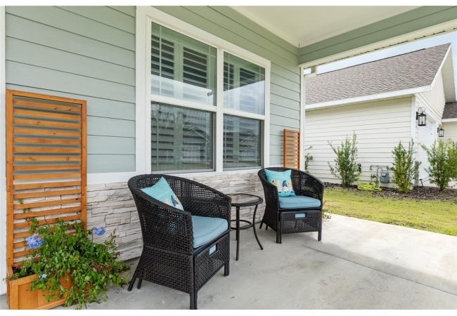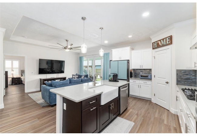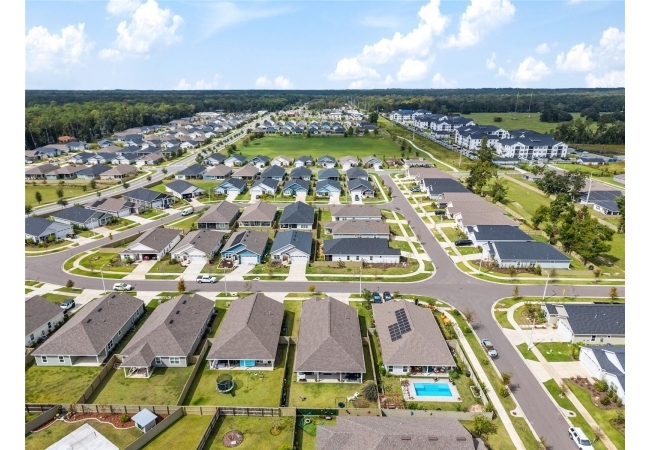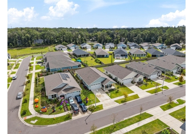 Stylish Comfort Meets Smart Luxury in Grand Oaks! Built in 2022, this stunning Hayleigh II Plan by Weseman Homes & Renovations offers modern craftsmanship, thoughtful upgrades, and a touch of luxury—all in the heart of SW Gainesville’s sought-after Grand Oaks community. Enjoy the convenience of a pool, playground, and covered pavilion just minutes from UF, UF Health, Celebration Pointe, and Butler Plaza.This 4-bedroom, 2.5-bath home features 1,871 square feet of well-designed living space with no carpet, luxury vinyl plank flooring, and ceramic tile throughout. The inviting open layout is filled with natural light, 9-foot ceilings, and tray details with crown molding in both the living area and owner’s suite.The chef’s kitchen impresses with shaker-style soft-close wood cabinetry, quartz countertops, tile backsplash, and stainless steel appliances, including a gas cooktop, wall oven/microwave combo, and a Samsung Bespoke 4-Door Smart Refrigerator in Morning Blue & White Glass. The living room flows effortlessly to a large 17.4ft x 10ft covered back porch overlooking a private, fully fenced backyard with lush zoysia grass and colorful garden beds—perfect for entertaining or relaxing outdoors. The spacious owner’s retreat feels like a private spa with a double-sink vanity featuring deep storage drawers, a large walk-in shower with dual shower heads, a private water closet, and an expansive walk-in closet with a custom wood organization system. Every detail adds comfort and sophistication: custom wood shutters, a decorative mud bench, a closetmaid system in one of the bedrooms, and an extra pantry/linen closet for smart storage. The owner's Energy-efficient features include 15 SEER HVAC, Low-E vinyl windows, R31 attic insulation, R13 walls, radiant heat barrier, and a gas tankless water heater. The home’s curb appeal shines with Hardiboard siding, board and batten accents, stone finishes, and 8-ft carriage-style garage doors for the 2-car garage. The RARE front, side and back irrigation system, and covered front porch complete this beautiful, move-in-ready home. Experience modern living with lasting quality—a rare combination of comfort, luxury, and location in Grand Oaks.