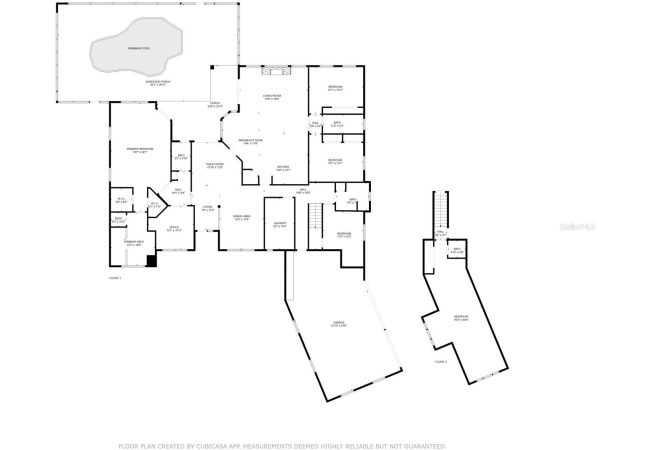 Interior features include high ceilings, a stone-accented fireplace, open living and dining areas, and a large kitchen with island seating, pantry, and excellent prep space. The main-level primary suite provides direct pool access, dual closets, and a spacious bath. Three additional bedrooms plus an upstairs suite make this layout ideal for guests or multi-generational living.