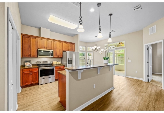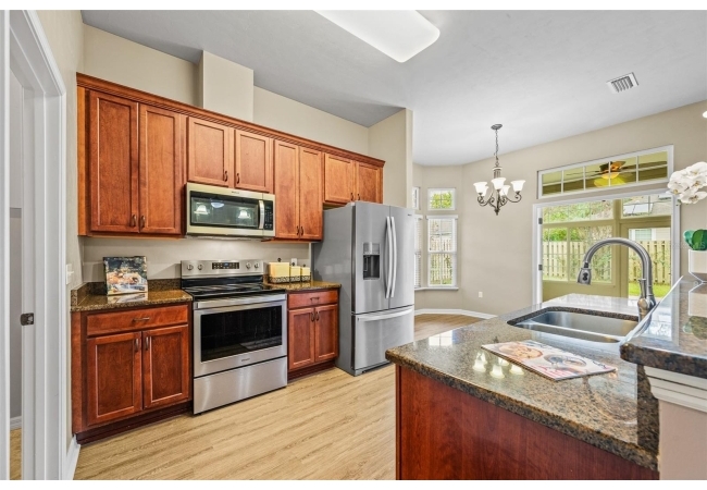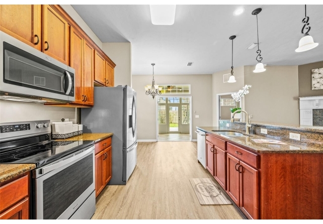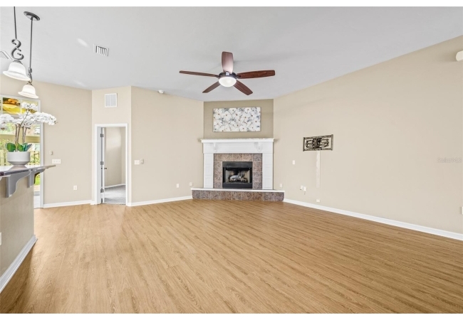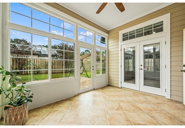 Beautiful Energy-Efficient Home in the Belmont Community. This well-crafted home in the desirable Belmont community offers an inviting open floor plan with a full house generator offering peace of mind. The welcoming front porch leads into a spacious living room featuring a gas fireplace and wood laminate flooring. The kitchen and bathrooms are enhanced with granite countertops. The primary suite includes double vanities, a glass-enclosed shower, and a luxurious walk-in jetted tub/spa, replacing the original corner tub. Enjoy relaxing or entertaining in the screened lanai, complete with sliding windows and a view of the private backyard. Belmont residents enjoy a wealth of amenities, including a pool, clubhouse, tennis and basketball courts, and a dog park. Conveniently located near Jonesville Park, the University of Florida, Santa Fe College, North Florida Regional Hospital, Tioga Town Center, and Publix, this home offers both tranquility and easy access to everyday essentials.