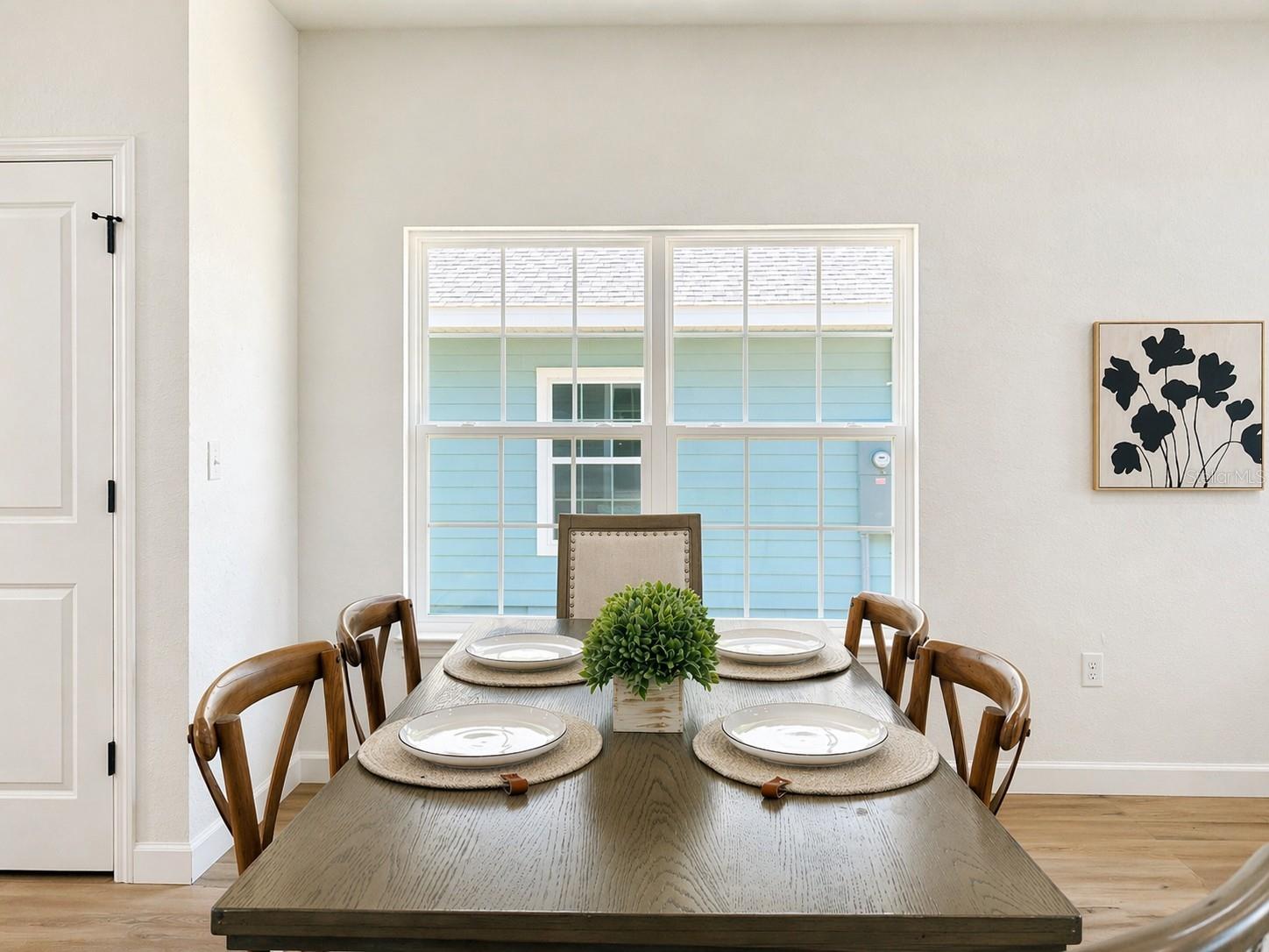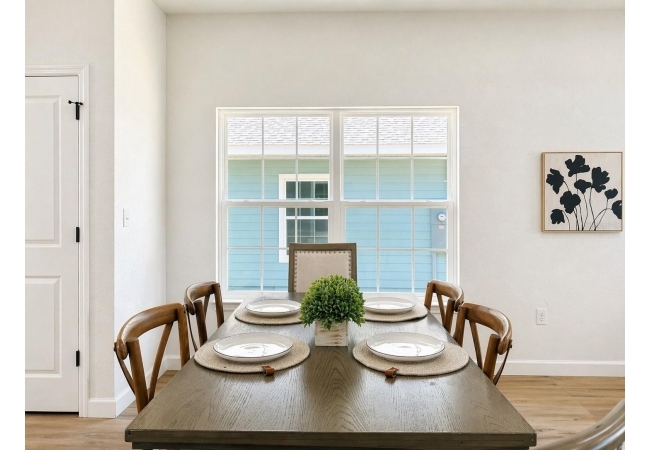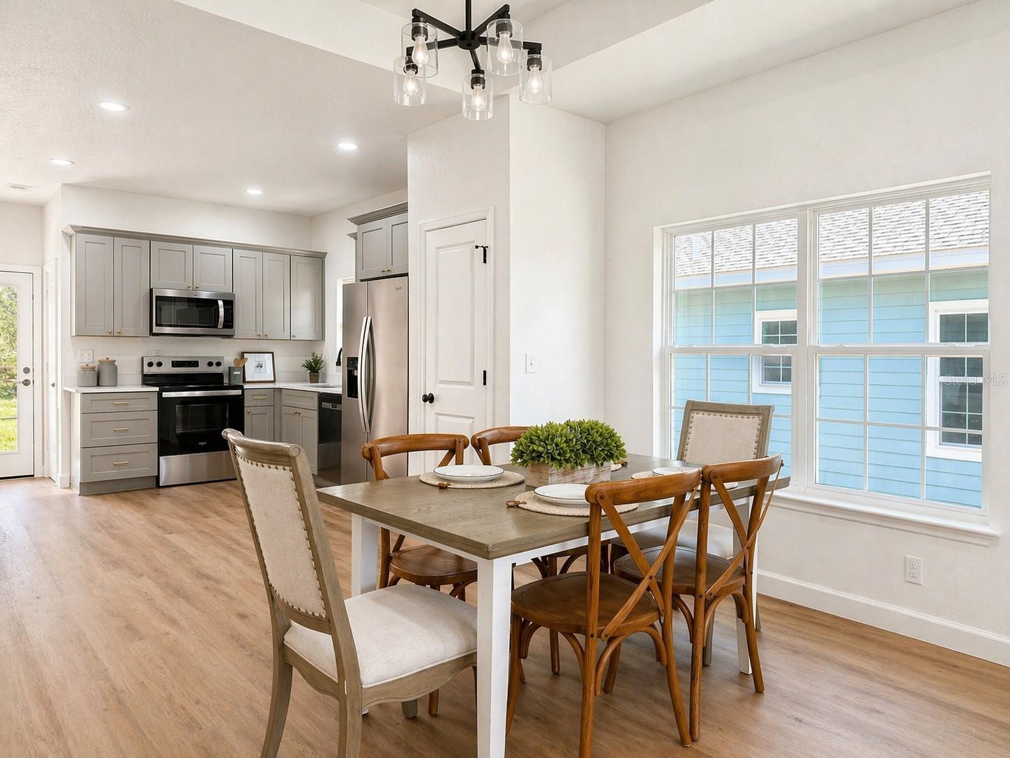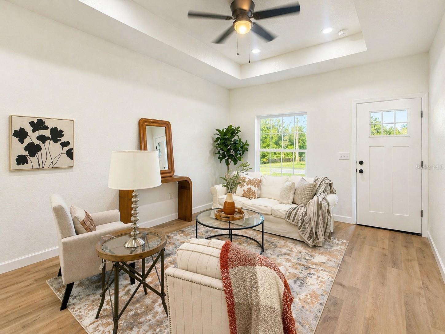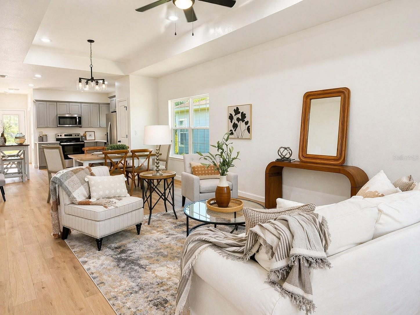 The interior features an open living, dining, and kitchen area with quartz countertops and wood cabinetry throughout. Luxury vinyl plank flooring is installed in all main living areas and bedrooms.
