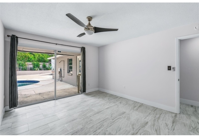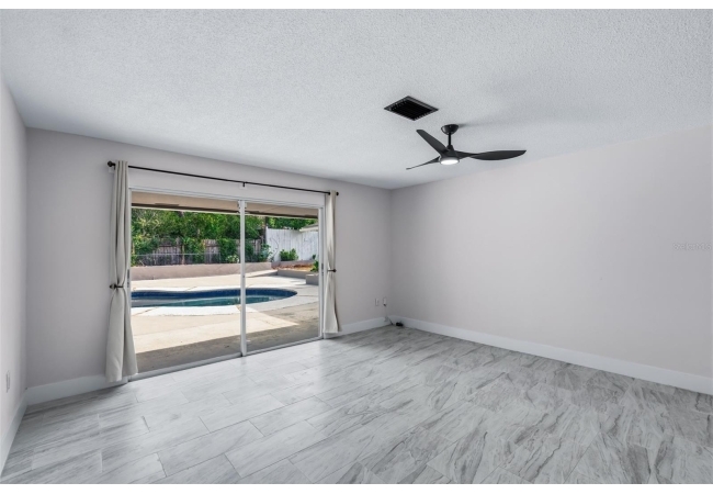 Floor-to-ceiling windows fill the home with natural light and provide serene views of the backyard. Step outside to enjoy a large patio overlooking the pool, along with a second covered patio complete with an outdoor dining area. The fully fenced yard sits on a nearly half-acre corner lot, offering both space and privacy.