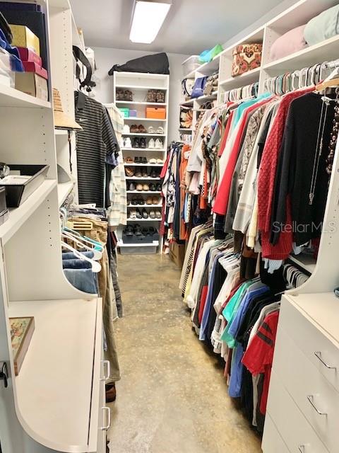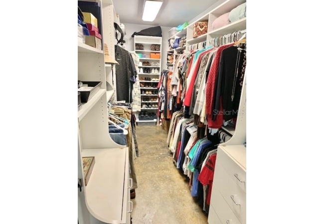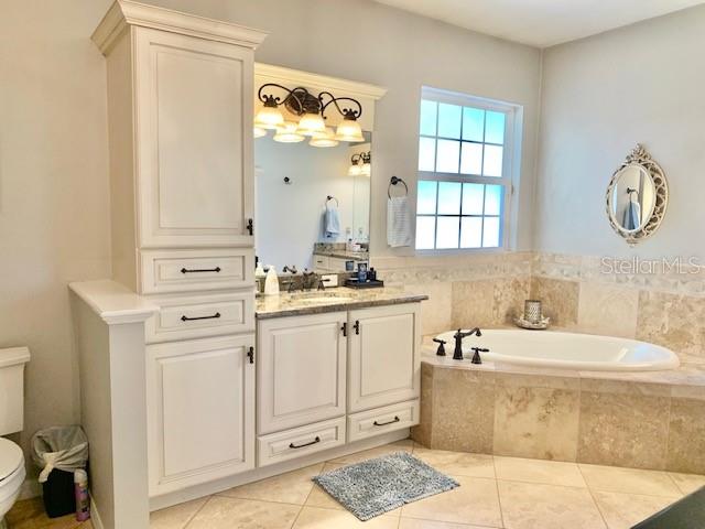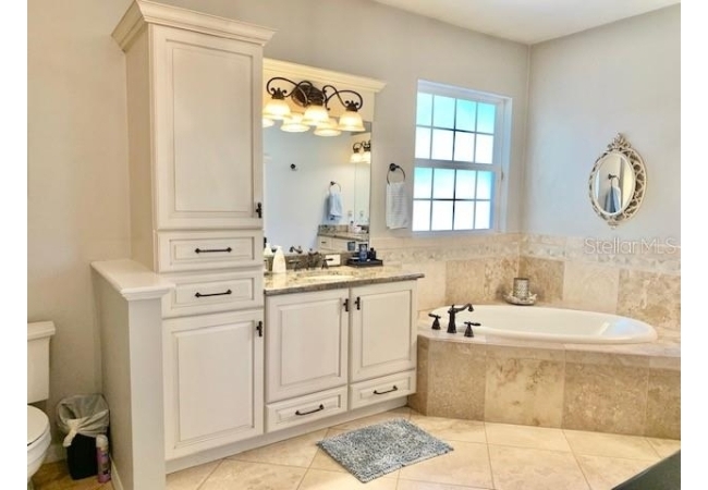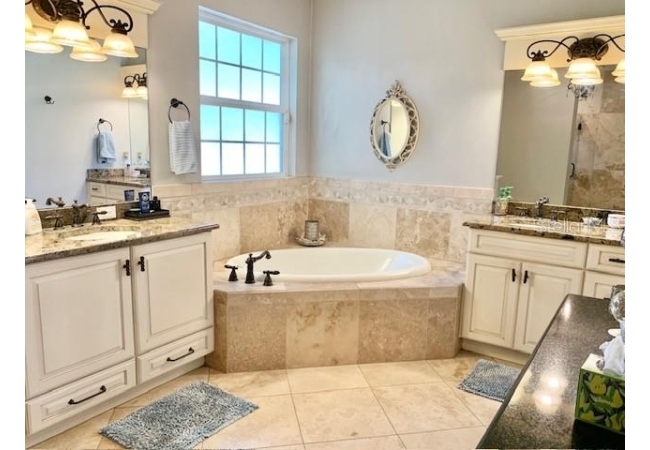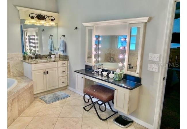 • Luxurious bath with Travertine flooring, dual vanities, a makeup station, jetted tub, and a walk-in shower with multiple shower heads