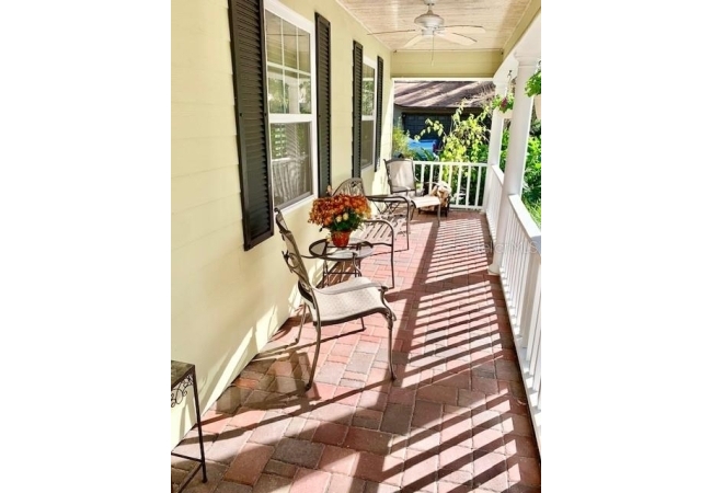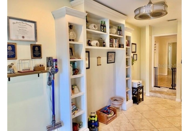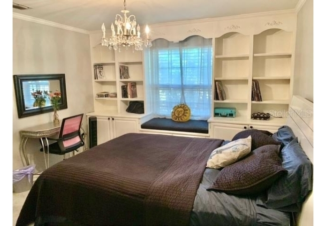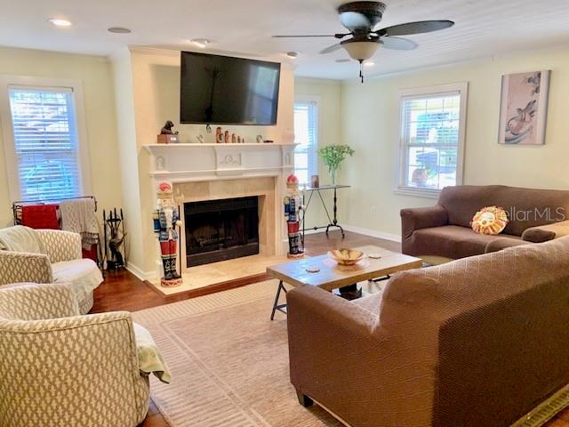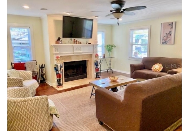 • Family room has hand scraed hardwood floors, crown molding, a wood-burning fireplace, and abundant natural light