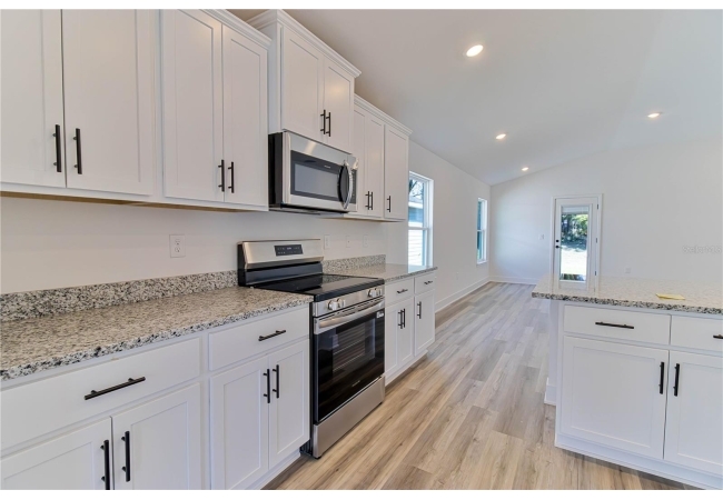 The kitchen and bathrooms include upgraded solid wood cabinets with soft-close doors and drawers, paired with matte black decorative hardware. Granite or quartz countertop options offer both durability and modern appeal.