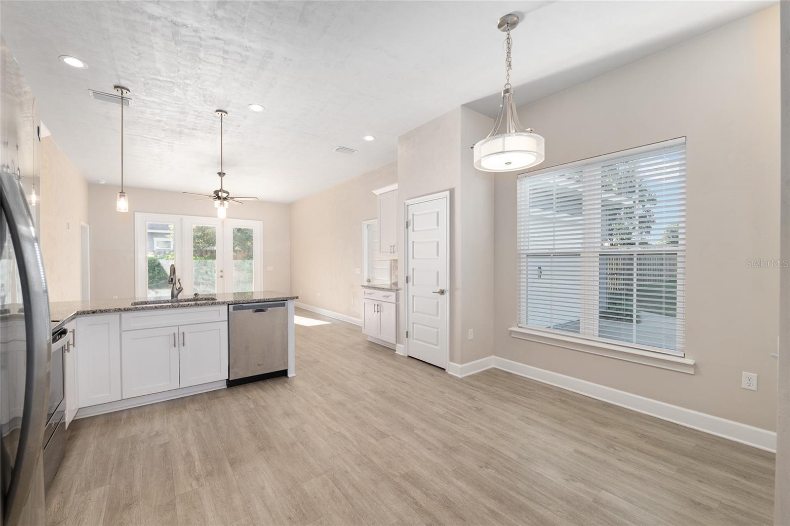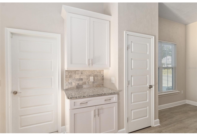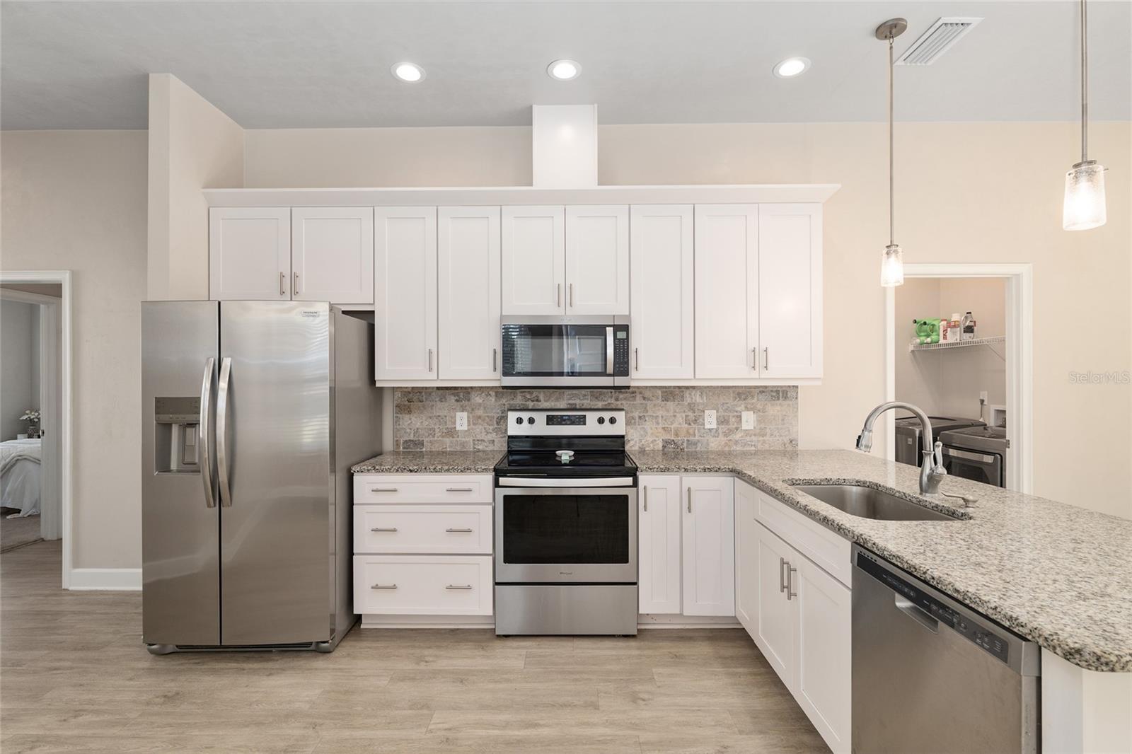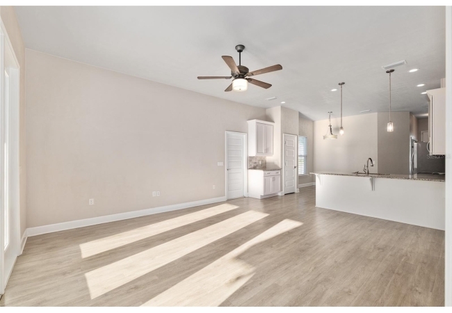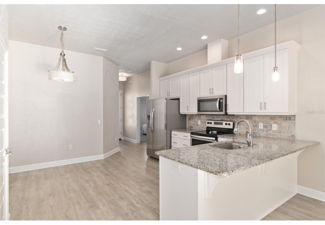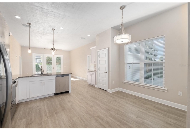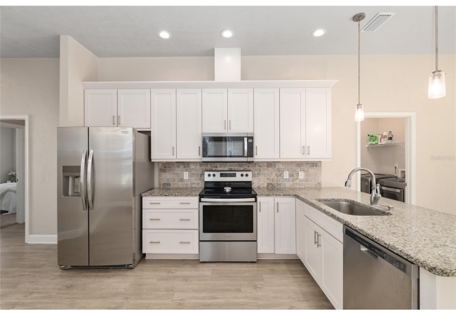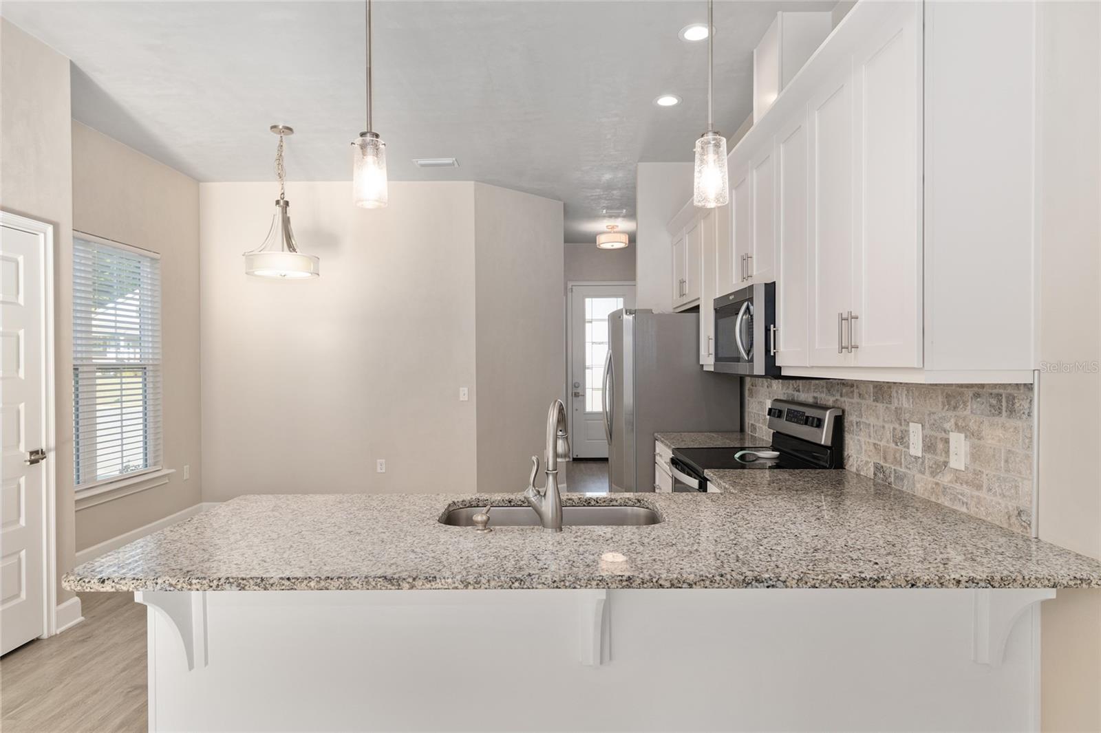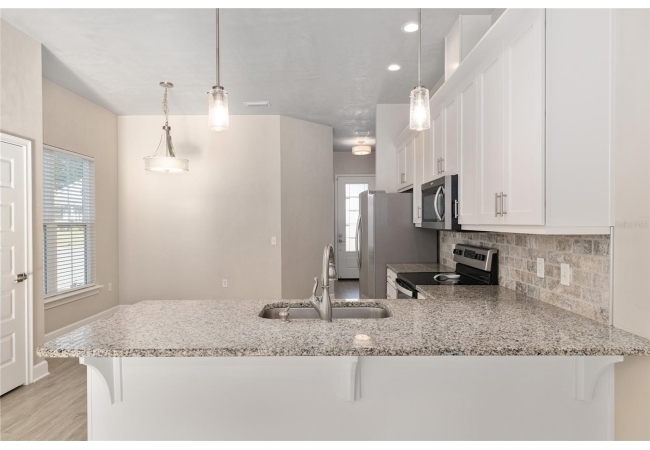 As you walk inside, you’re greeted by 10 foot ceilings and warm wood look flooring, with sunlight spilling into a kitchen that’s truly the heart of the home. Granite countertops, custom cabinetry, and a welcoming bar area set the scene for mornings with coffee or evenings with a glass of wine.