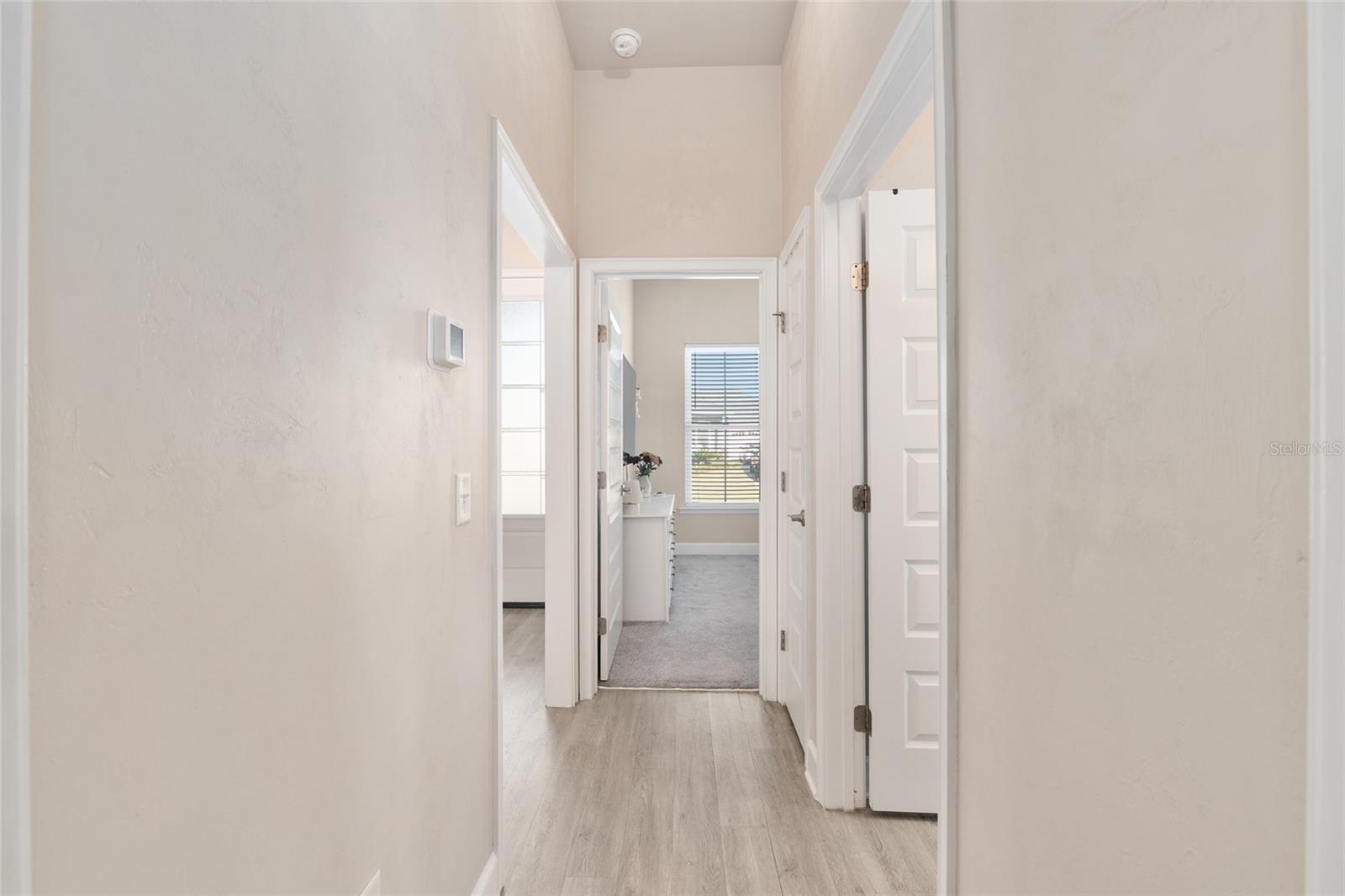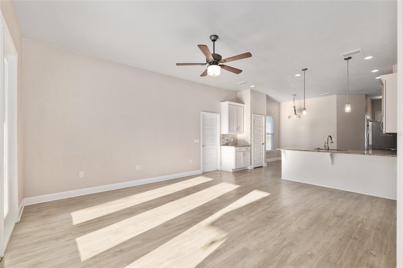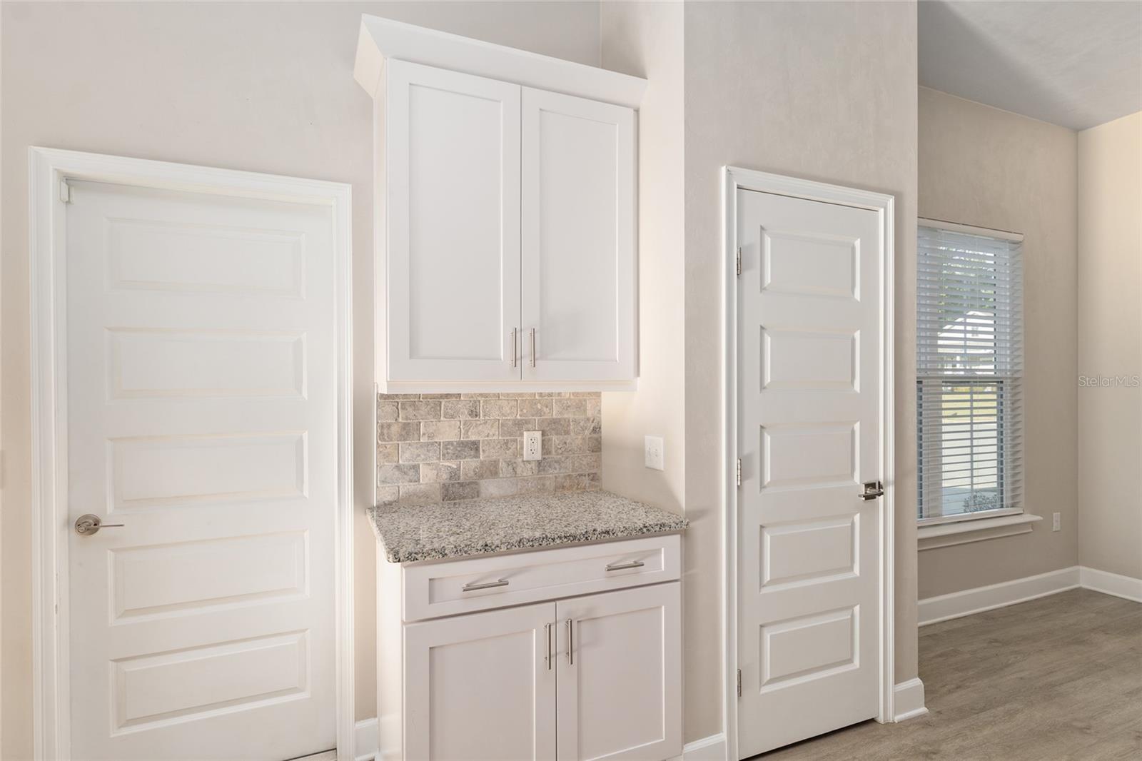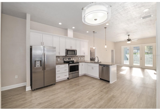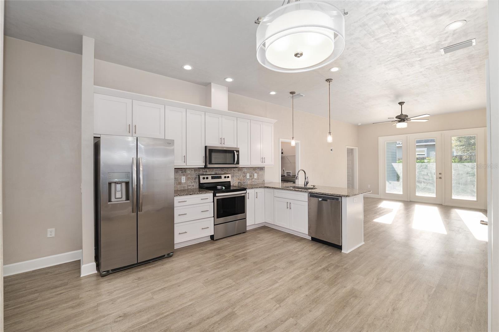 As you walk inside, you’re greeted by 10 foot ceilings and warm wood look flooring, with sunlight spilling into a kitchen that’s truly the heart of the home. Granite countertops, custom cabinetry, and a welcoming bar area set the scene for mornings with coffee or evenings with a glass of wine.