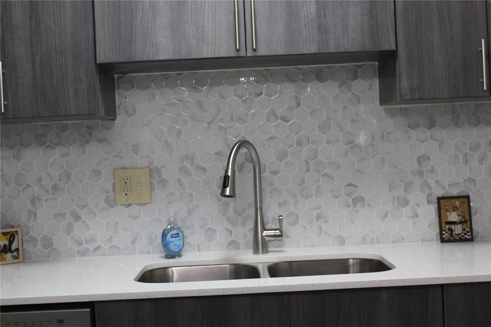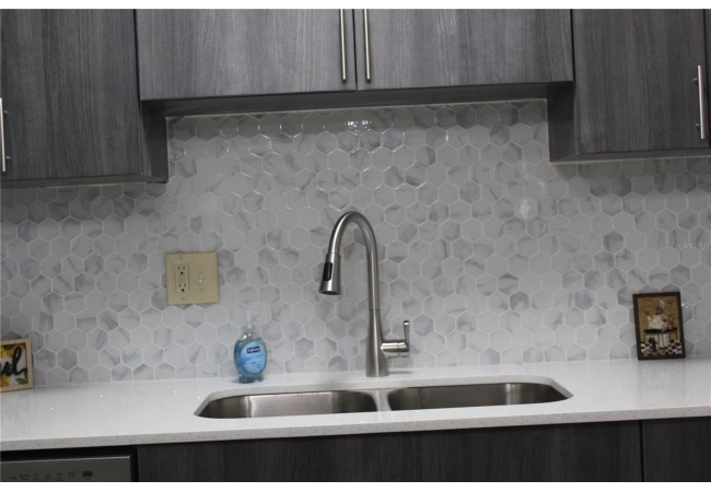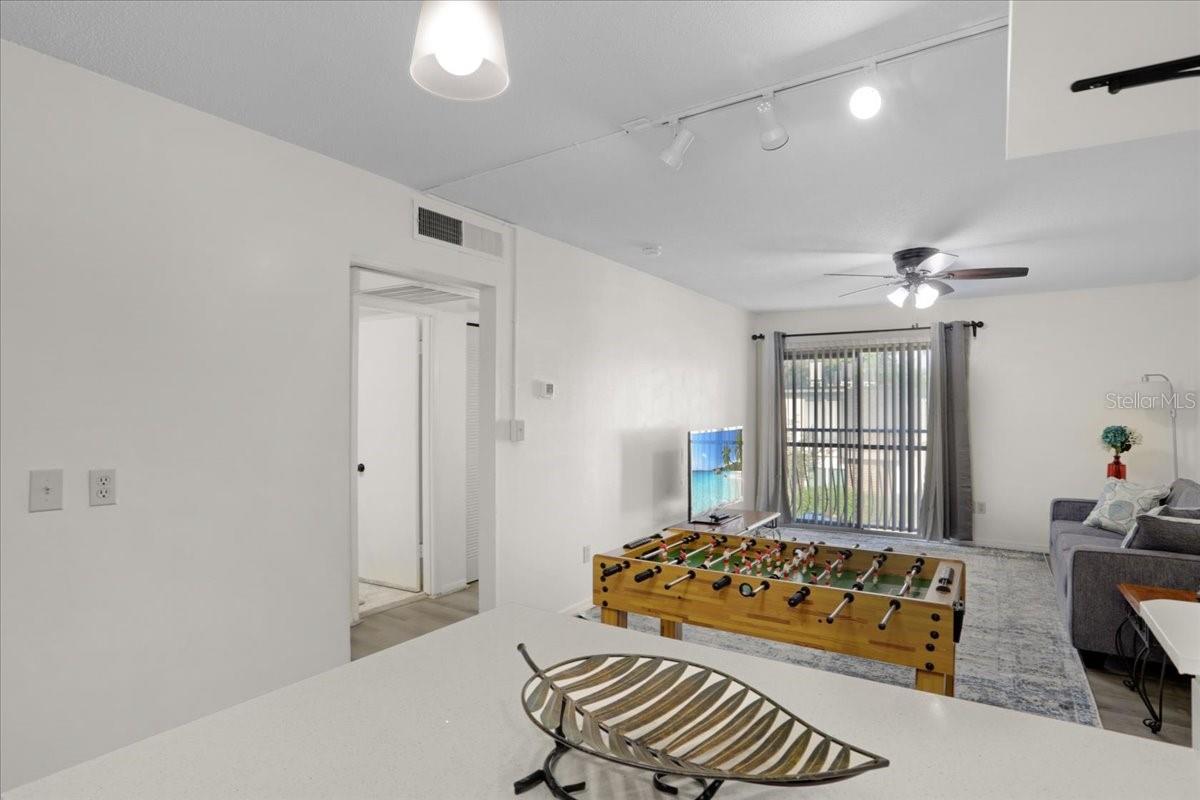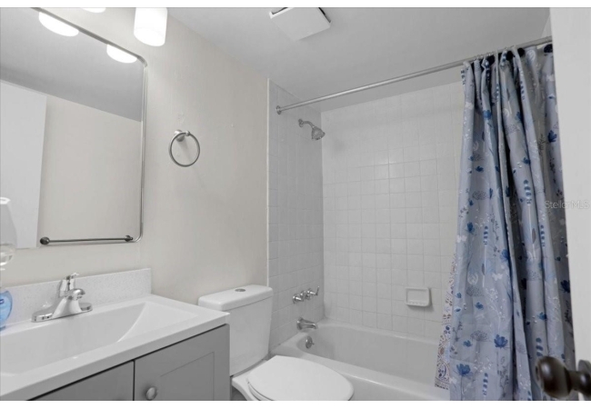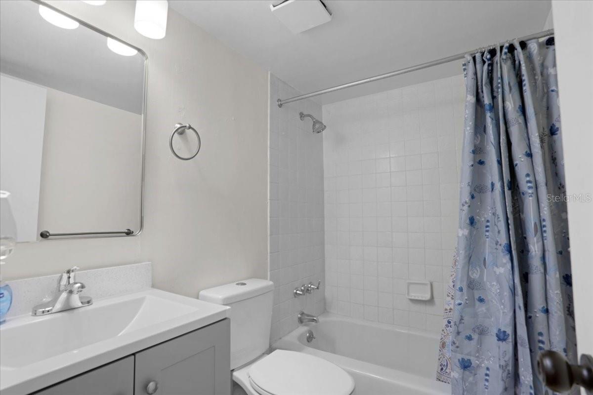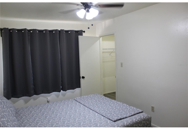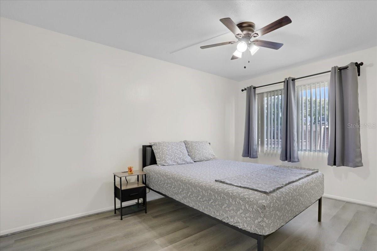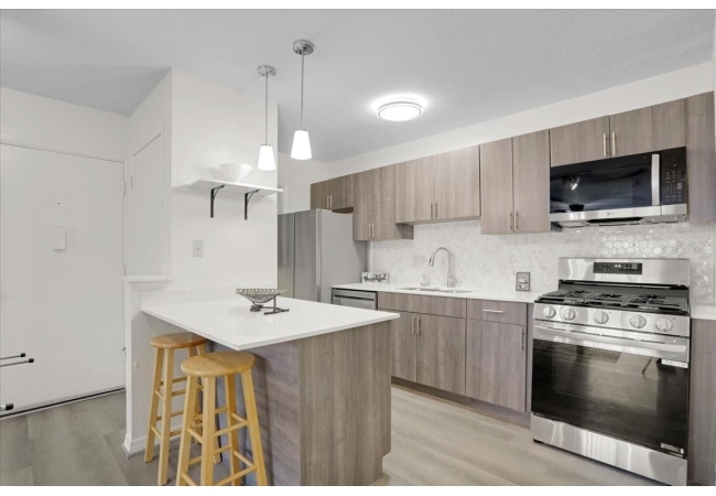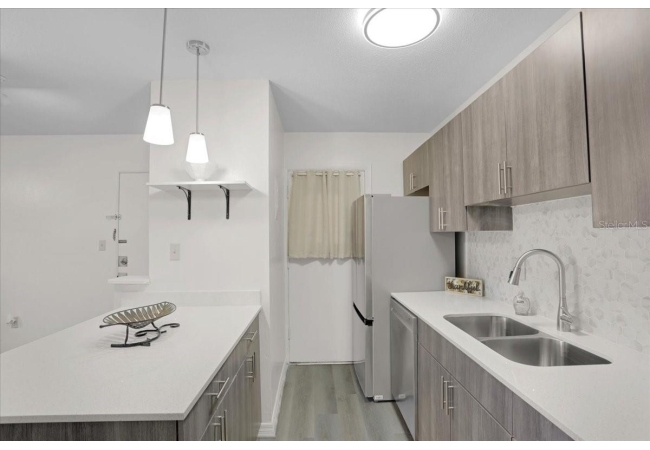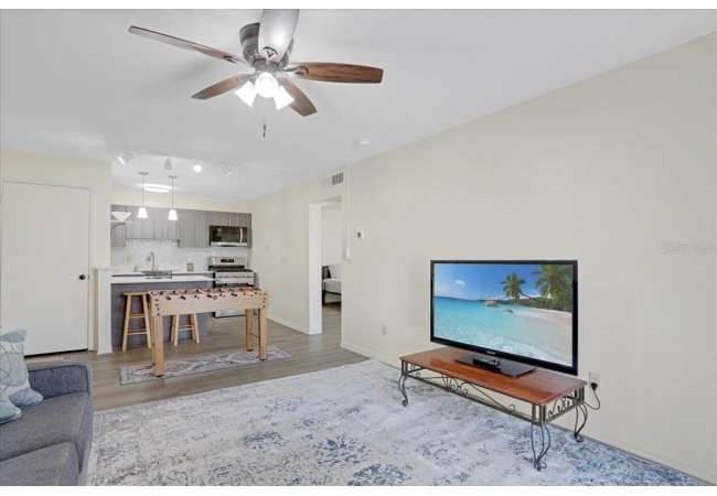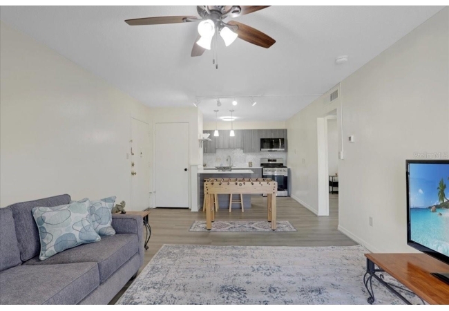 Step inside to find luxury vinyl plank flooring throughout, providing a modern and low-maintenance touch. Fully renovated kitchen is a true highlight, featuring new quartz countertops, brand-new stainless-steel appliances, new sleek cabinetry, and a designer tile backsplash. The open-concept living area feels bright and inviting, enhanced by ceiling fans and natural light. Both bedrooms are generously sized, with one offering a walk-in closet for extra storage. The updated bathroom includes a new vanity, toilet, and shower set, completing the fresh, modern feel of the home.