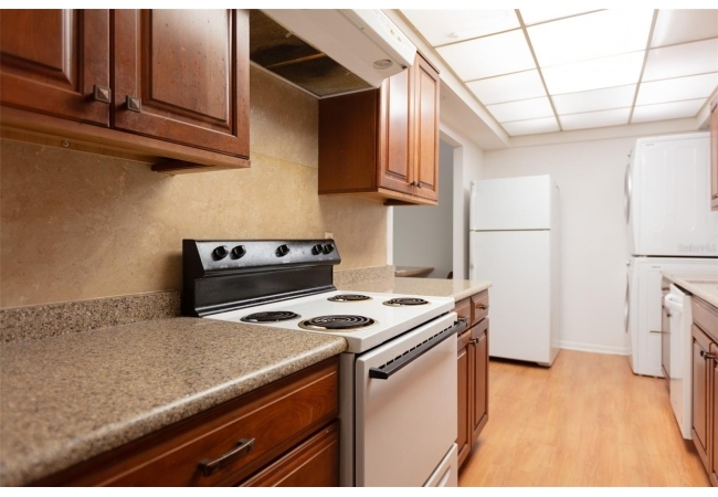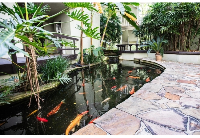 Enjoy a peaceful setting where your private balcony overlooks serene wooded views, with a koi pond right outside your door—a perfect spot to unwind. The open floor plan is flooded with natural light, creating a warm and inviting atmosphere.