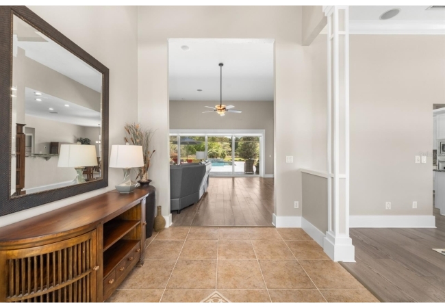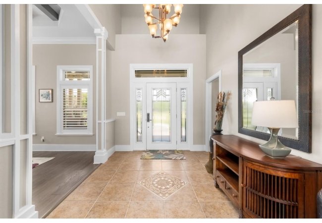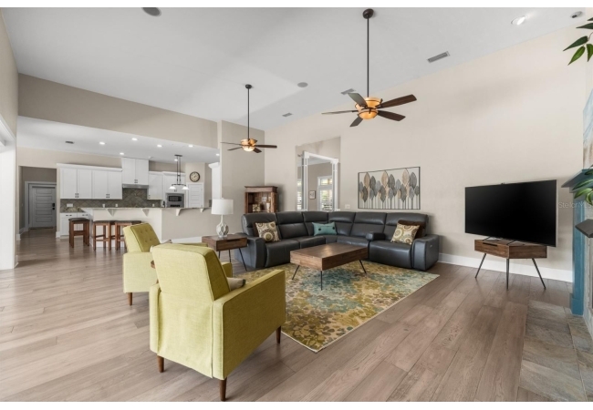 From the moment you enter, you’re captivated by sweeping views of the main living space, highlighted by soaring 20-foot ceilings, a gas fireplace, and a seamless connection to the outdoors. A stunning wall of sliding glass doors fully opens to reveal a resort-style pool area complete with a gas firepit, tranquil waterfall, and a remote-controlled swim machine. The covered patio features a remote-controlled retractable screen, creating the perfect setting for entertaining or relaxed everyday living. This home beautifully blends indoor comfort with outdoor luxury.