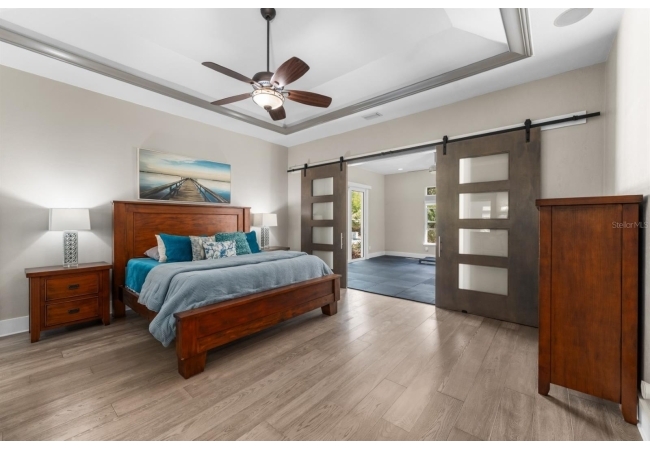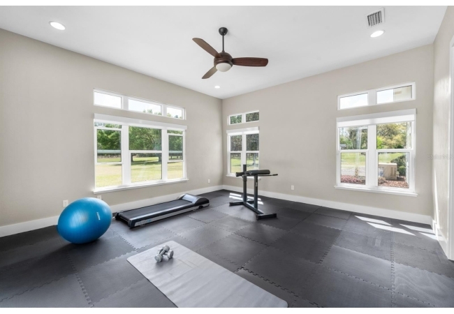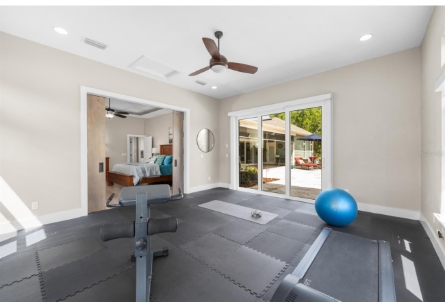 Offering 3,712 square feet of conditioned living space, the home includes 4 bedrooms, 4 bathrooms, a dedicated home gym, and a versatile study or office with private exterior access. The office overlooks a serene zen garden with a water fountain and gazebo, providing a peaceful retreat.