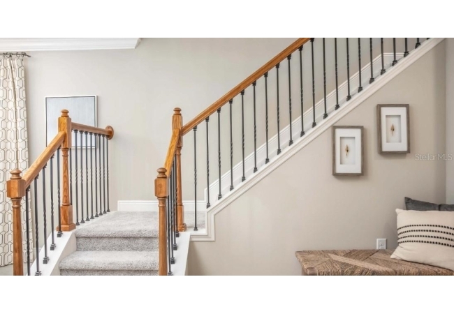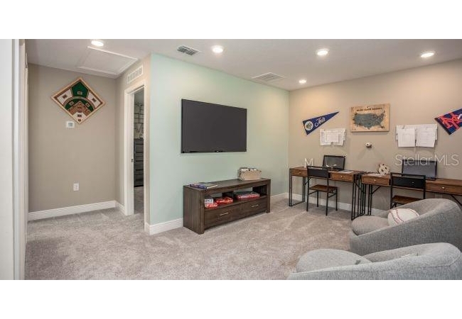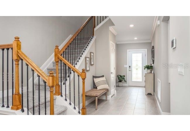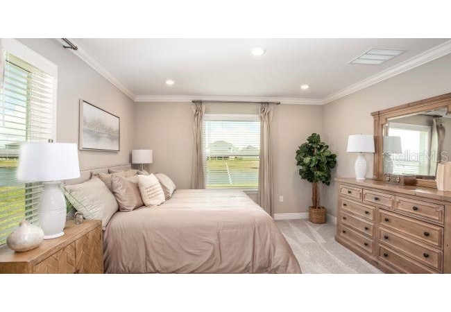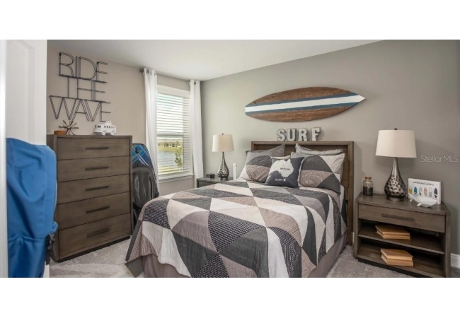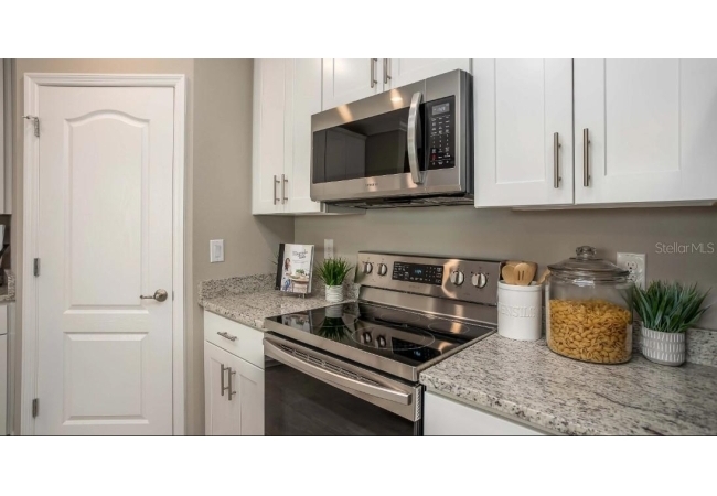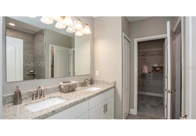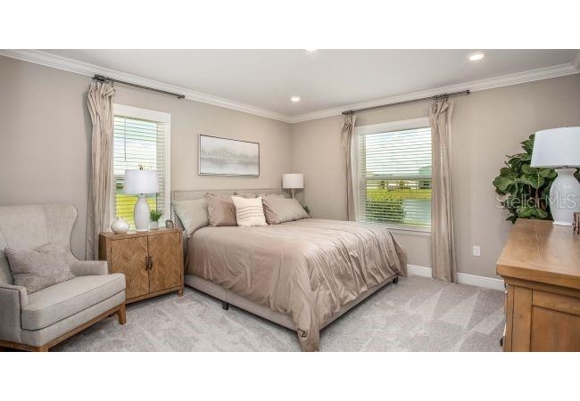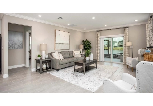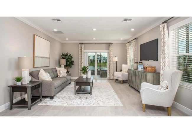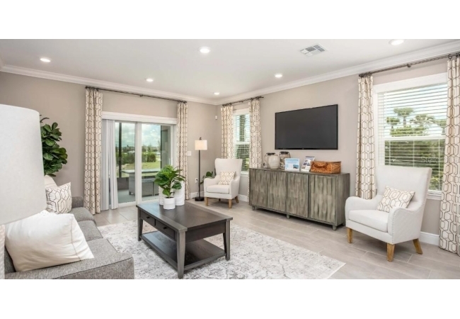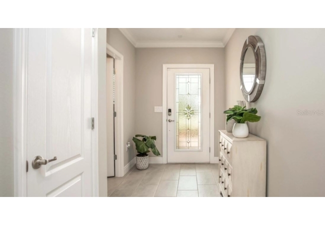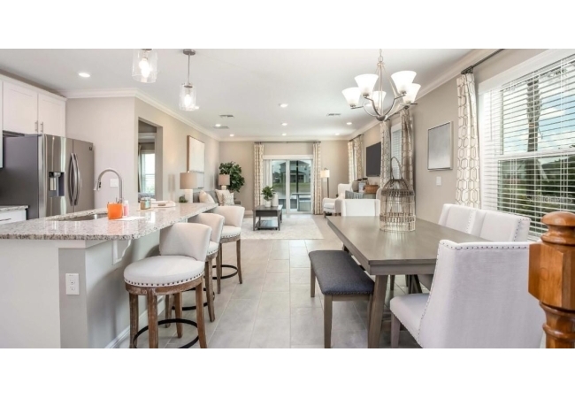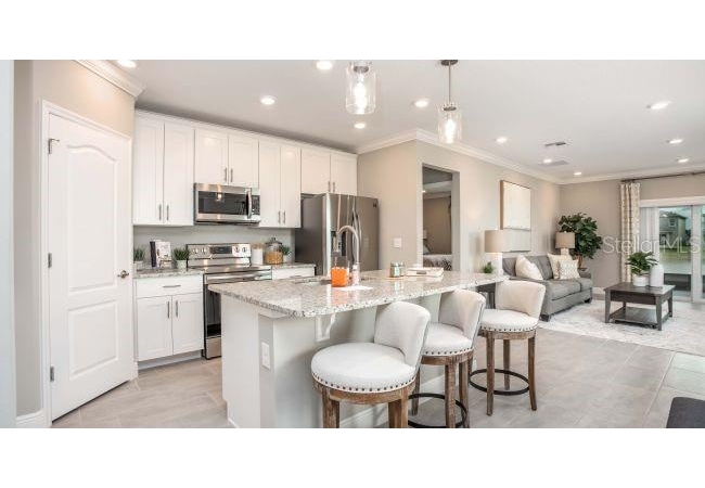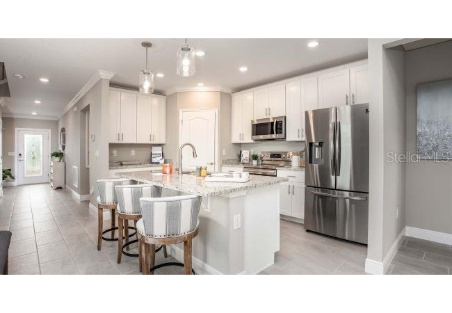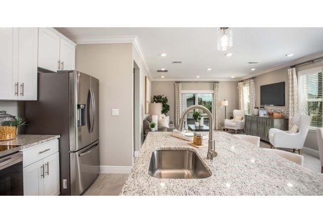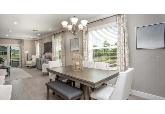 Step through the foyer into a bright, open layout centered around a chef-inspired kitchen featuring a large island, granite countertops, and a walk-in pantry. The dining space, just across from the kitchen, flows seamlessly into the great room, enhanced by additional lighting that brightens the entire space. Sliding patio doors off the great room open to a screened patio, perfect for enjoying Florida’s indoor-outdoor lifestyle.