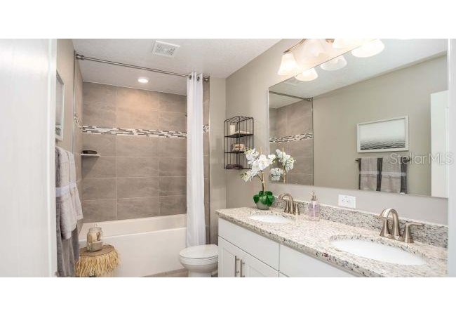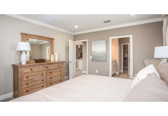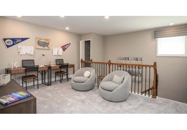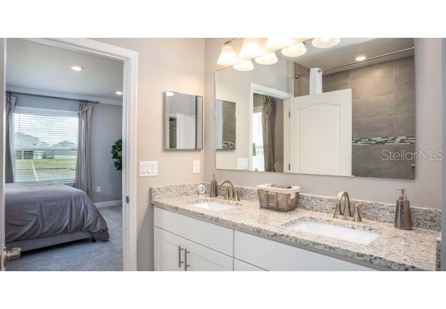 The first-floor primary suite offers a private retreat with a spa-inspired en-suite bath, complete with dual vanities, a large walk-in shower, and a primary shower enclosure. Upstairs, a sleek handrail staircase leads to a spacious loft and three additional bedrooms, each generously sized and sharing a secondary bath with dual sinks and a tile shower/tub combo.