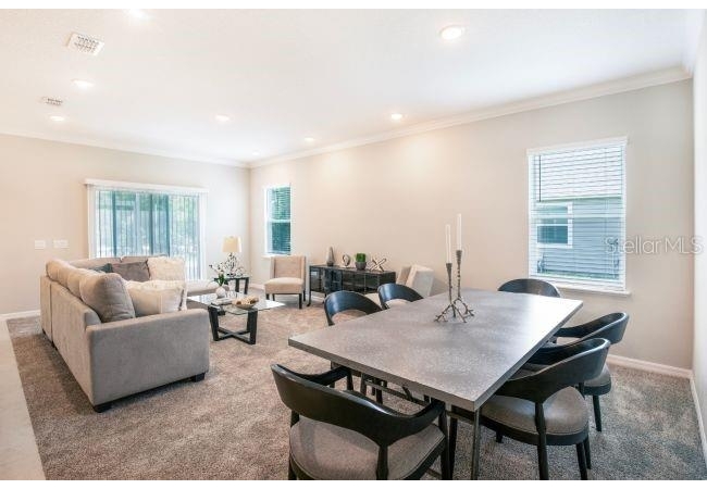 A covered front porch creates a welcoming arrival and opens into a bright foyer with 9’ ceilings that enhance the sense of space throughout the home. The open gathering area is filled with natural light from an additional window and illuminated by six flush mount LED lights, creating a warm and inviting atmosphere. Ceramic tile flooring extends throughout the entire home, offering durability and a clean, cohesive finish.