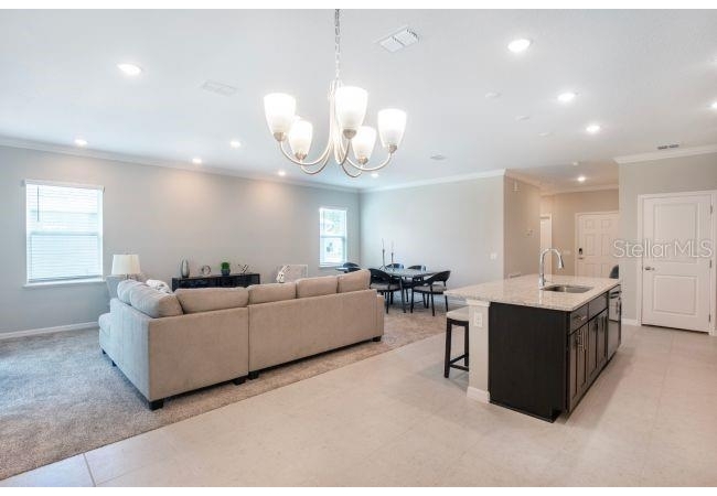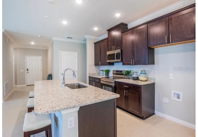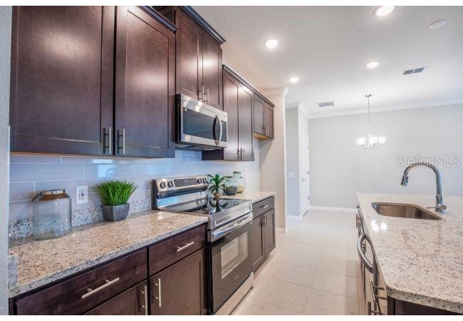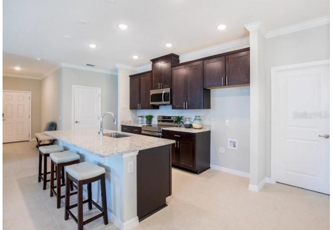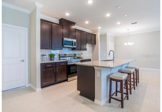 The kitchen stands out with granite countertops, upgraded cabinetry, and a spacious island with extra seating, all arranged in a highly functional layout that connects seamlessly to the dining areas and breakfast nook. Secondary bedrooms are thoughtfully positioned to provide privacy and flexibility within the layout.
