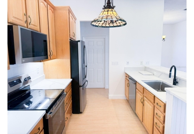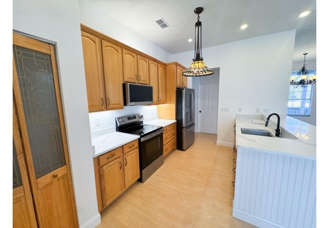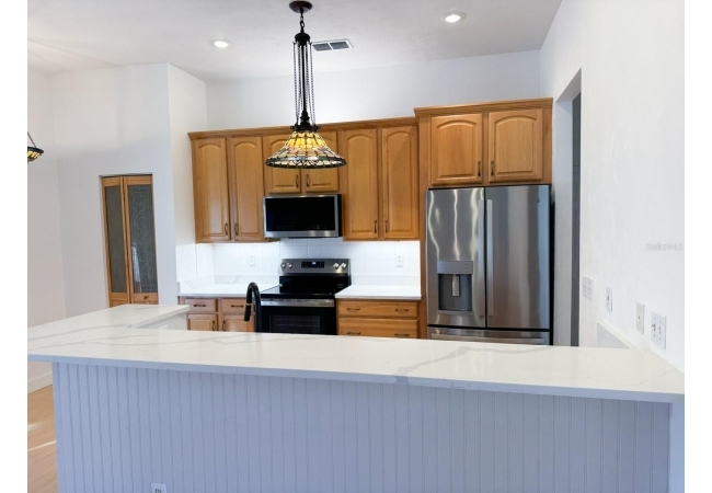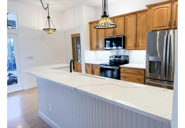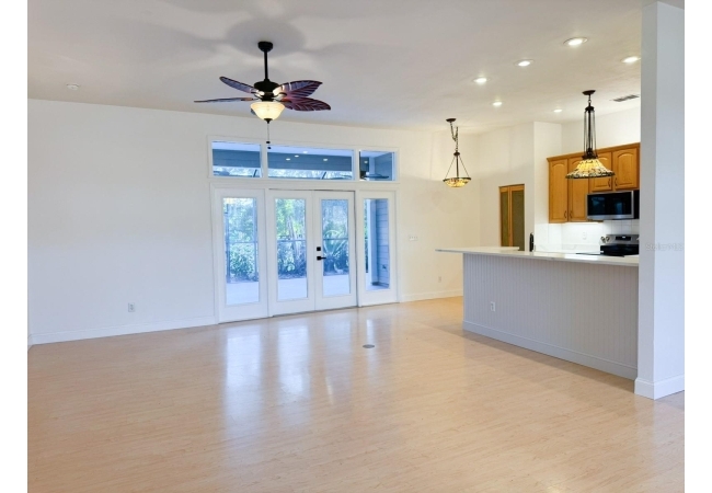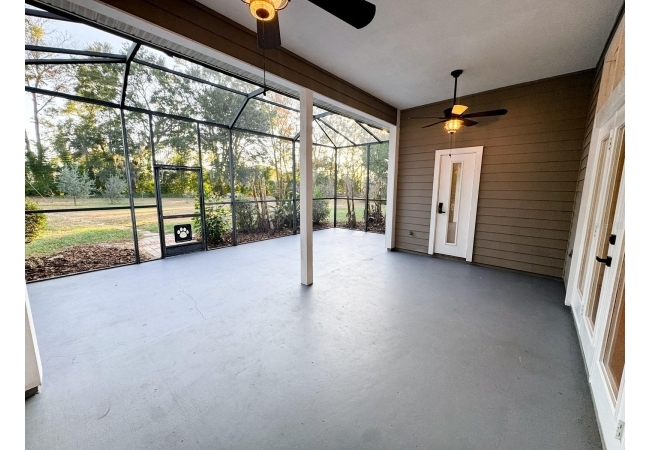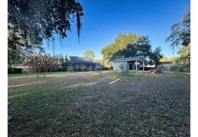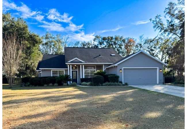Beautiful 4-bedroom, 3-bathroom home with office/den on just over 1 acre, offering privacy, space, and thoughtful updates throughout. The open floor plan seamlessly connects the kitchen, living room, and dining area, all under high ceilings that enhance the bright, airy feel. The kitchen features real oak cabinets, brand-new quartz countertops, and a brand-new range and refrigerator—perfect for everyday living and entertaining. French doors lead to the back porch, where you’ll find a covered area with two ceiling fans and an additional screened-in porch, giving you multiple options for enjoying the outdoors. The office/den is a versatile space with custom built-in shelving and a cozy gas fireplace, ideal for working from home or relaxing. The oversized primary suite offers two walk-in closets, a jetted tub, and a walk-in shower, creating a comfortable retreat. All bedrooms and the office/den have brand-new carpeting. The home has a 2-car garage that includes a water softener and RV hookup. The backyard is fully fenced and offers a large workshop for projects, storage, or additional toys and equipment. This area provides plenty of room to roam and includes olive, peach, banana, and fig trees—adding charm, shade, and seasonal harvests. With mature trees and lots of privacy, this property offers a peaceful setting while still providing all the modern comforts of home. The roof is approximately 5 years old, providing added peace of mind. Additional features include a separate laundry room, irrigation system, and a large walk around attic. This home is located 5 minutes to downtown Alachua and 15 minutes to Gainesville.