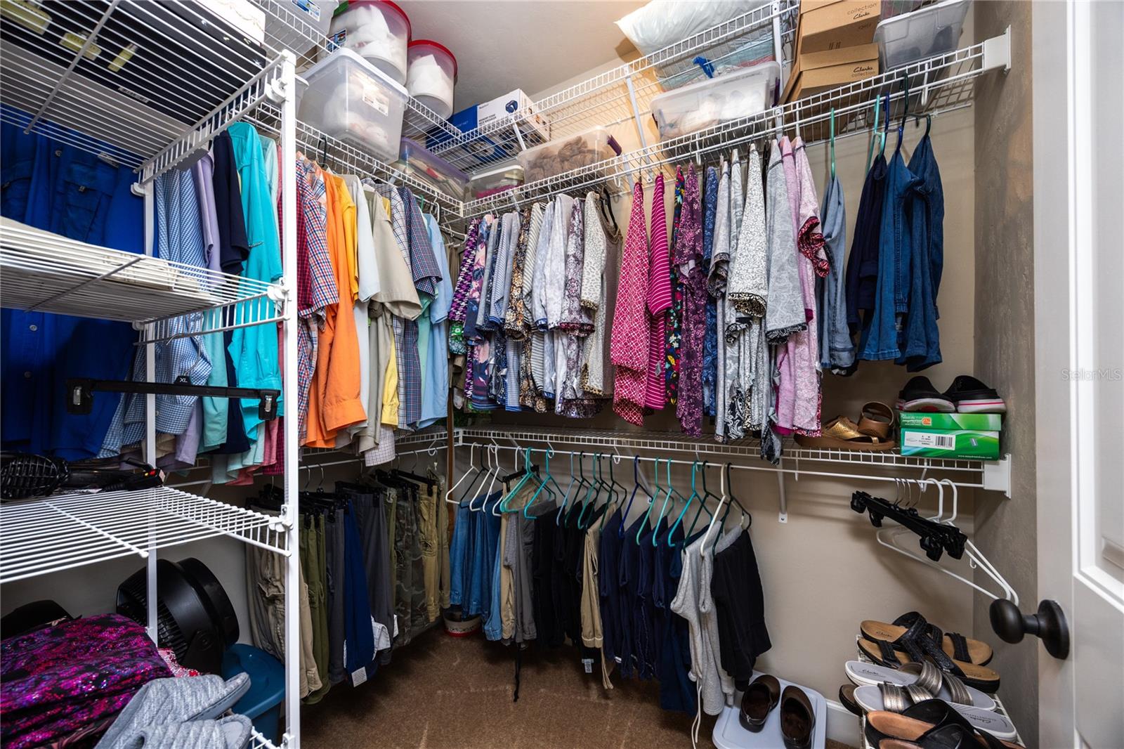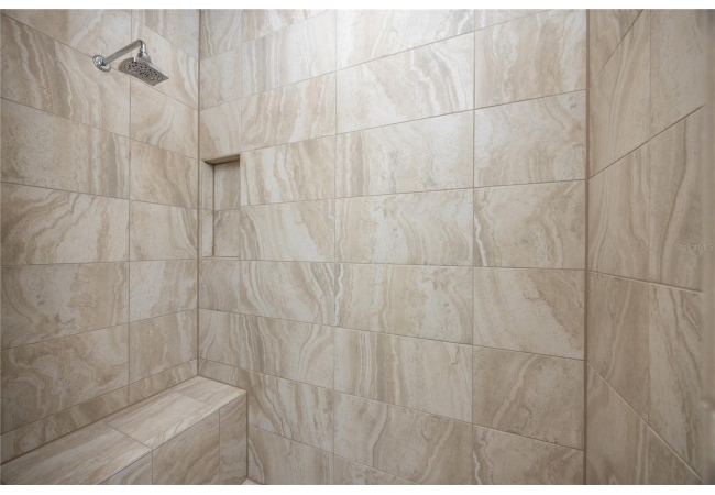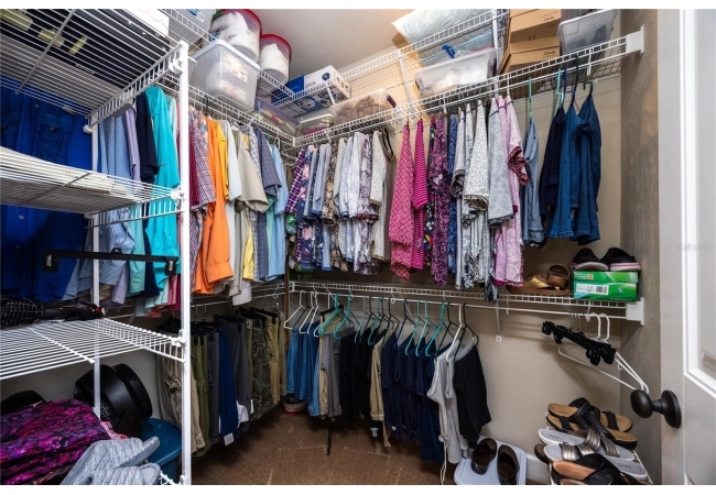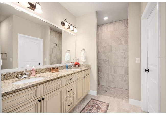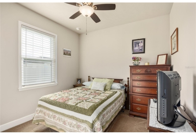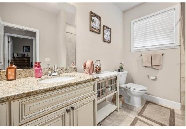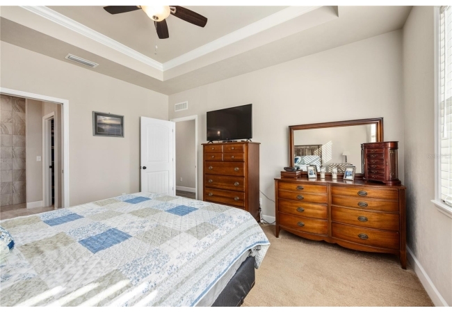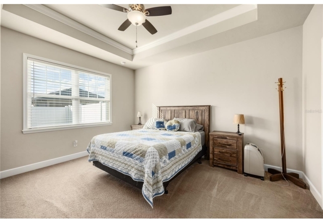The private primary suite includes a tray ceiling, a walk-in closet with custom shelving, and a luxurious tiled shower. A split floor plan offers privacy for the secondary bedroom and bath, ideal for guests or a home office.