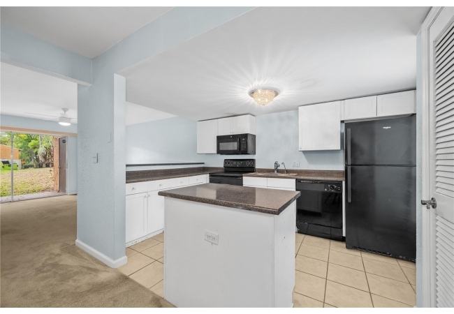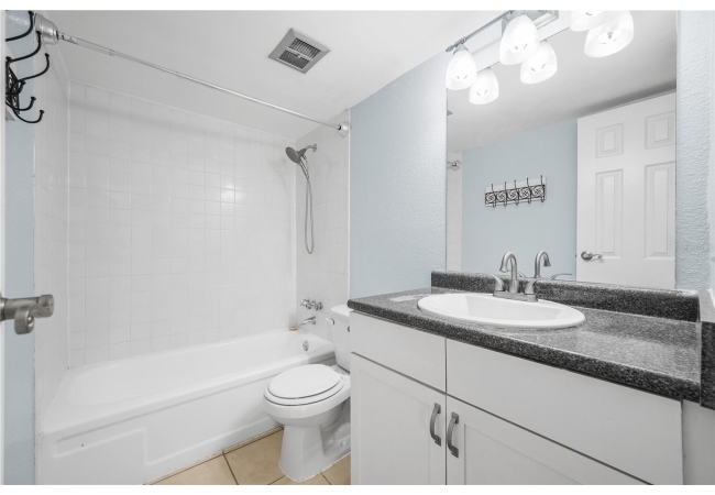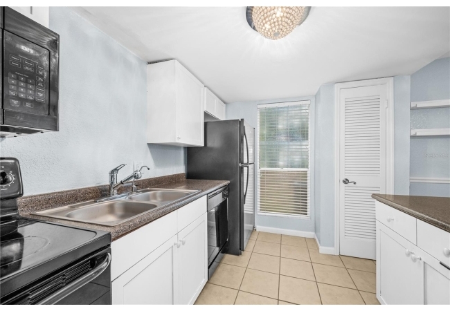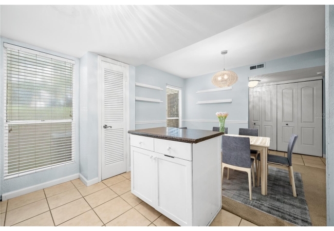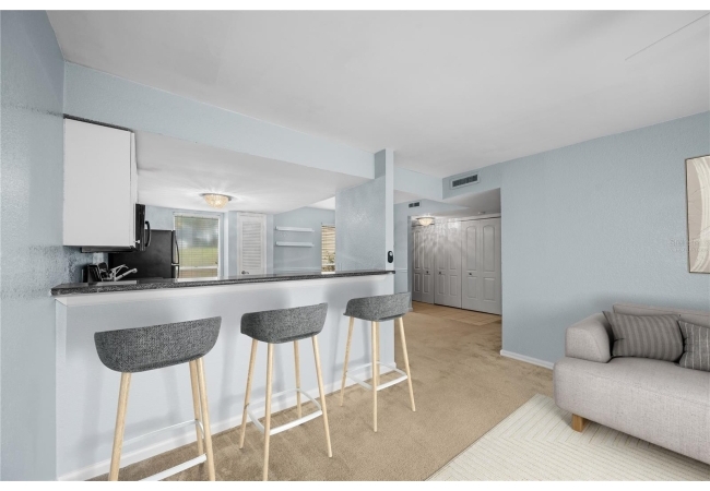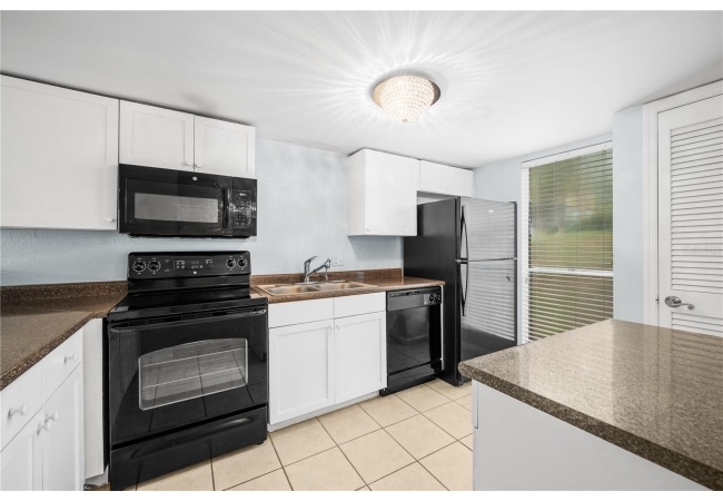 This unit features large bedrooms with walk-in closets, an open kitchen with granite countertops, a center island, and breakfast bar, and new modern ceiling fixtures throughout the entire condo, creating a clean, updated feel. Additional highlights include a laundry closet with an included washer and dryer, and a covered patio with a large storage closet.