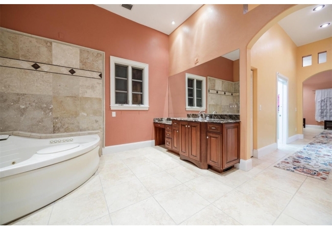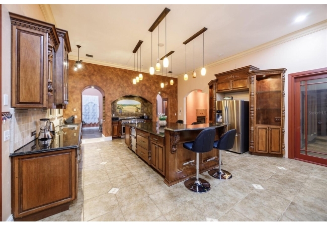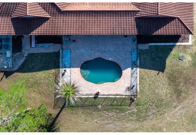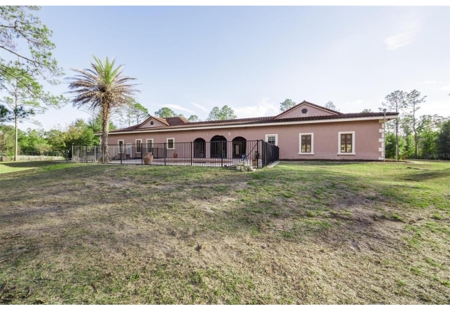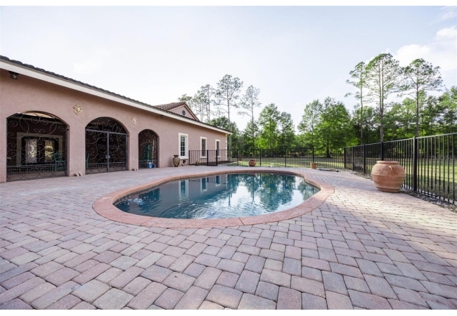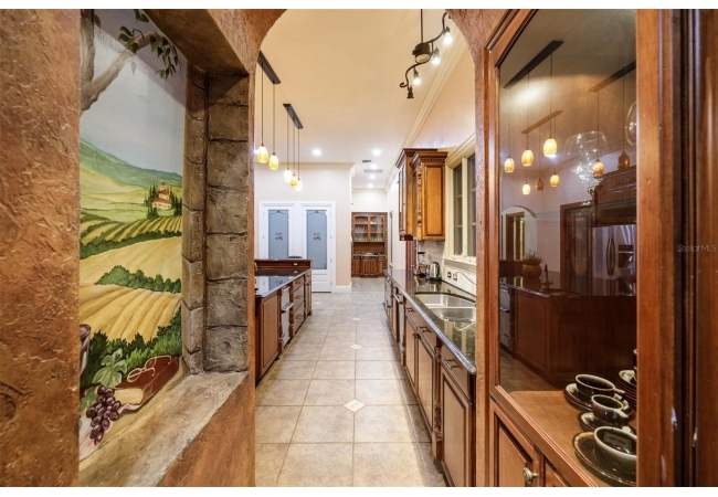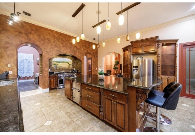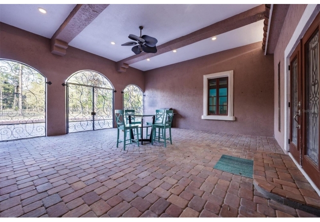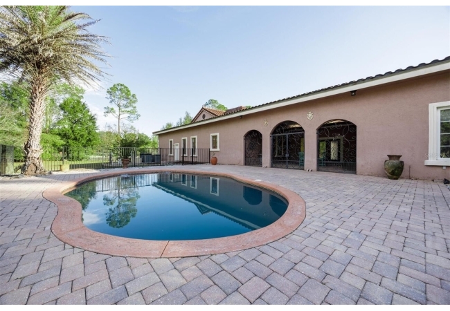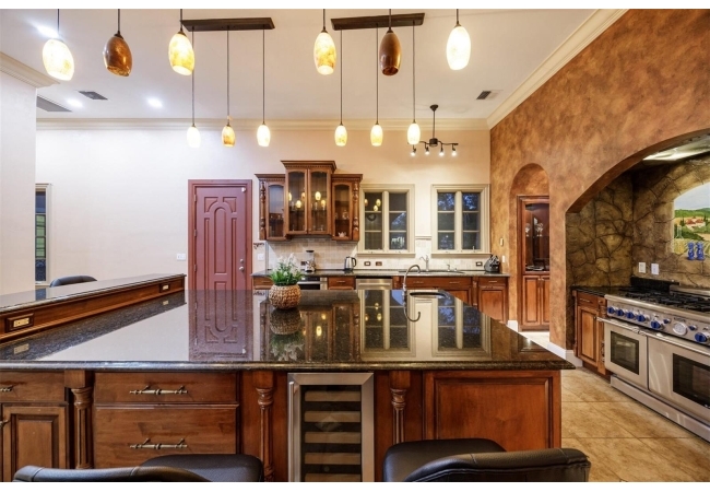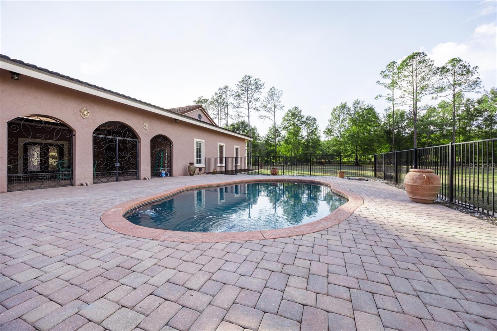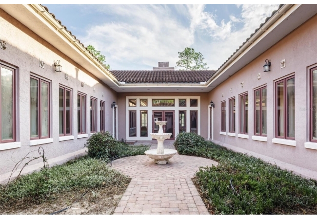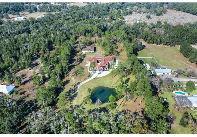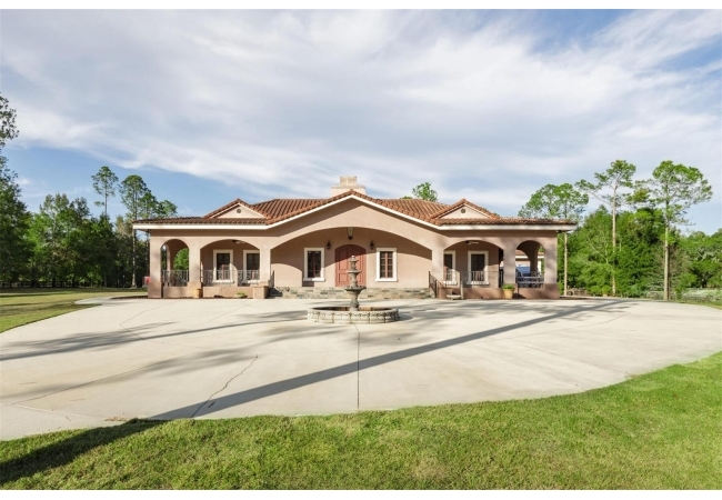 Extraordinary Mediterranean Revival estate set on 10 private acres, offering timeless architecture and refined craftsmanship. This over-7,000 sq ft residence welcomes you through a sweeping motor court with fountain, framed by classic stucco, clay barrel tile roofing, and deep arched loggias.The interior features expansive living spaces with soaring ceilings, stone flooring, rich wood accents, and abundant natural light with serene courtyard views. The chef’s kitchen is designed for entertaining with custom cabinetry, an oversized island with seating, and striking pendant lighting. The primary suite is a private retreat with tray ceilings, a spa-inspired bath featuring dual vanities, a jetted soaking tub, and an oversized walk-in shower with rain head and multiple body sprays. Multiple custom walk-in closets with built-in cabinetry provide exceptional storage. Library, 3 car garage, and outdoor kitchen all add versatility to this unique property. Other outdoor amenities include an in-ground pool and a tranquil meditation pond, enhancing the property’s resort-like feel. A separate approx. 1,800 sq ft guest house, along with horse stables and paddocks, completes this equestrian-ready estate—ideal for multi-generational living, guests, or staff. A rare offering combining architectural integrity, privacy, and lifestyle versatility.