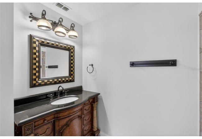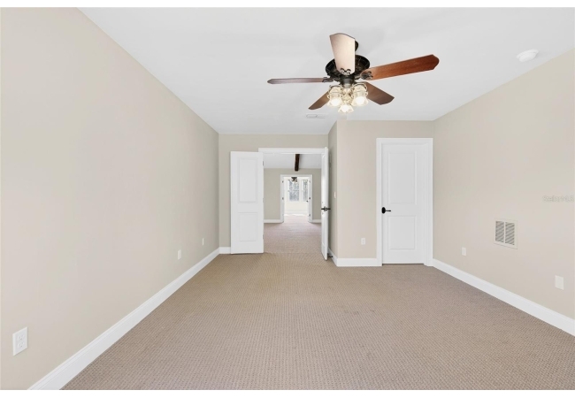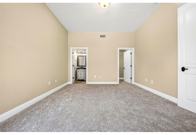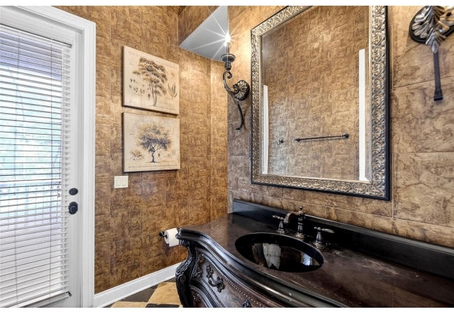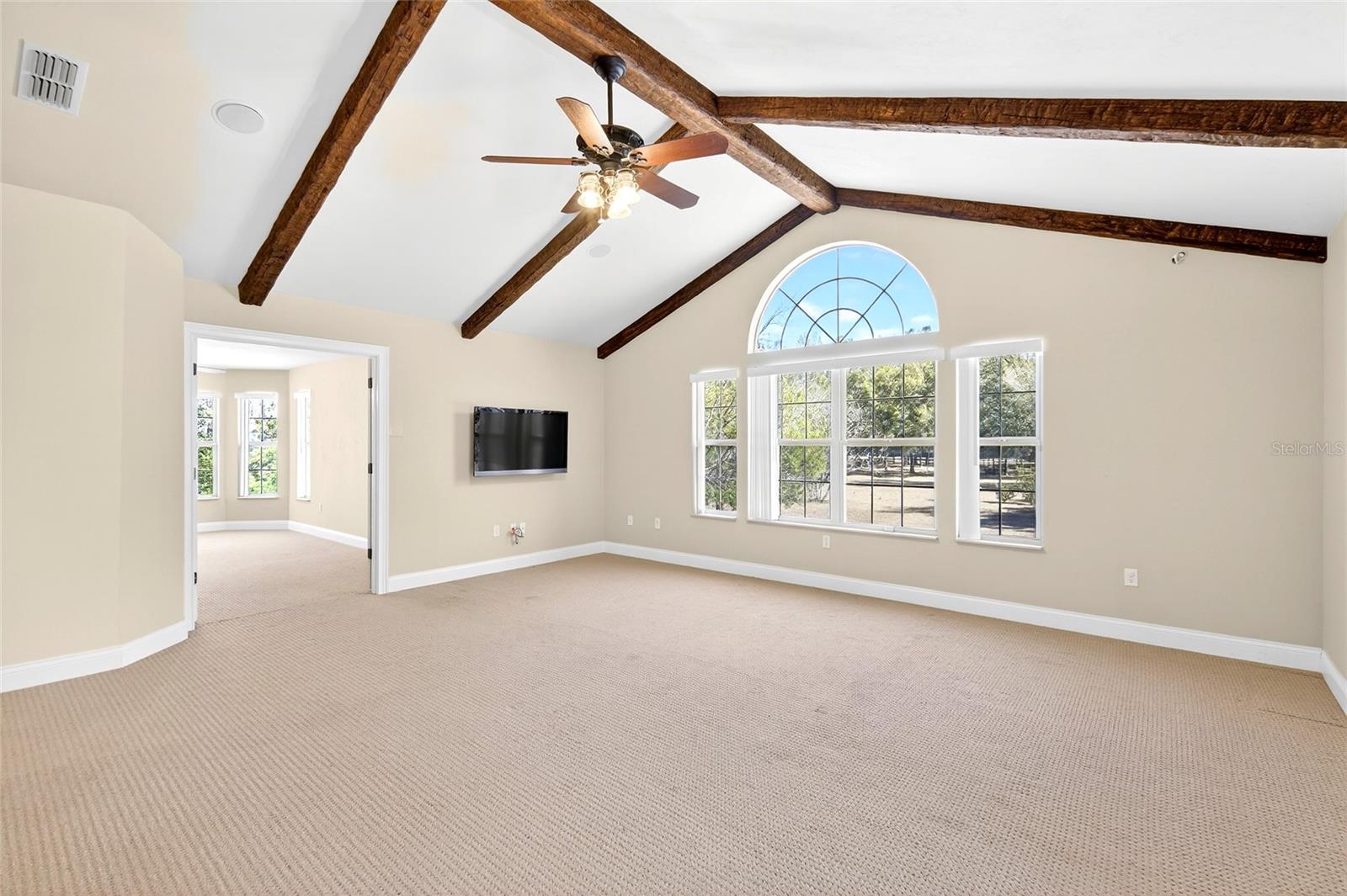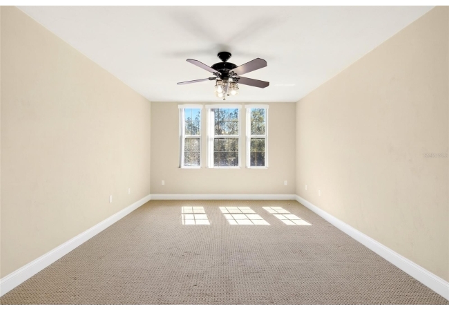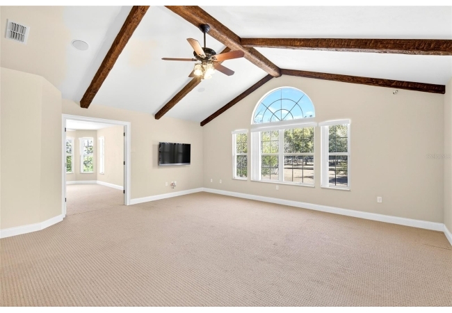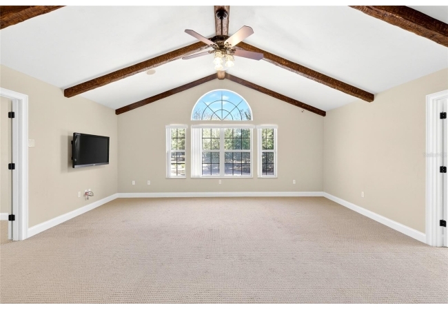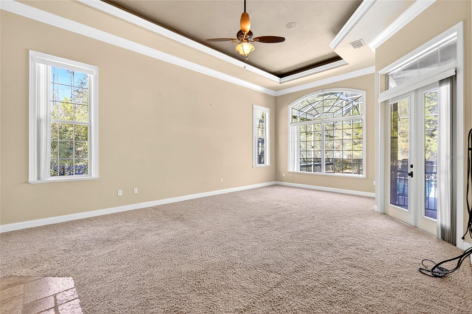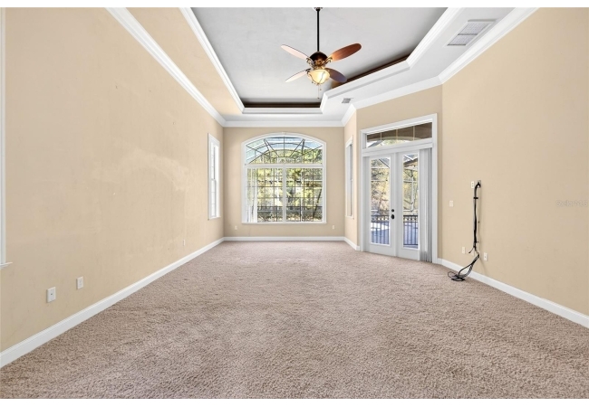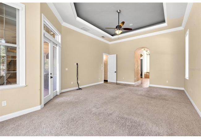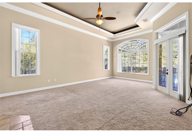 Privately positioned, the primary suite is a true retreat. Tray ceilings, French doors opening directly to the pool deck, and expansive windows overlooking the acreage create a peaceful sanctuary. The spa-like bath features dual vanities, a walk-in sunken shower, and generous his-and-hers closets.