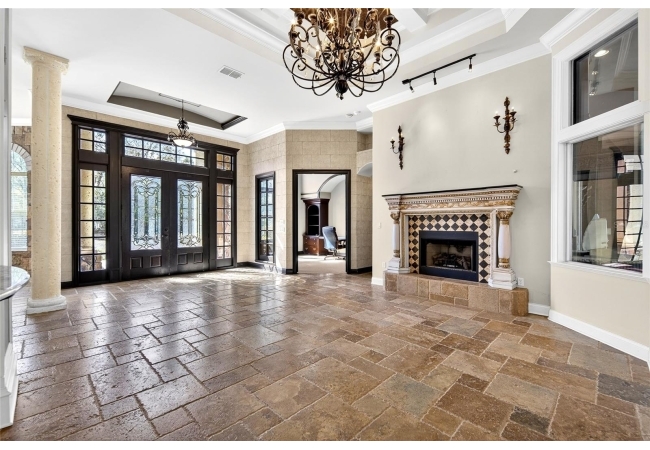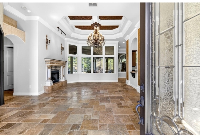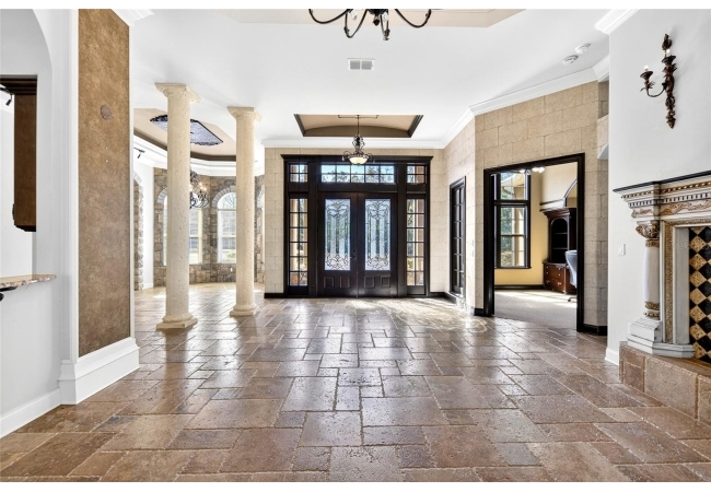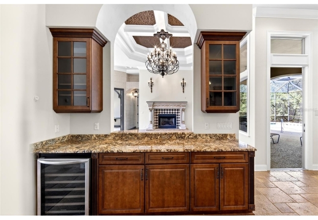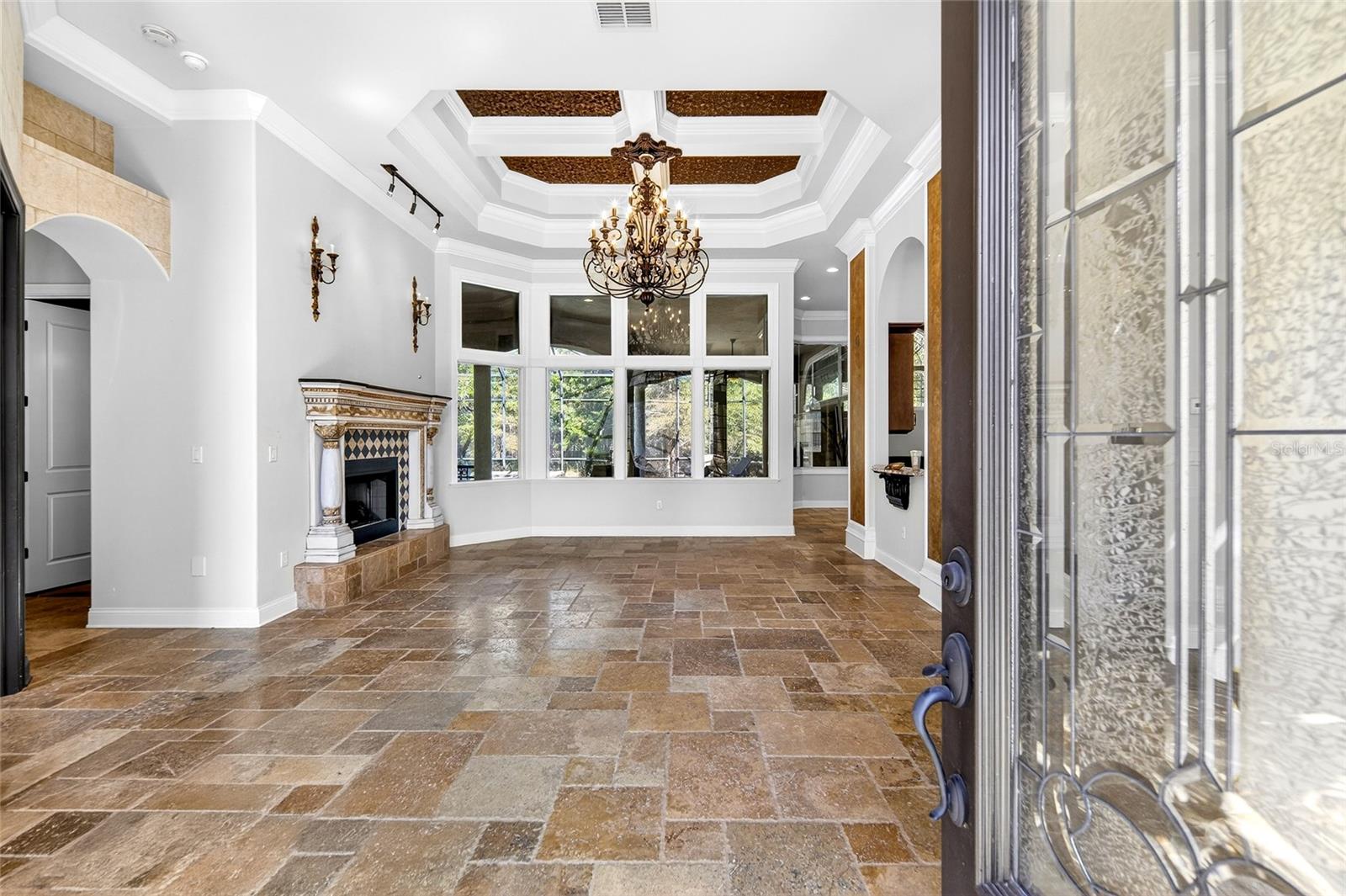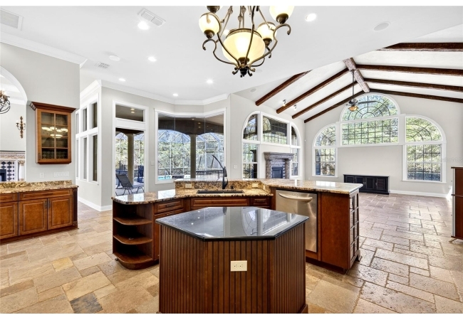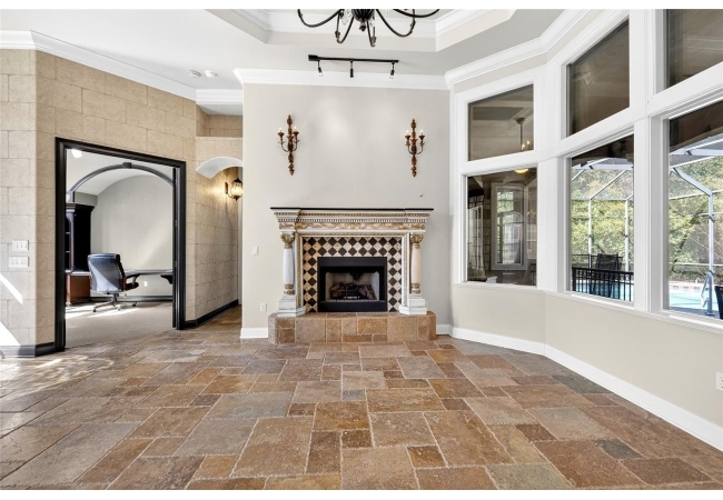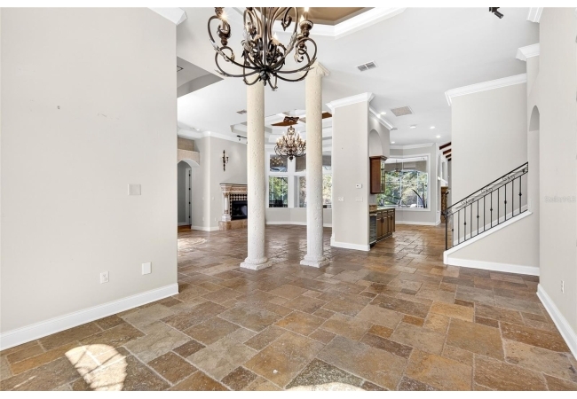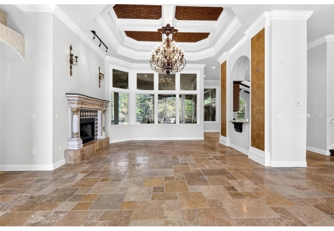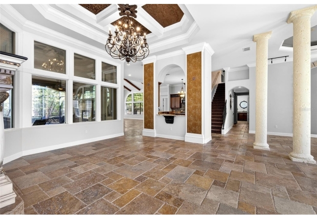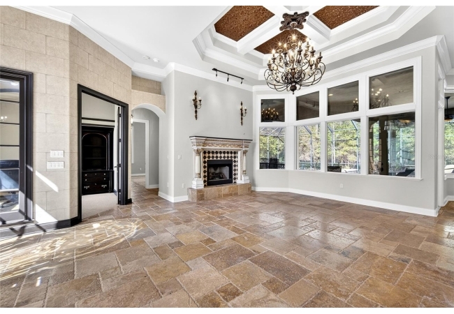 From the moment the double doors open, the home makes an unforgettable impression. Travertine floors stretch across expansive living spaces framed by soaring ceilings, decorative columns, and intricate coffered detailing crowned by statement chandeliers. Walls of arched windows flood the interiors with natural light while capturing tranquil views of the screened pool and wooded backdrop beyond.