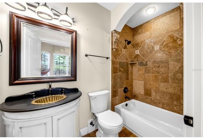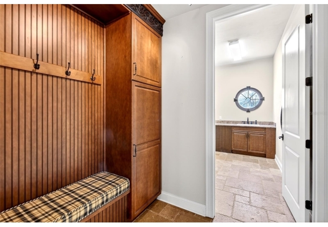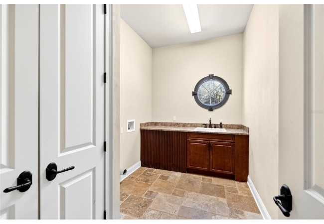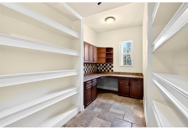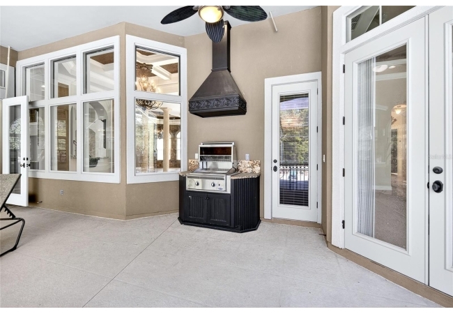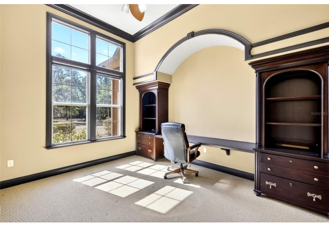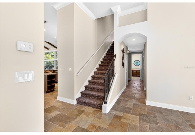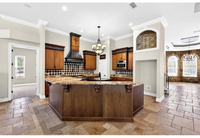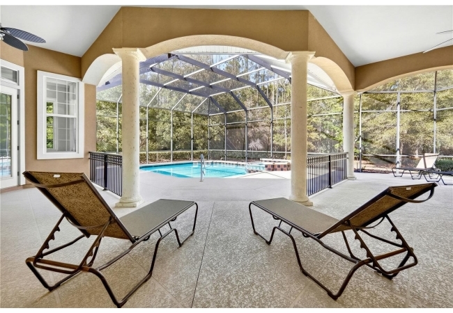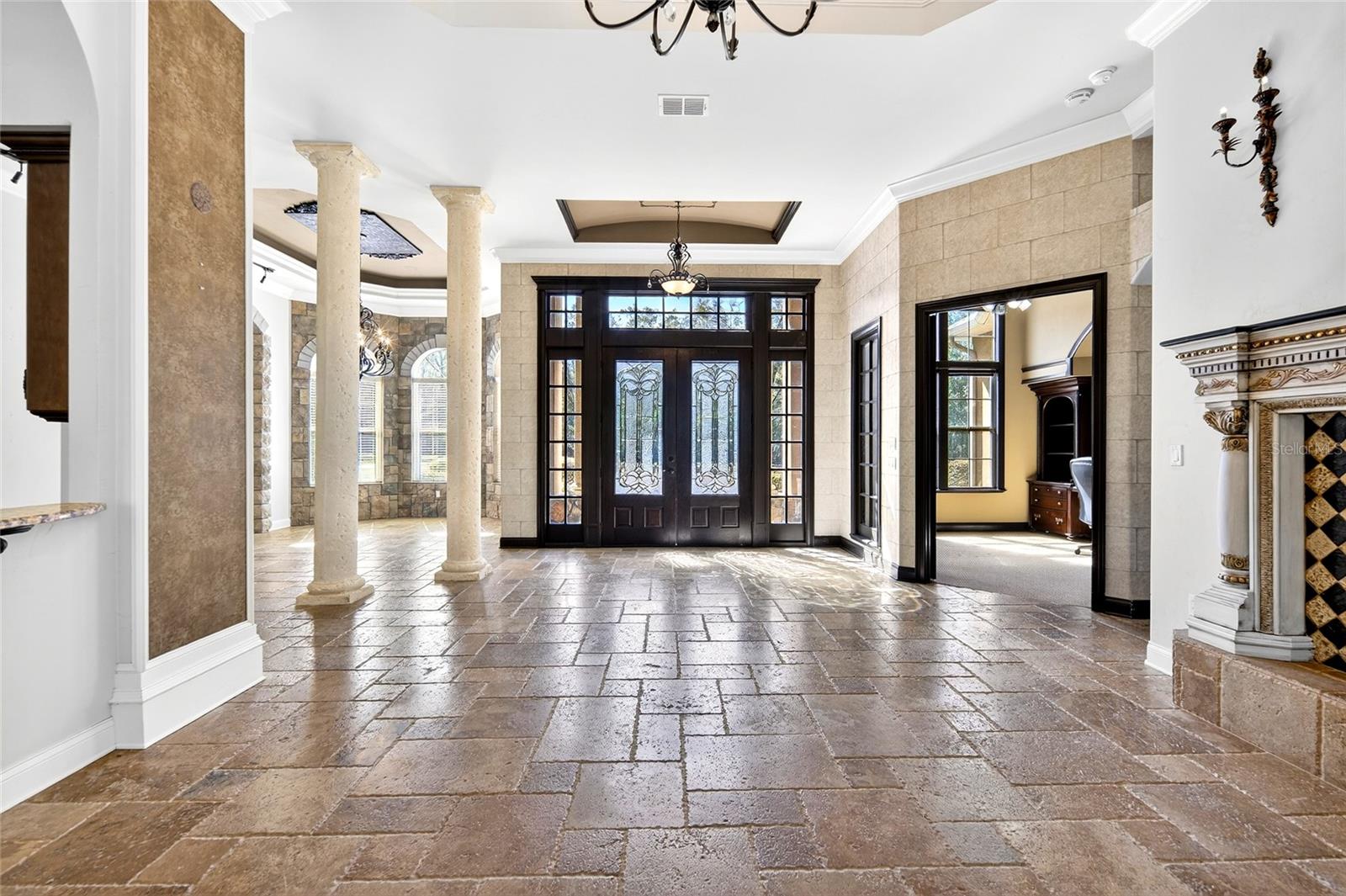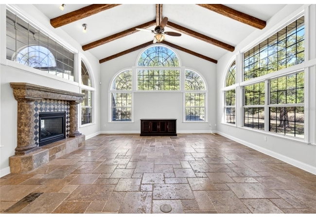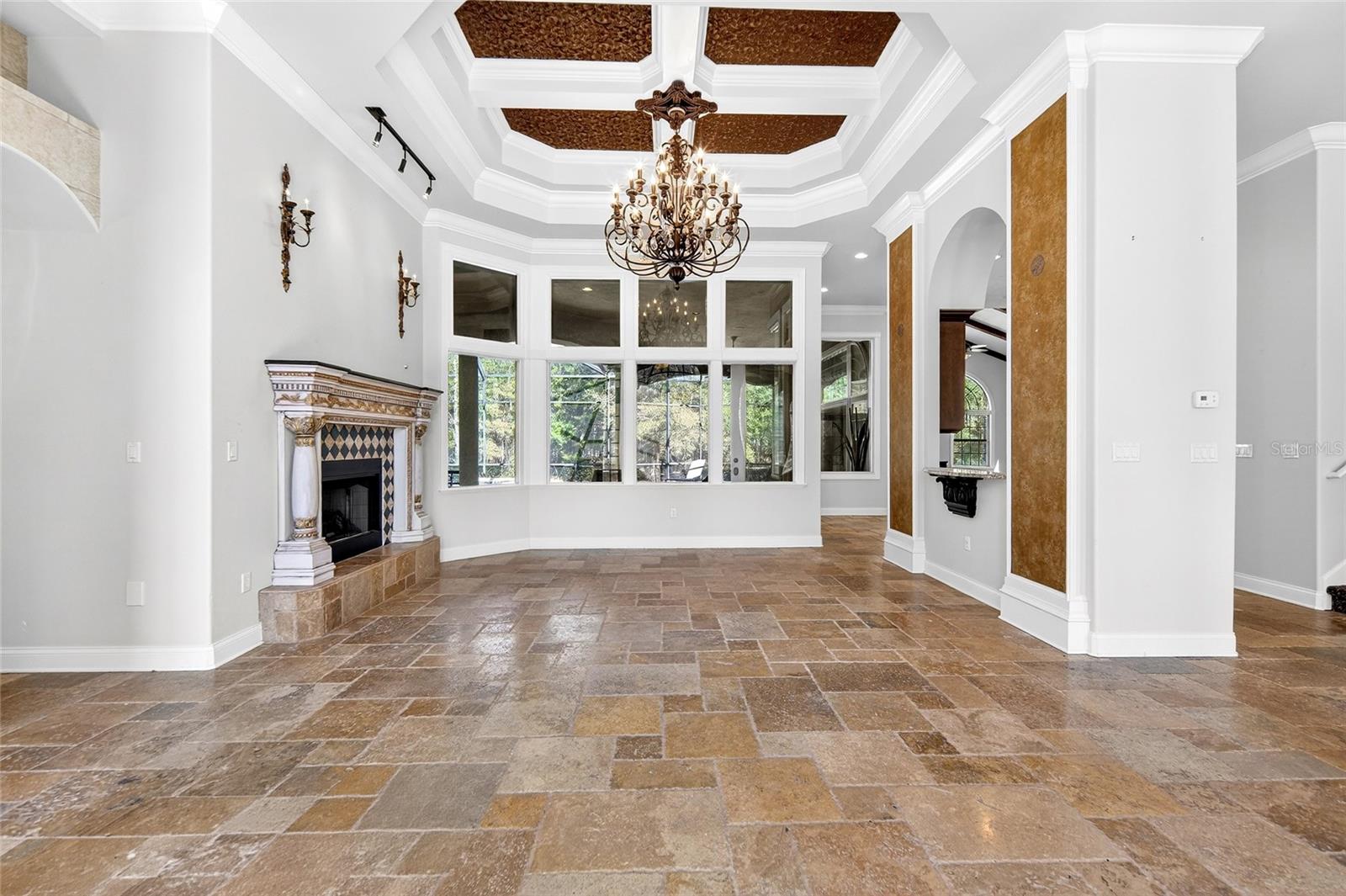 From the moment the double doors open, the home makes an unforgettable impression. Travertine floors stretch across expansive living spaces framed by soaring ceilings, decorative columns, and intricate coffered detailing crowned by statement chandeliers. Walls of arched windows flood the interiors with natural light while capturing tranquil views of the screened pool and wooded backdrop beyond.