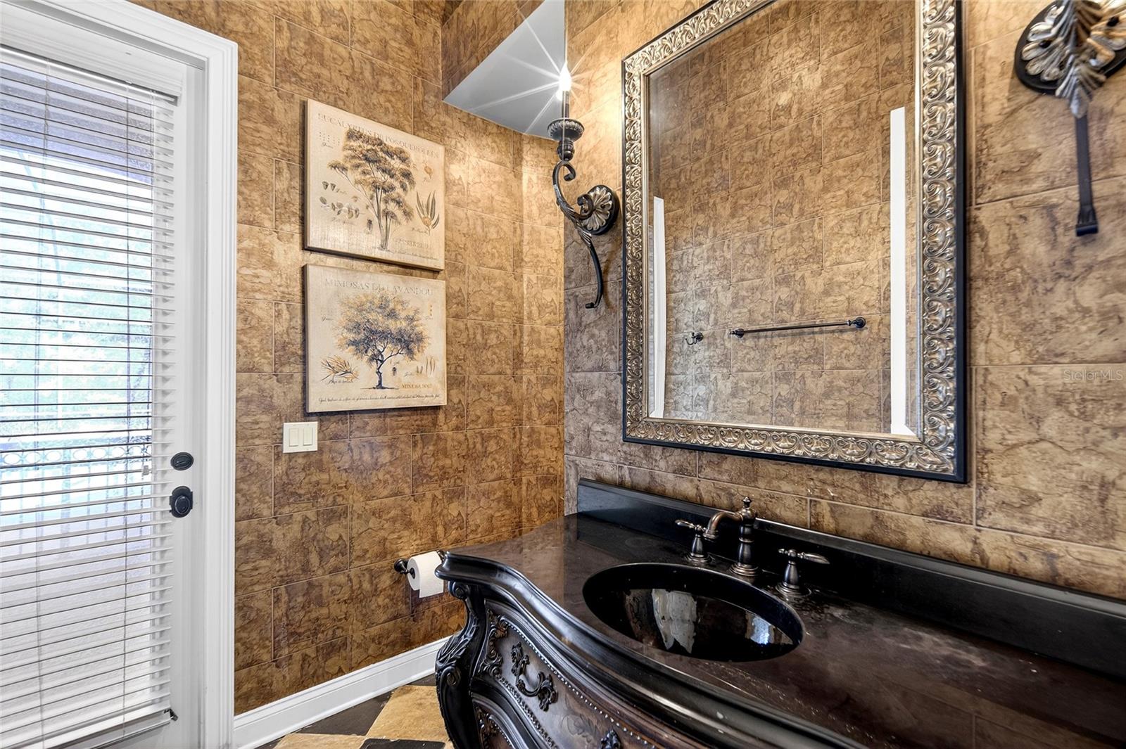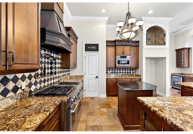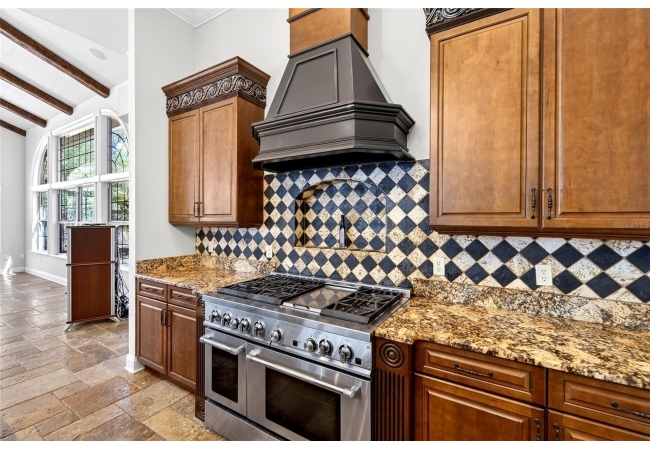 The kitchen is both striking and functional — designed for entertaining as much as everyday living. Solid wood cabinetry with decorative millwork, granite countertops, a substantial island, built-in wine refrigeration, and a professional-grade gas range with vented hood create a space worthy of a private chef. The diamond-pattern tile backsplash adds texture and artistry, while the sink overlooks the pool and outdoor living area.