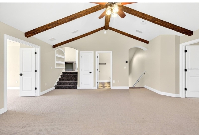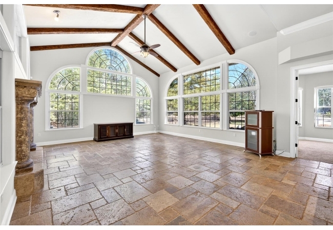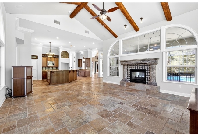 Two custom stone fireplaces anchor the living areas, creating warmth and balance against the home’s grand scale. Exposed wood beams in the main gathering room add richness and character, blending timeless craftsmanship with modern comfort.
