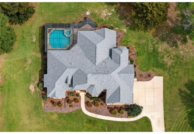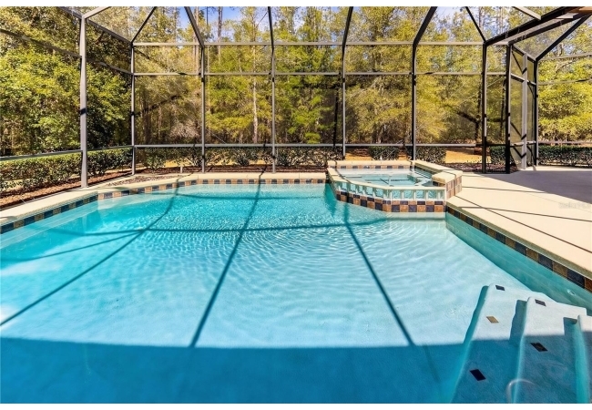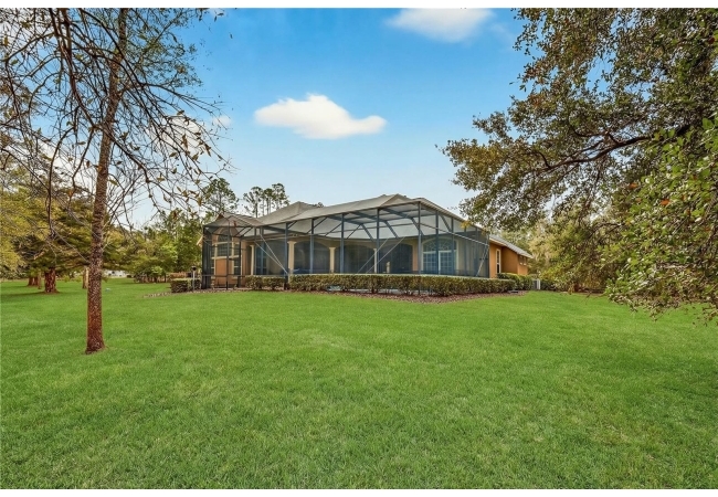 Outdoors, the screened pool and spa enclosure become the centerpiece of daily life — framed by mature trees and complete privacy. The five-acre setting offers open space in the front and wooded seclusion in the rear, all within a gated community and entirely in Flood Zone X.
