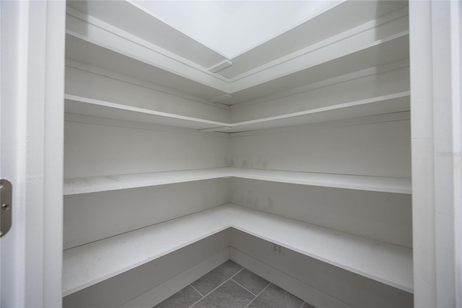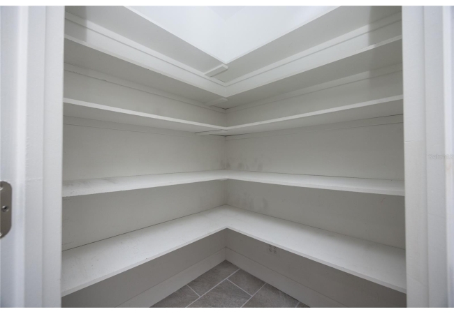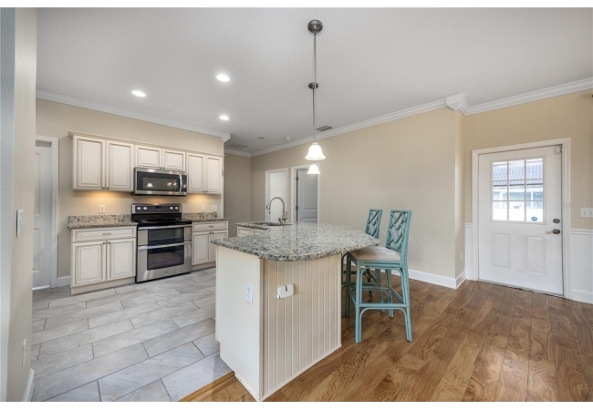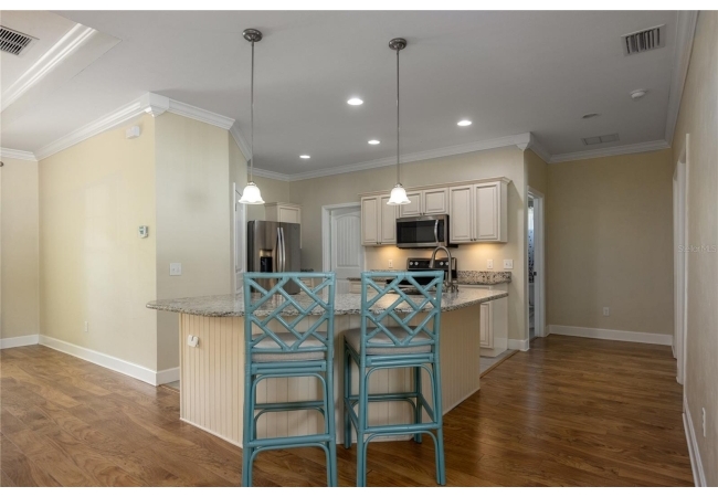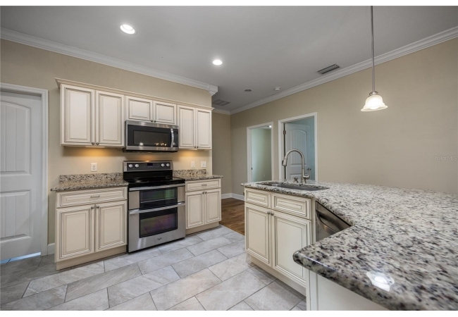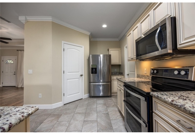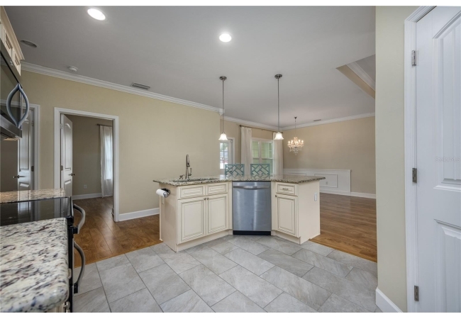 The kitchen is a true centerpiece, boasting granite countertops, a large pantry, custom wood cabinets with under-cabinet lighting, bar seating, newer stainless steel appliances, a deep sink, and ceramic tile flooring. The kitchen seamlessly opens to the living and dining areas, offering the perfect flow for modern living.