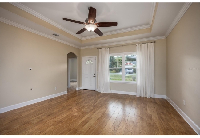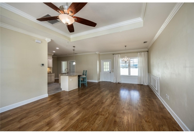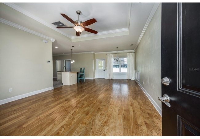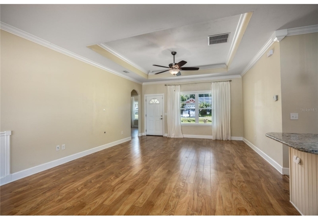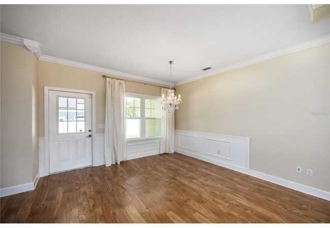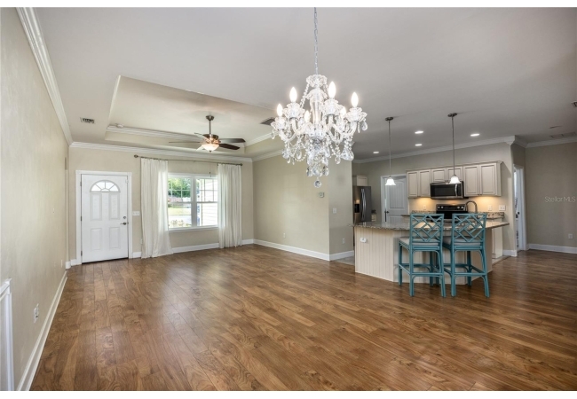Step inside to find high ceilings, crown molding, and a bright, spacious layout with a great room measuring 18’x18’, featuring a large picture window that fills the space with natural light. The adjoining dining room offers another large picture window and a new chandelier, creating an inviting space for entertaining or family gatherings.