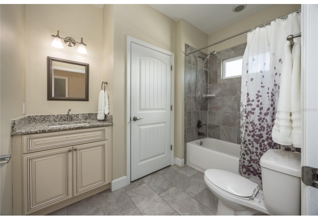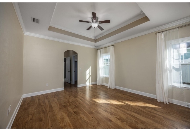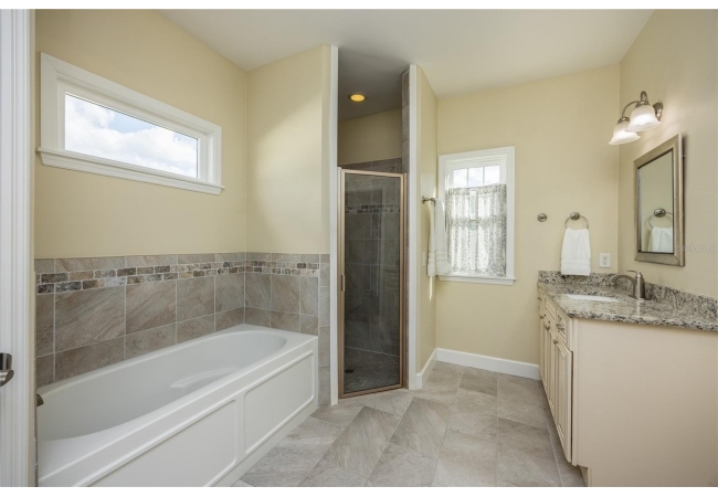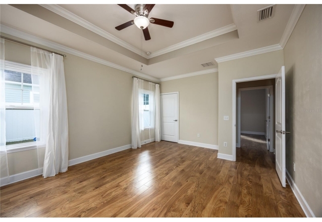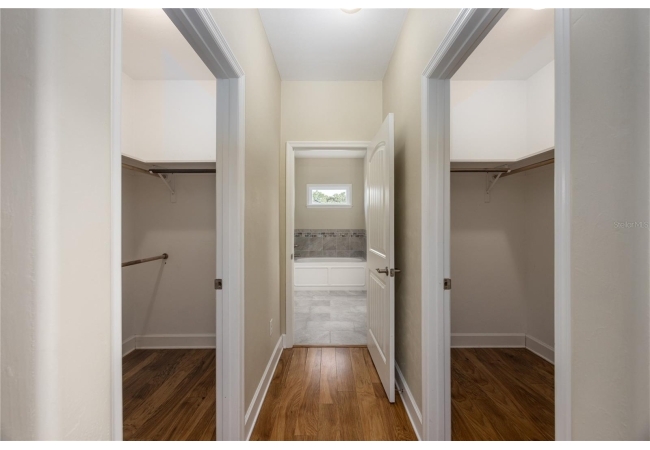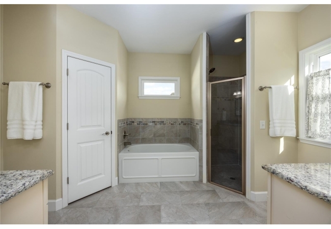 The large primary bedroom (15’x15’) features high ceilings, two spacious walk-in closets, and an additional coat closet. The ensuite bathroom includes dual vanities, a soaking tub, a walk-in shower, and a private toilet room. Three additional bedrooms—two generously sized and one smaller—offer flexibility for guests, family, or a home office.