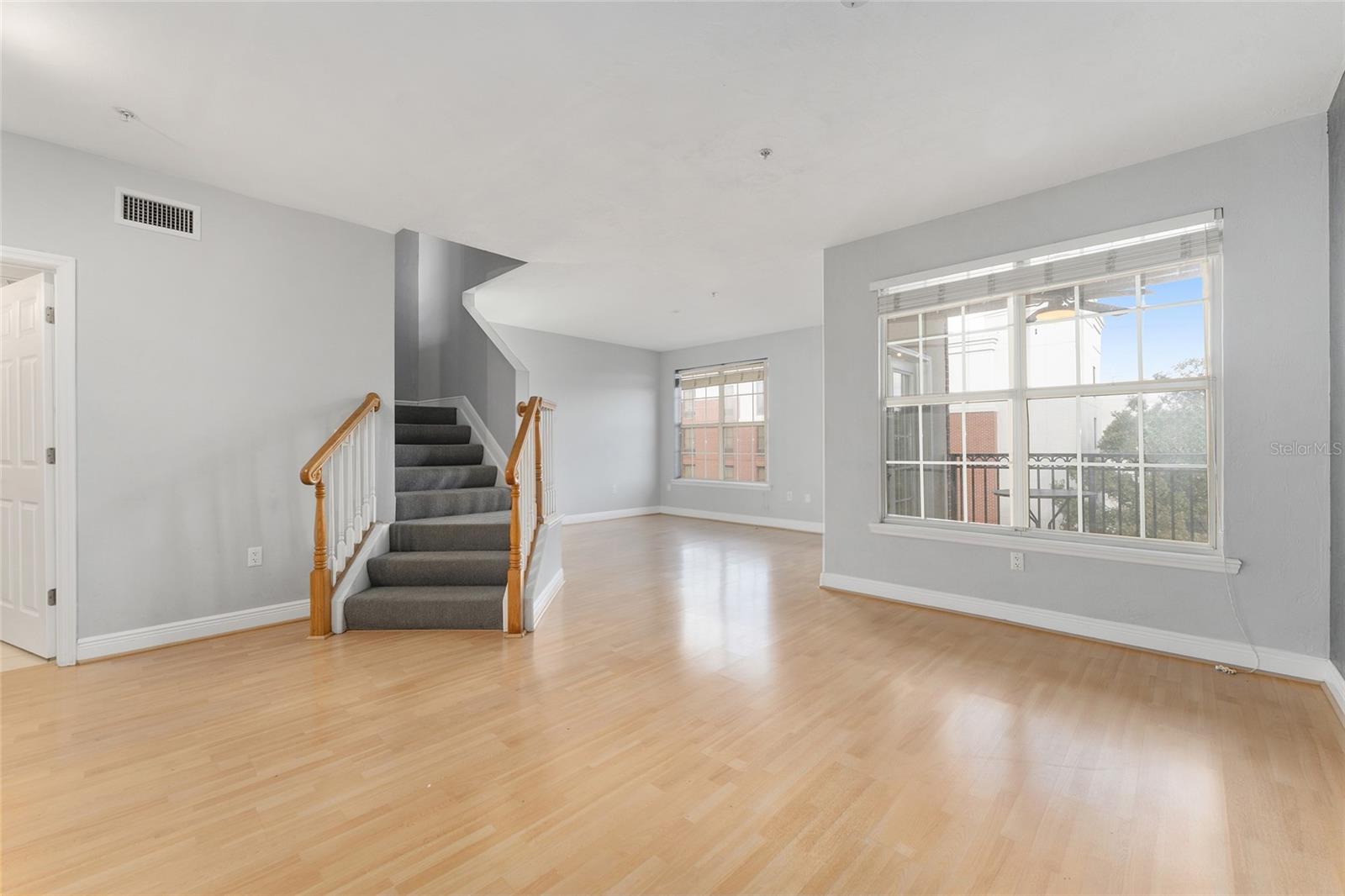 Experience upscale downtown living in this beautifully designed 2-bedroom, 3-bath condo located in the highly sought-after Union Street Station, in the heart of Gainesville. Situated on the 4th and top floor, this unit offers that feeling of home, style, and convenience above fine dining, coffee shops, and boutique retail. The main level features your personal balcony, a full bathroom, and a versatile office / bedroom / flex room—perfect for guests or working from home. Upstairs, the spacious owner’s suite includes a walk-in closet and a luxurious en-suite bath with dual sinks and a shower. The second bedroom also offers its own bathroom with a tub and a walk-in closet, providing comfort and privacy for all.