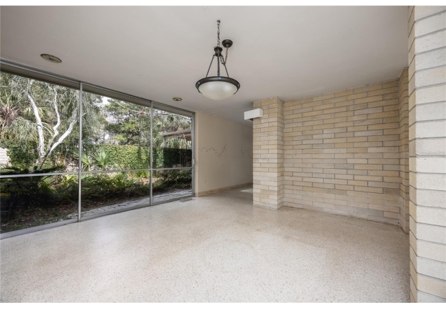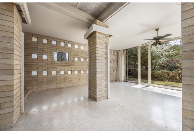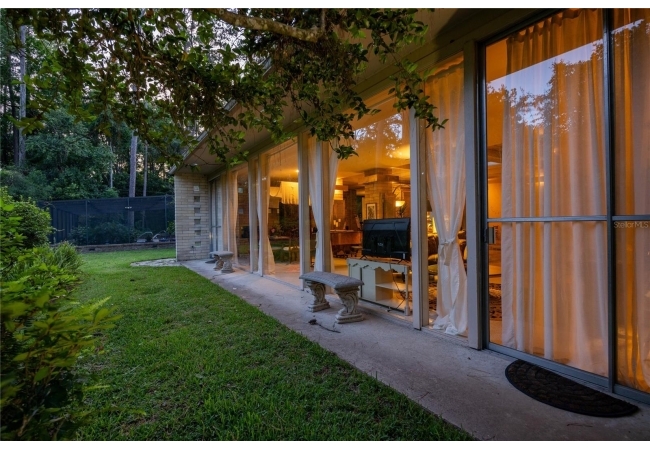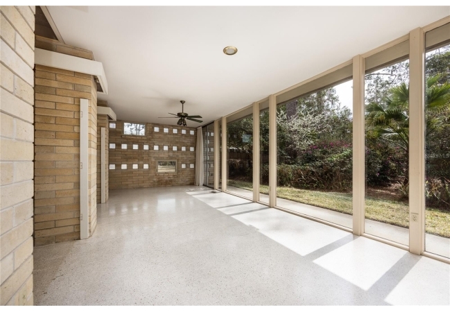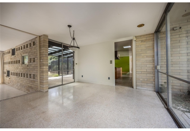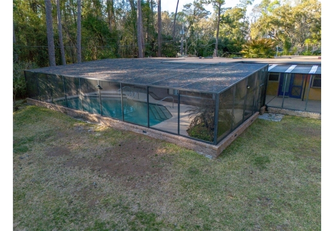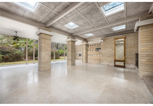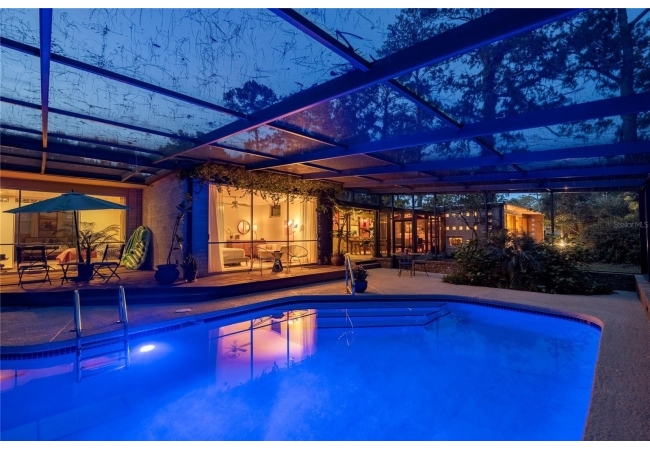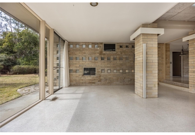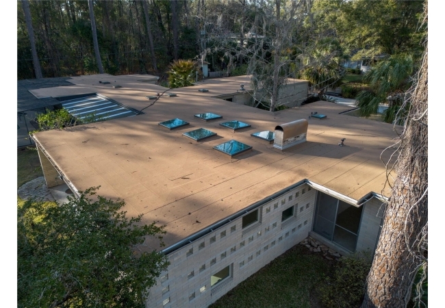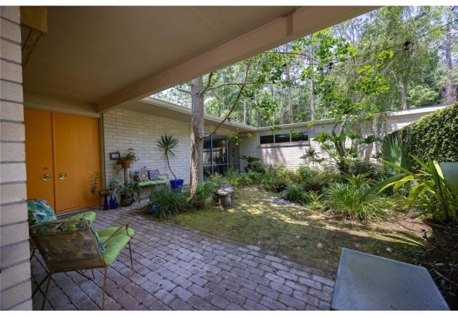 Some photos have been virtually staged. A rare, single-story Mid-Century Modern pool home on an acre in NW Gainesville's Masonwood neighborhood. Built in 1964 and designed by Alfred Browning Parker, known as the Frank Lloyd Wright of Miami, this home seamlessly combines indoor and outdoor living. Modern design combines with a mix of natural materials including Ocala block, concrete, terrazzo and glass. The large open spaces are full of natural light and have views of the private courtyards and gardens, providing shade, privacy and a connection to the outdoors. The gated entry courtyard has a waterfall flowing into the koi pond and a covered walkway to the large double entry doors. Walls of glass, skylights and custom light fixtures fill the living space with light. The large multi-use living room incorporates space for dining, music, an office and conversation areas, all with views of the garden. To the left of the entry are two bedrooms and a guest bathroom. The first bedroom has an entire wall of sliding glass doors that opens to a second private courtyard. The guest bathroom has a step down Roman tub and plenty of storage with an adjacent linen closet. The second bedroom is currently configured as a den with a closet, bookshelf, fireplace and large sliding glass door. The front wall of the Living Room has updated double paned windows, like the rest of the home. It also has glass blocks that create a very unique pattern of light in the Ocala Block wall. To the right of the foyer is a casual dining area with sliding glass doors to the rear covered porch. Around the corner is the updated Kitchen with a built-in pantry, center island and solid wood 42 inch cabinetry, Quartz countertops and stainless steel appliances. There are two large windows overlooking the rear porch and custom lighting throughout. The home is well loved and maintained. New HVAC 2024. Water Heater 2025. Roof 2024. Across from the Kitchen is the laundry room which may be the biggest in town. It comes with a washer and dryer and lots of additional cabinets for storage. Off the laundry room is a three car, rear entry garage. Each bay has a separate door and the oversized space includes a workbench and storage. Open to the kitchen is the family room with many windows and access to the rear porch and a courtyard off the laundry room/garage. The rear porch is covered, screened and provides outdoor entertaining space. The pool and spa are saltwater. Continuing around the corner is the Primary Suite with walk-in closet, en suite bathroom and large bedroom with a wall of sliding glass doors overlooking the deck and pool. The Primary Bathroom has double sink vanity, updated fixtures and large shower. Past the Primary Suite is a large 4th Bedroom or second en suite Master Bedroom. This space has a large bedroom, office/nursery or flex space with sliding glass doors to the pool area and spa, a private exterior entrance and the en suite bathroom with water closet, tub/shower and solid wood vanity. Masonwood is located 1 mile north of the University of Florida. It is biking distance to Westside Park, Loblolly Woods trails and boardwalks and the 300 Tennis Club. Perfect for quiet walks, it is not on a busy through street. Less than a 5 minute drive to Millhopper Publix, Fresh Market, shops and area restaurants. The home sits on a 1 acre, low maintenance lot. A shed provides additional storage. Zoned for Littlewood Elementary, Westwood Middle and Gainesville High Schools. No HOA.