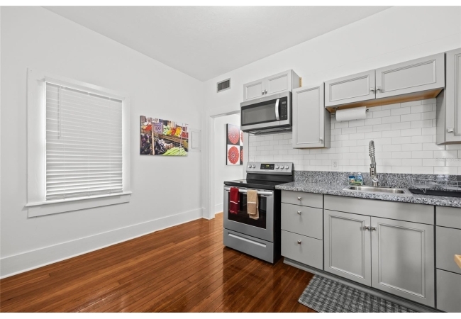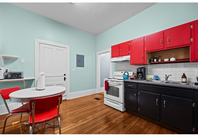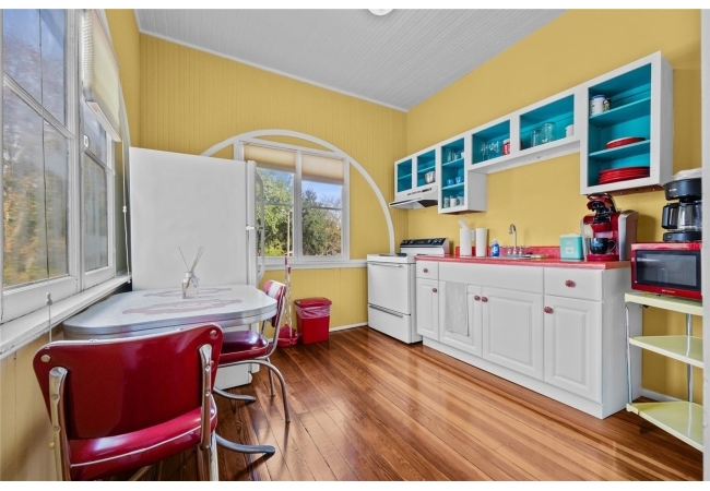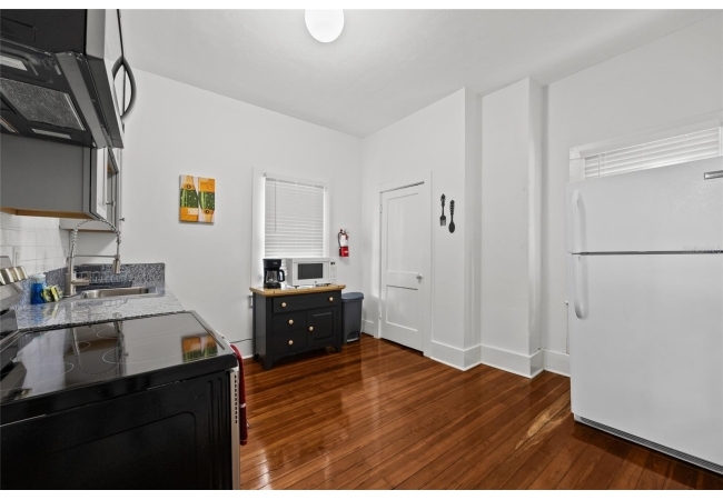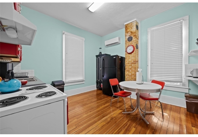 The building includes four one-bedroom, one-bathroom units, each with private kitchens and living areas. Two units feature circular living spaces within the turret. The property currently operates as short- and mid-term rentals, achieving approximately $1,900 to $2,300 per unit per month depending on season and length of stay.