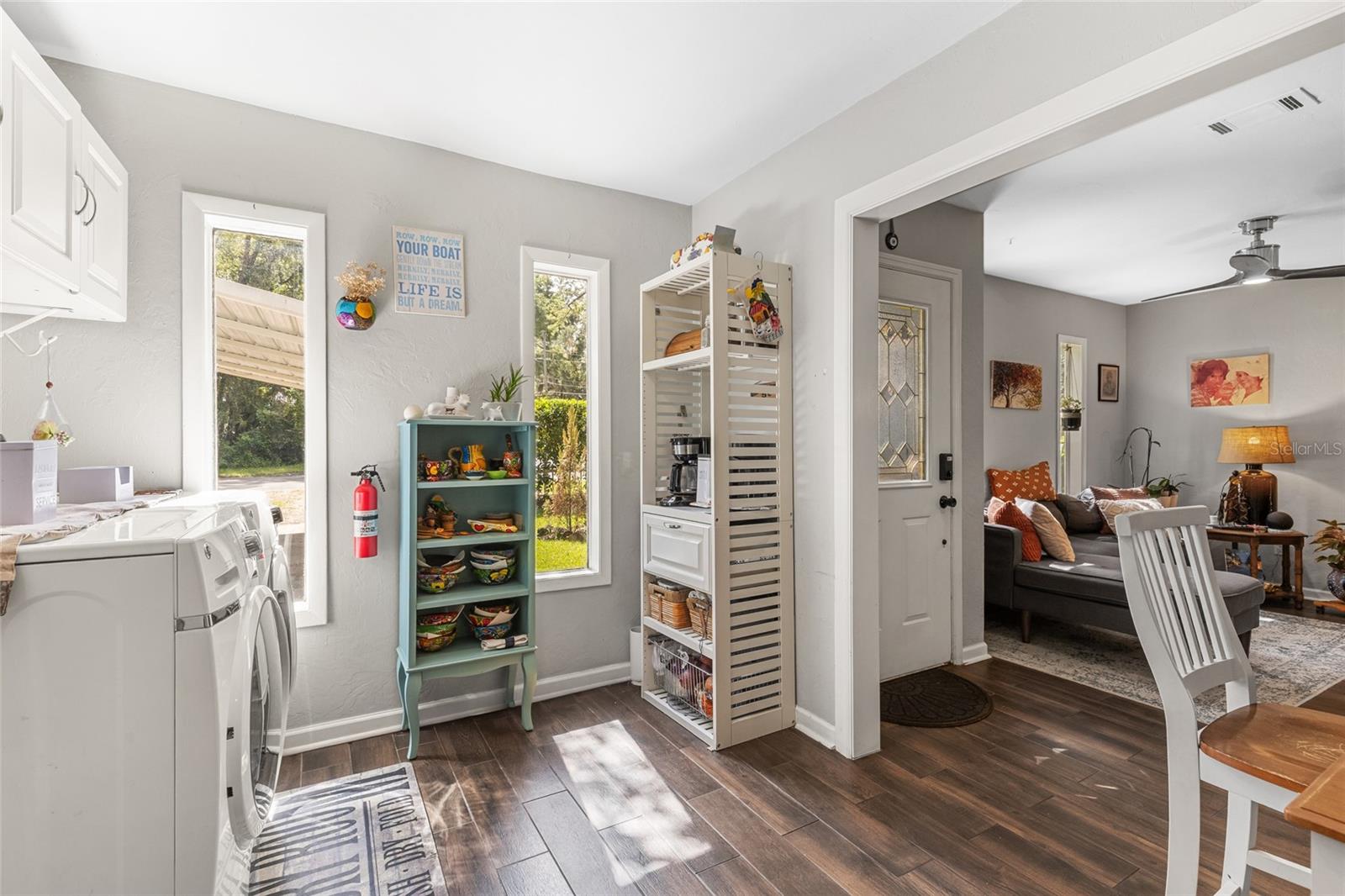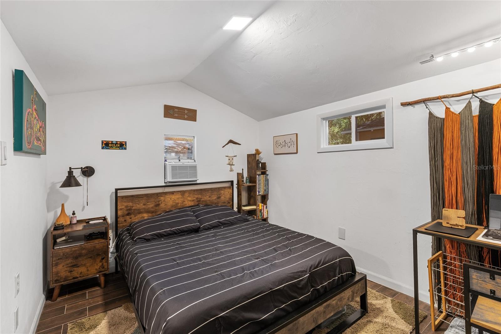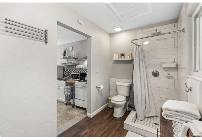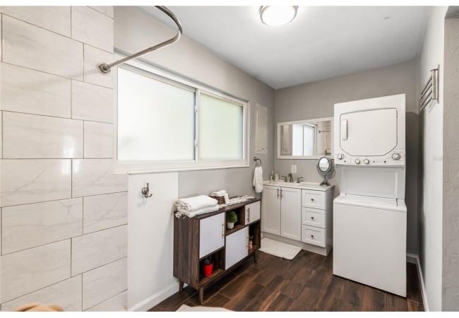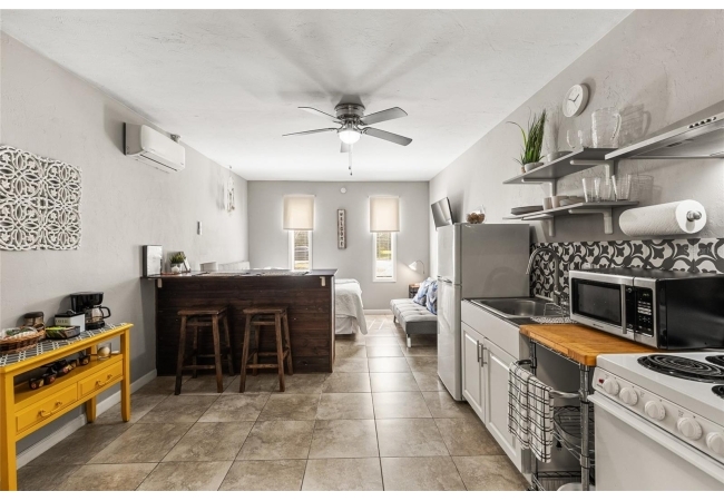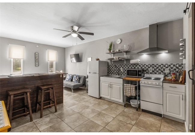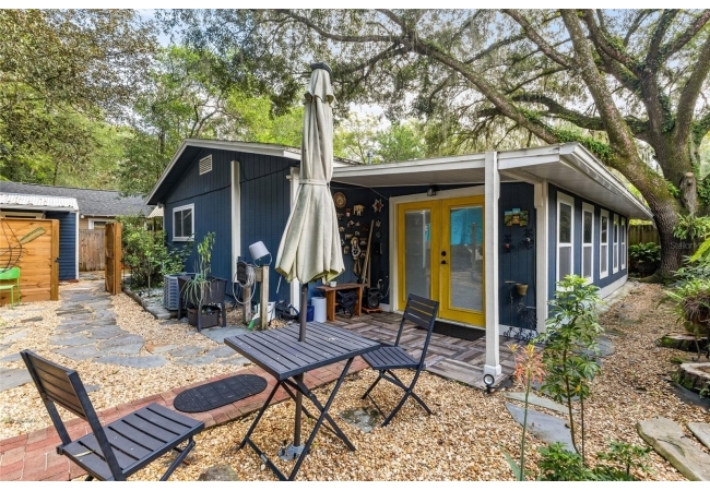 From the main house, a pathway leads to the attached ADU: a 1-bedroom, 1-bathroom studio apartment with a kitchenette, full bath, and its own laundry area.