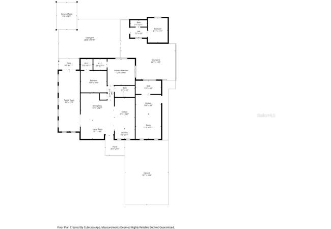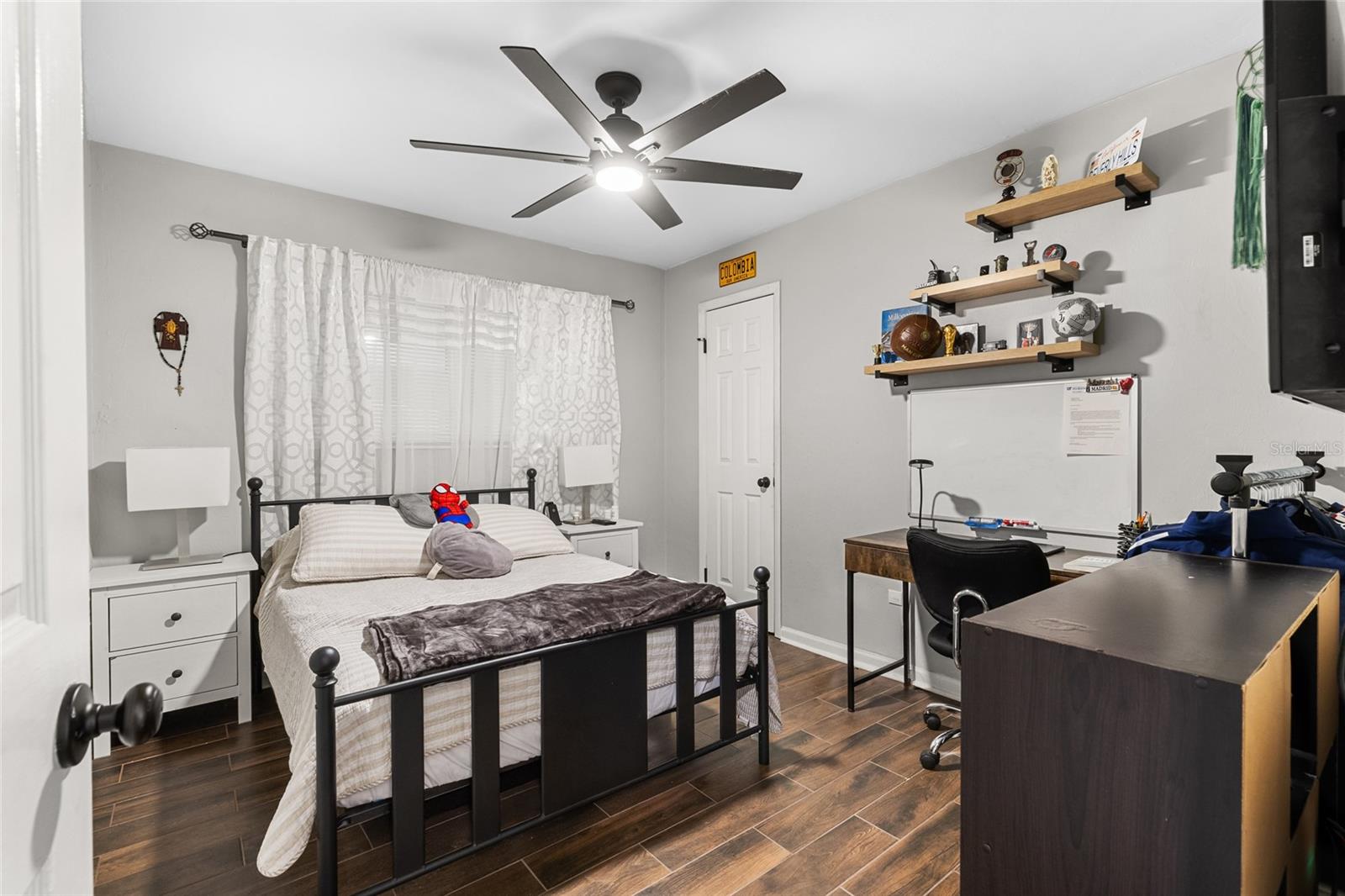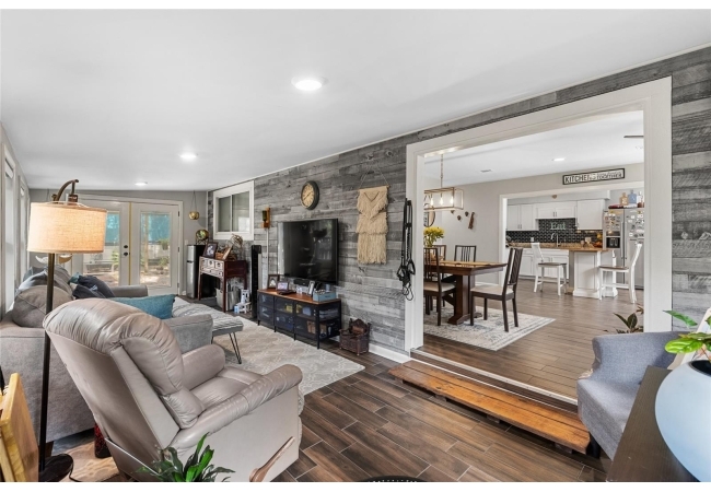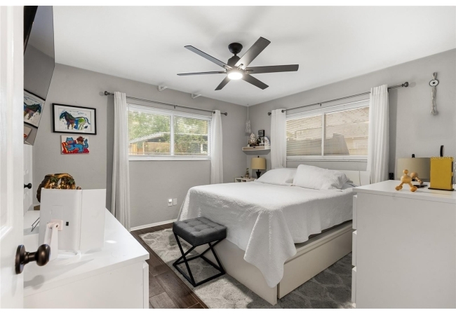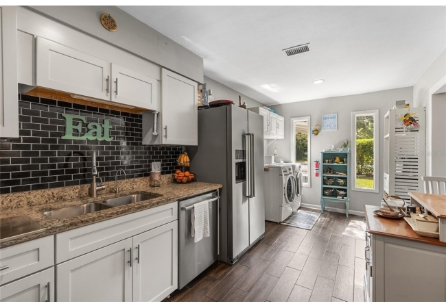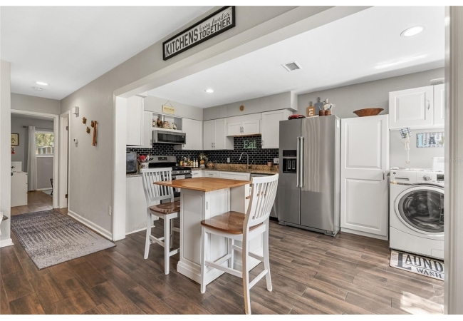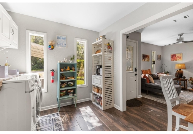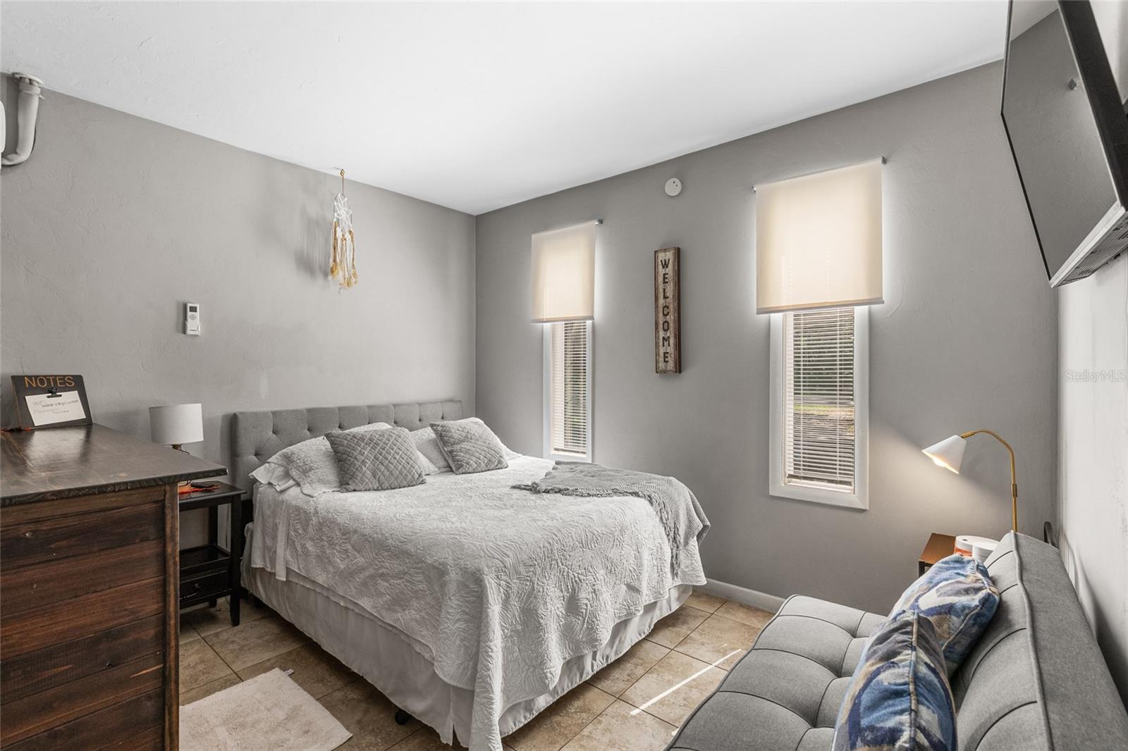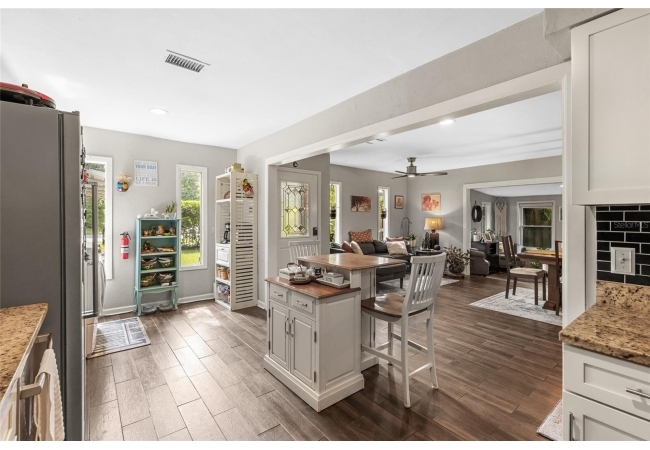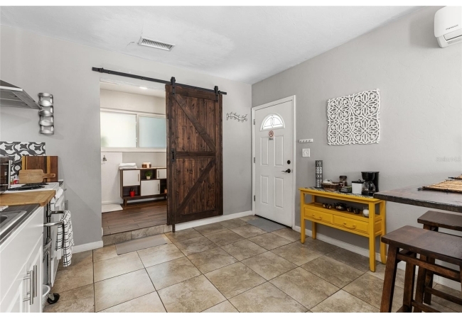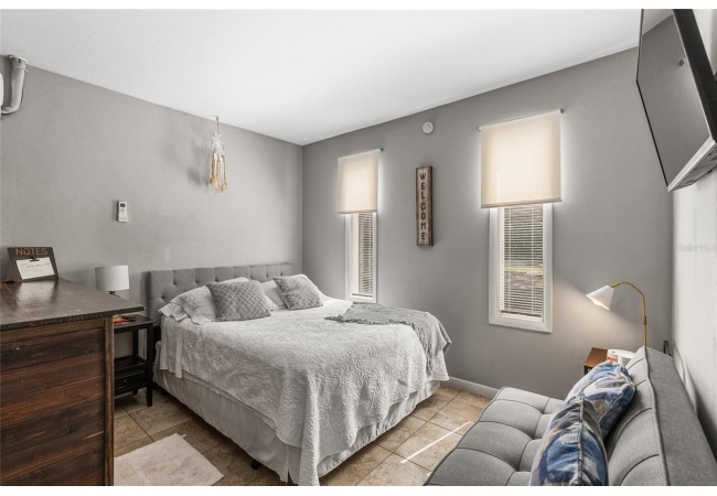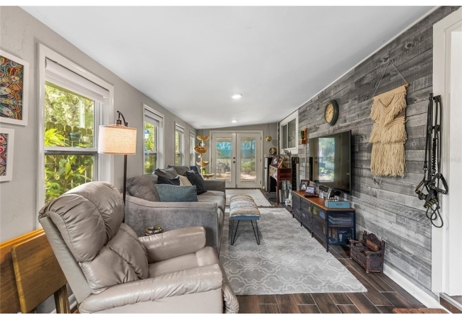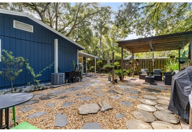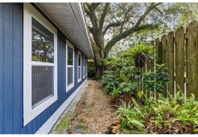 To the left, a converted Florida room expands the living space and offers a wall of windows and French doors that open to the backyard. Outside, the low-maintenance courtyard features rocks and pavers, making it both stylish and easy to care for.