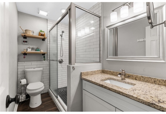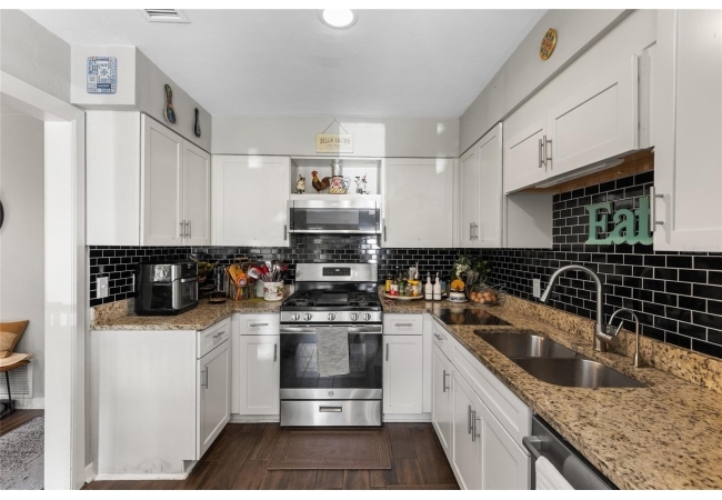 Step inside the main home to an open-concept living and dining area, filled with natural light. The cozy kitchen features granite countertops, shaker cabinets, stainless steel appliances, and an in-home laundry area for convenience. Down the hall, you’ll find two generous bedrooms and an updated bathroom with granite counters and a modern step-in shower.