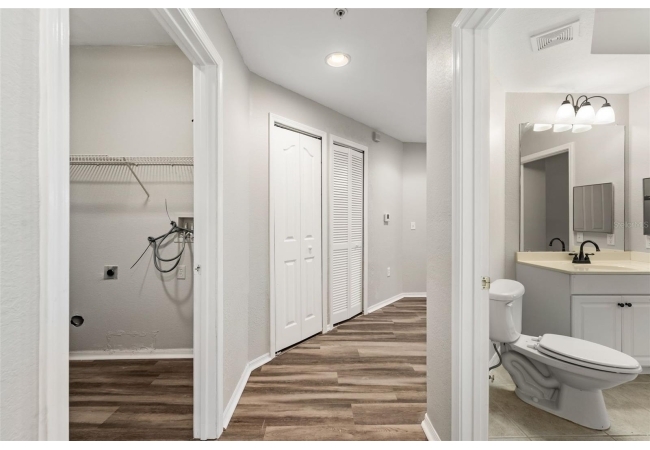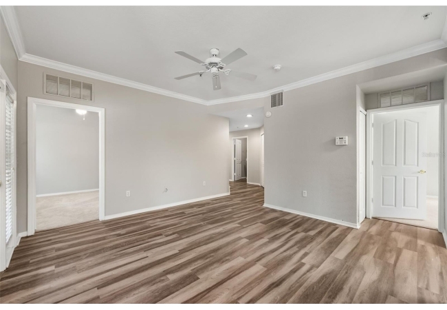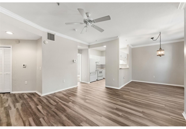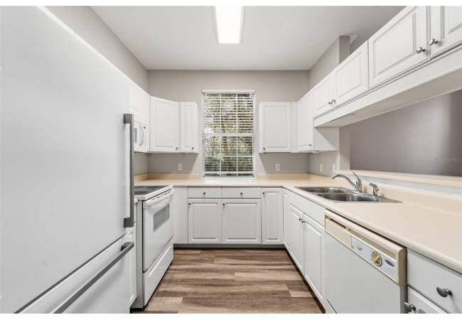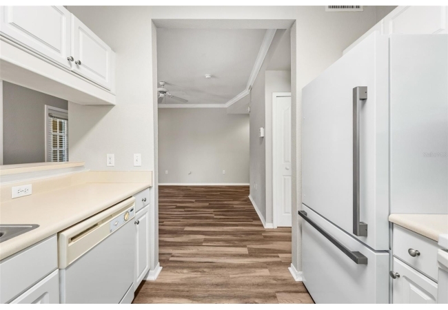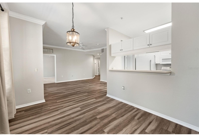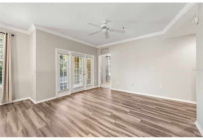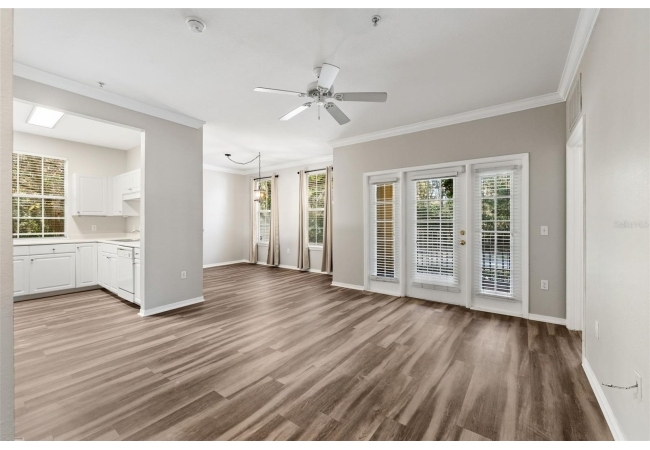 Experience the perfect blend of convenience and modern comfort in this charming, turn-key ground-floor condo located in the heart of NW Gainesville. Bathed in natural light, this home features an airy open floor plan accentuated by high ceilings, crown molding, and stylish LVP flooring throughout. The heart of the home is a spacious living and dining area that flows seamlessly into a roomy galley kitchen, complete with ample storage and a convenient breakfast bar for those on the go. Both capacious bedrooms serve as private retreats, each boasting a large walk-in closet and a full en-suite bathroom. You’ll appreciate the practicality of a full-size indoor laundry room and extra exterior storage, plus the peacefulness of your private screened-in patio—all just steps away from the community pool.