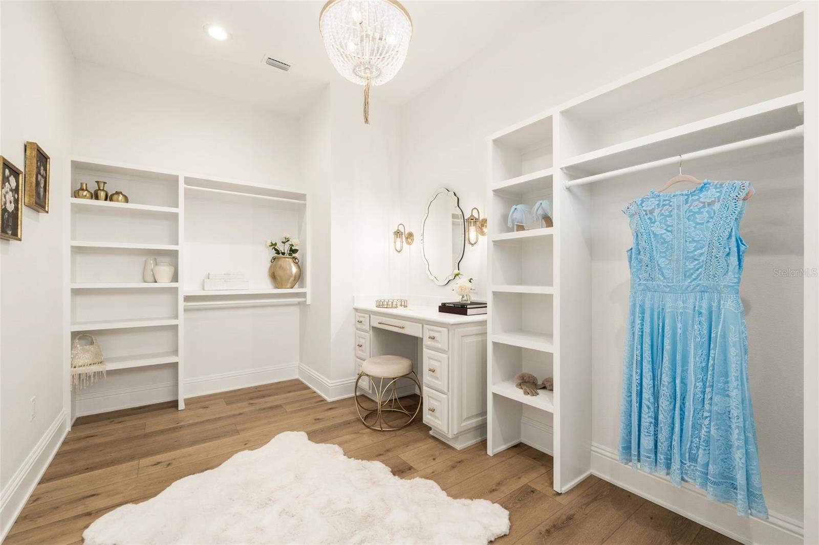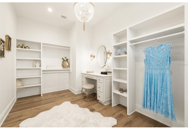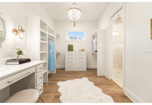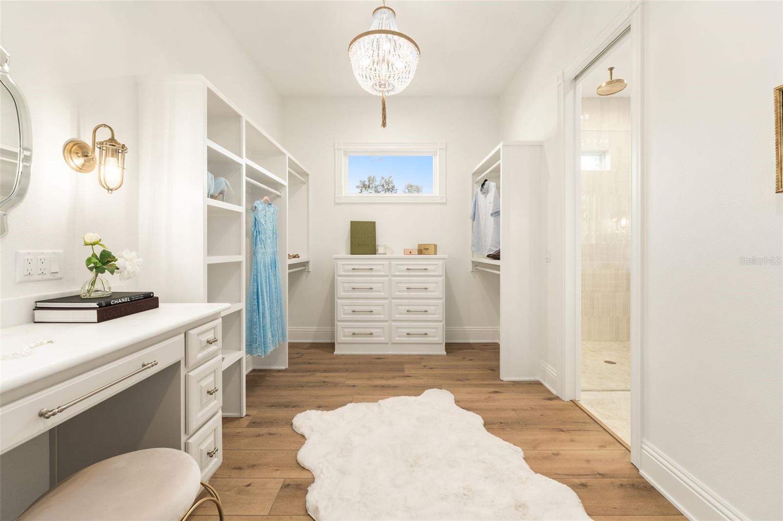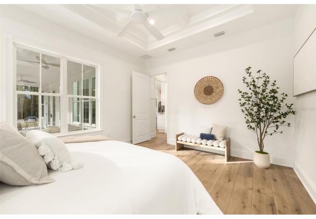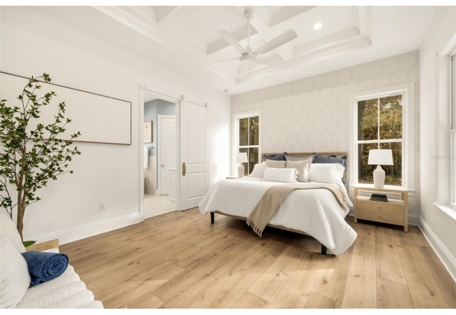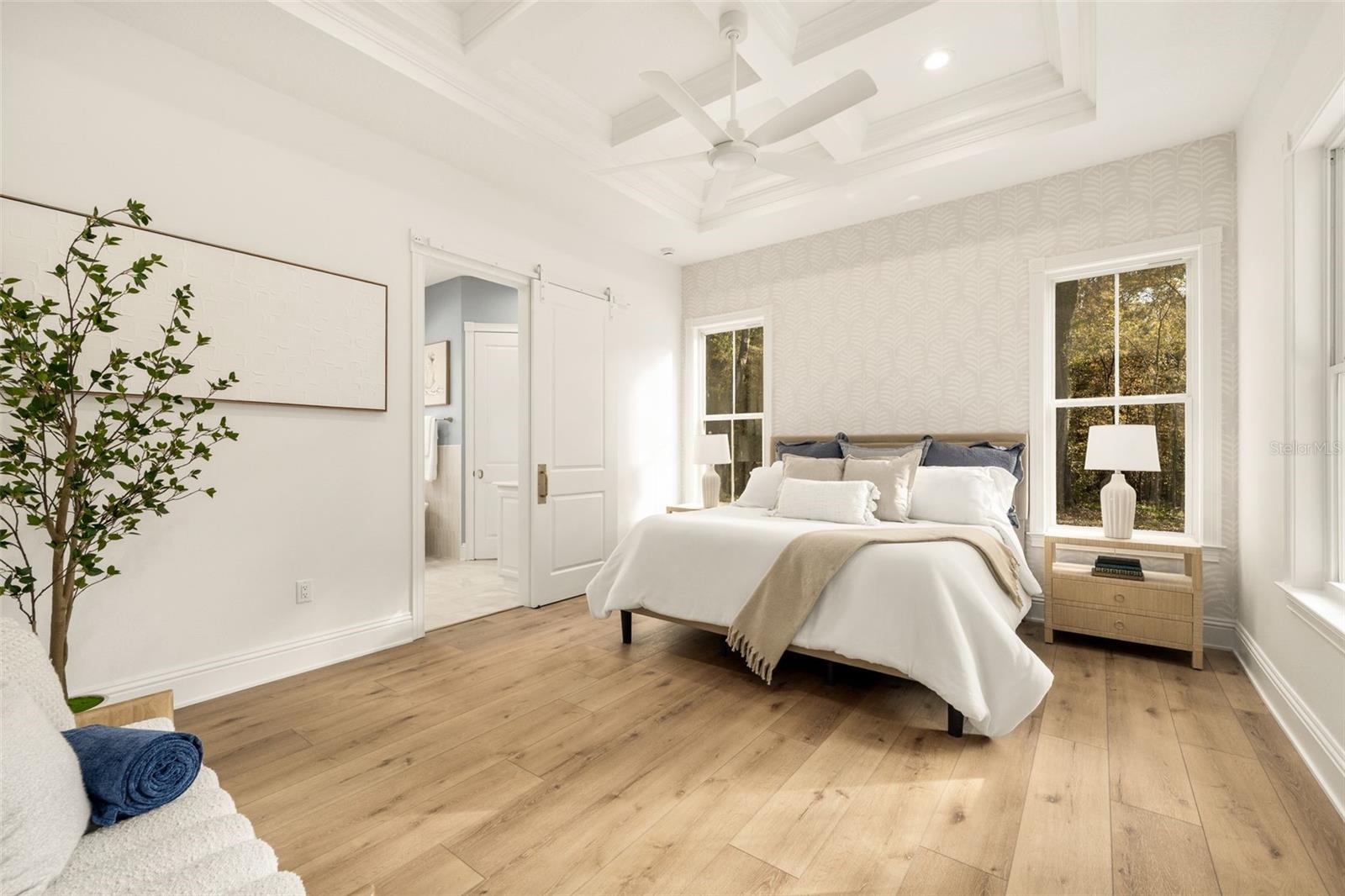 The spacious primary suite includes a coffered ceiling, a huge walk-in closet with built-in vanity, and beautifully appointed finishes throughout.