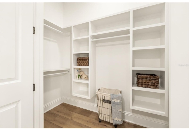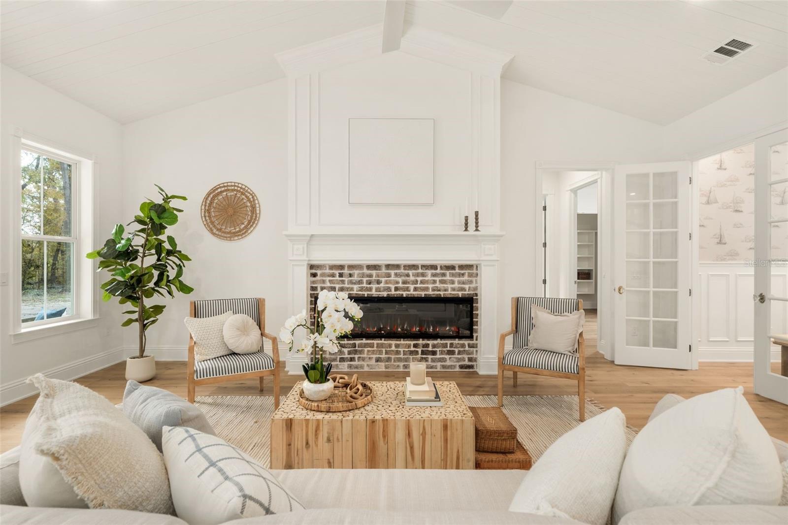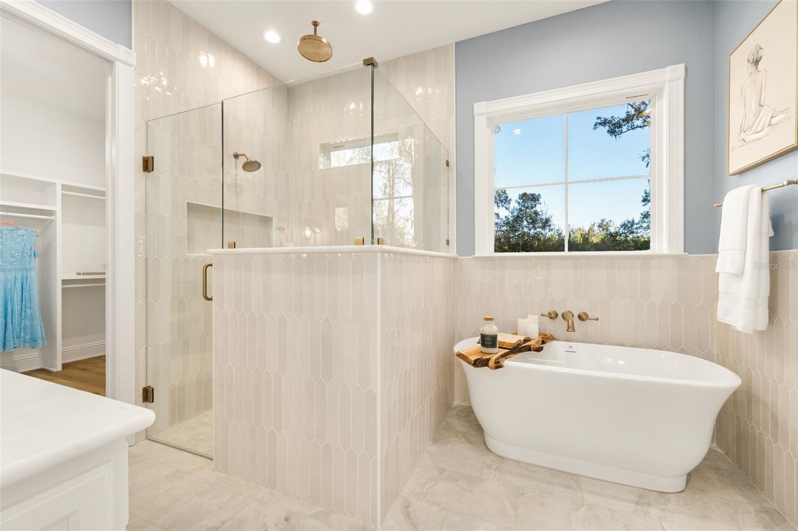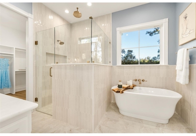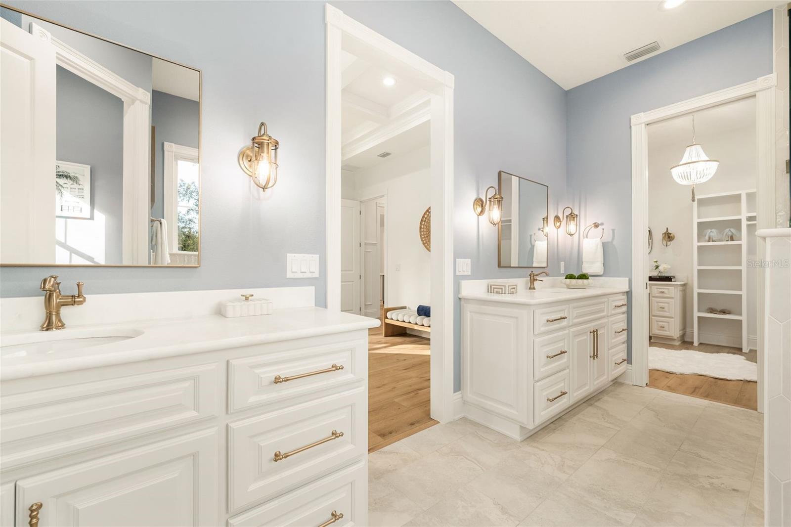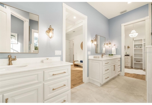 The spacious primary suite includes a coffered ceiling, a huge walk-in closet with built-in vanity, and beautifully appointed finishes throughout.