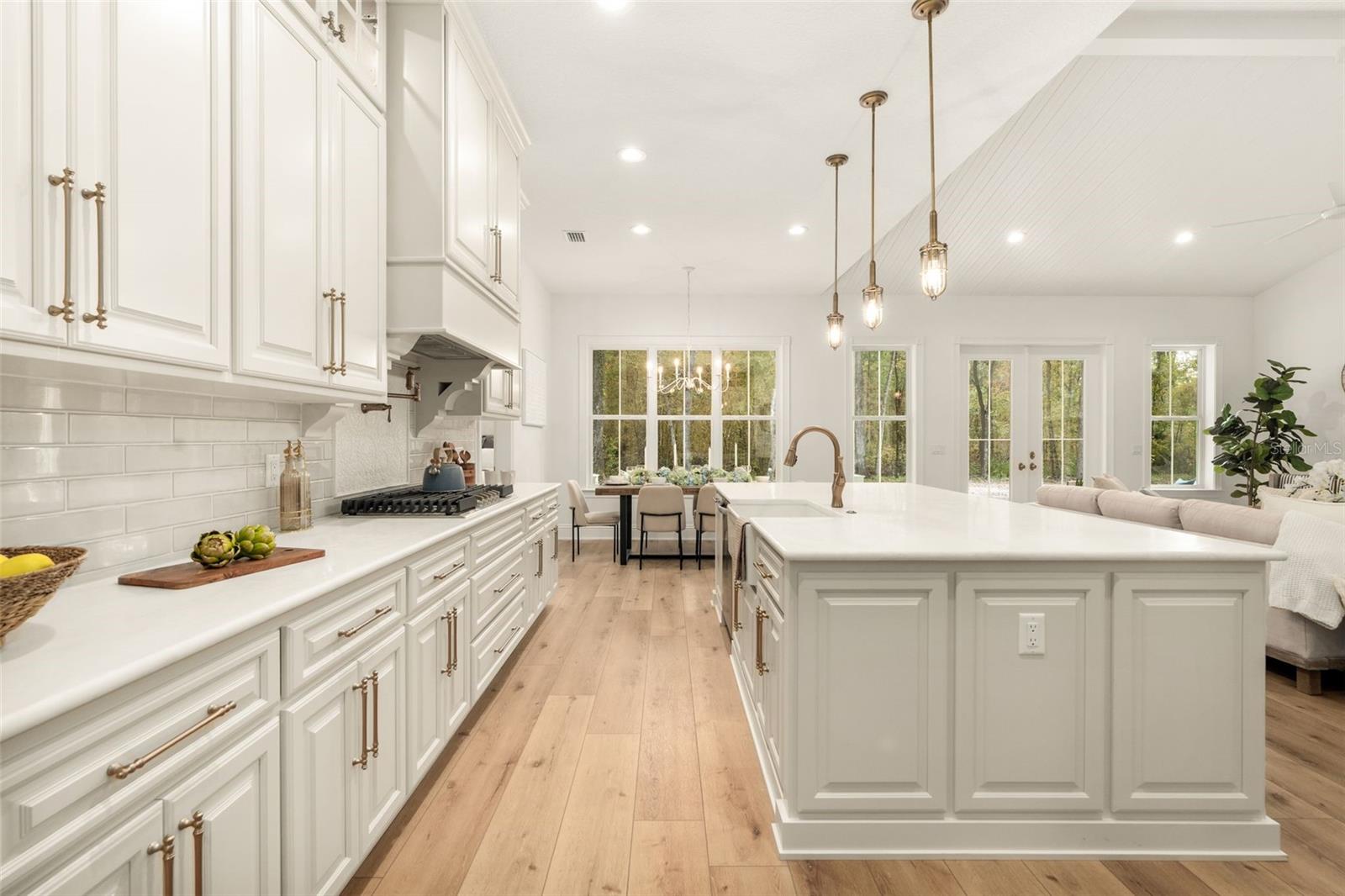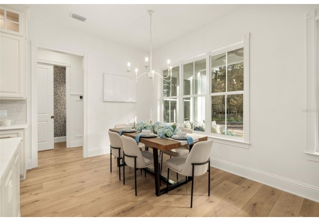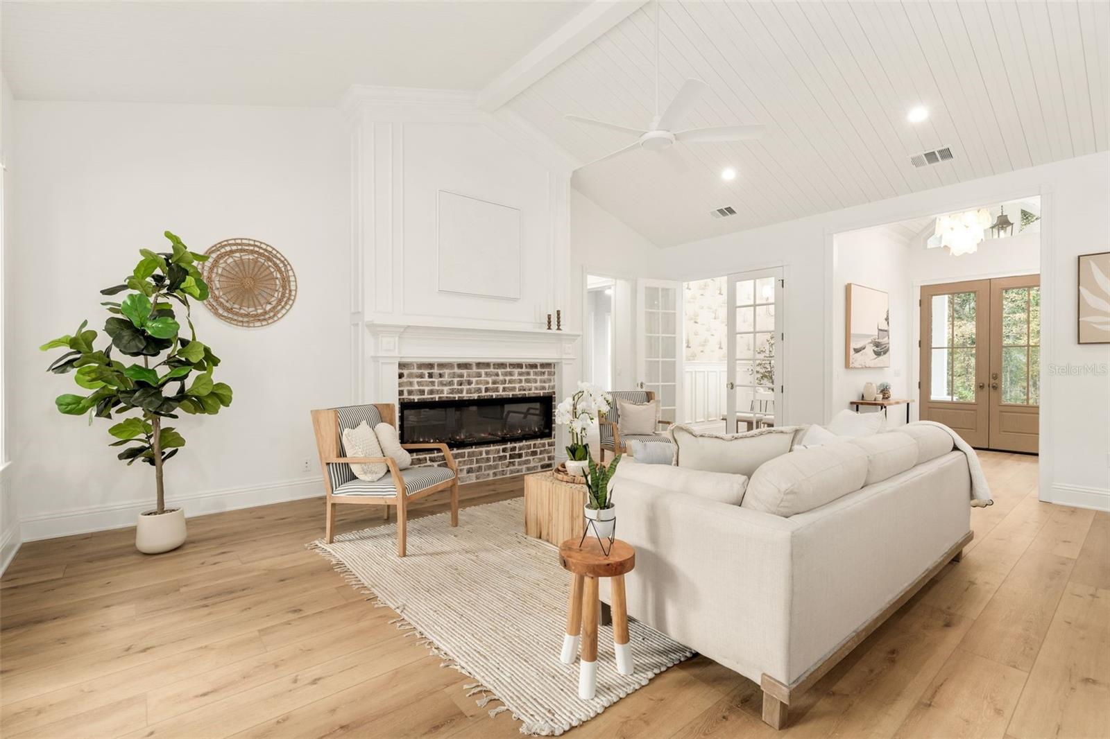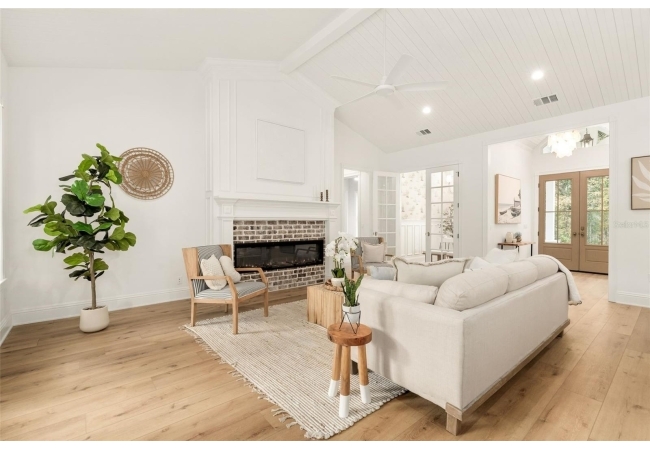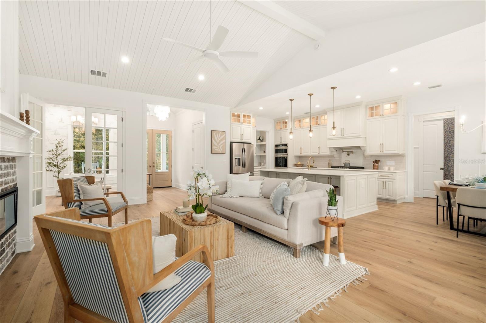Inside, enjoy 14-foot ceilings in the great room with exposed wood beams, an electric fireplace, and luxury vinyl plank flooring. The gourmet kitchen offers natural stone countertops, custom cabinetry, and a walk-in pantry. Additional features include a dedicated home office, a custom mudroom bench, and a 2-car side-entry garage.