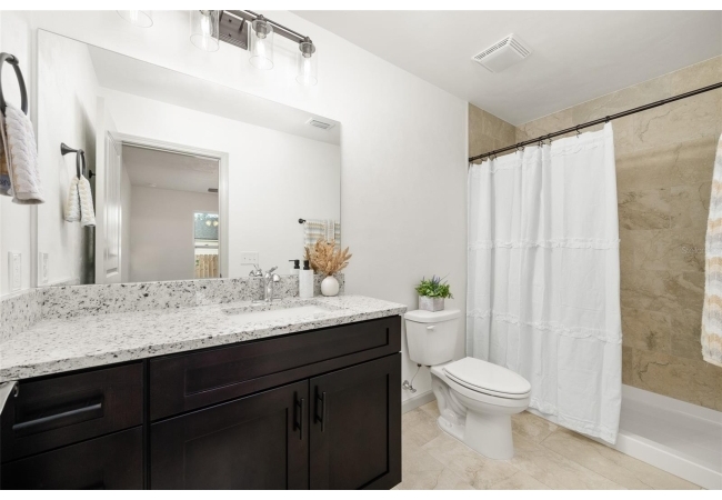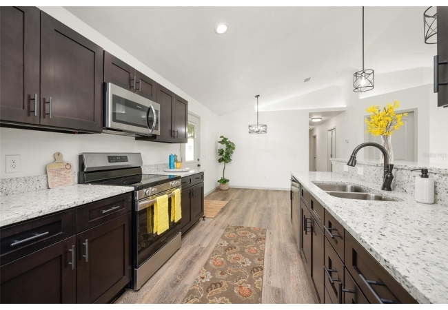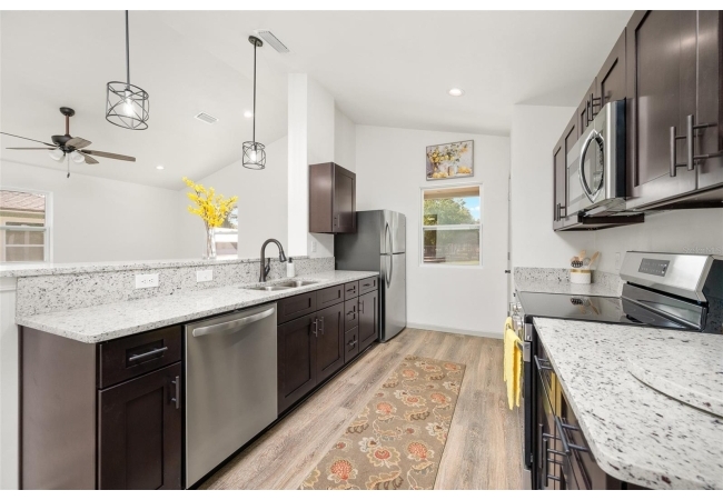 The galley-style kitchen is the heart of the home, designed for both beauty and function. You'll love the pristine granite countertops, stylish soft-close cabinets, and a full suite of stainless steel appliances. A handy breakfast bar makes casual dining and entertaining a breeze.