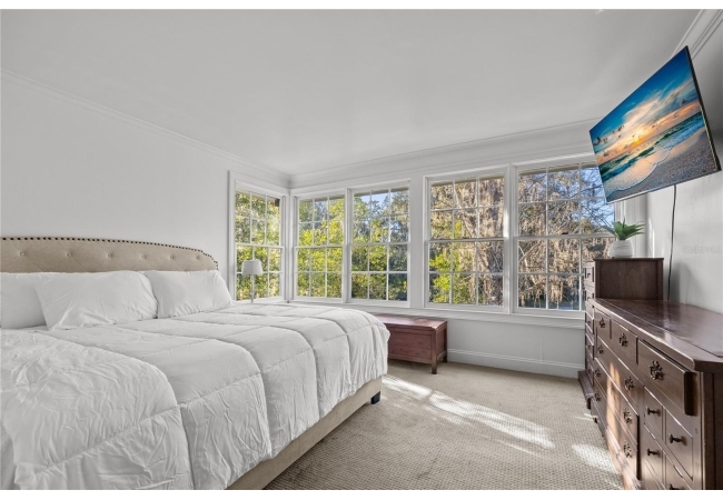 Large windows throughout flood the home with natural light, including the primary bedroom, creating a serene and inviting atmosphere. Enjoy soaking in the bathtub while taking in peaceful views of nature. A long, jaw-dropping dining room is perfectly suited for hosting, while an upstairs reading nook with built-in bookshelves offers a cozy escape. One guest bedroom features a stunning cathedral ceiling, and a wood-burning fireplace adds warmth and classic charm.