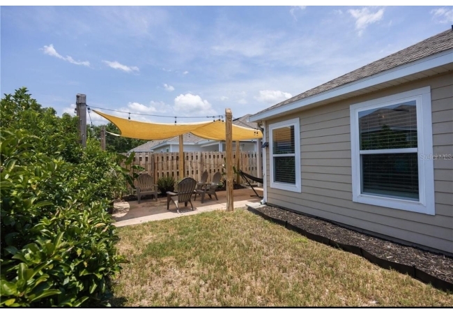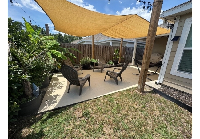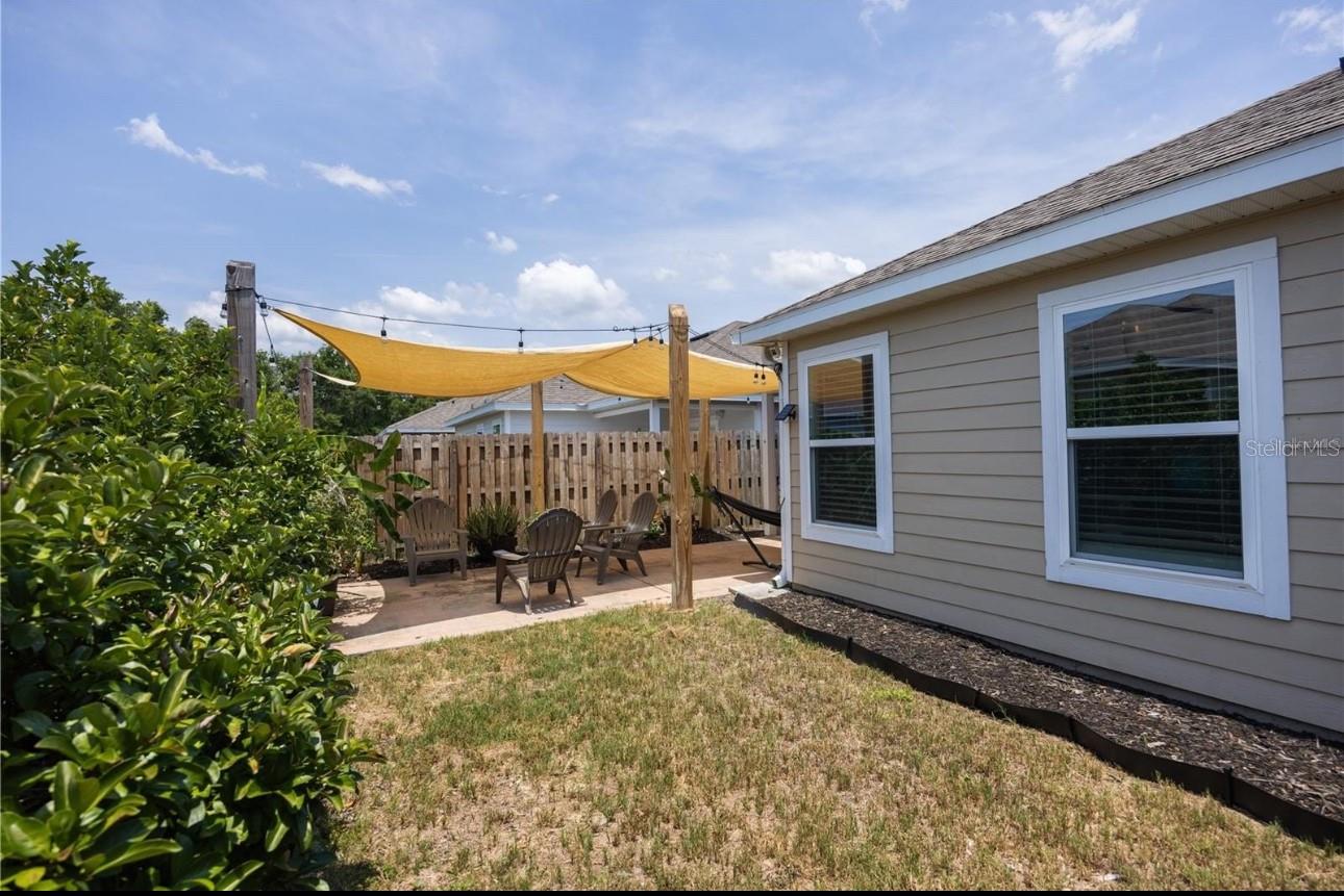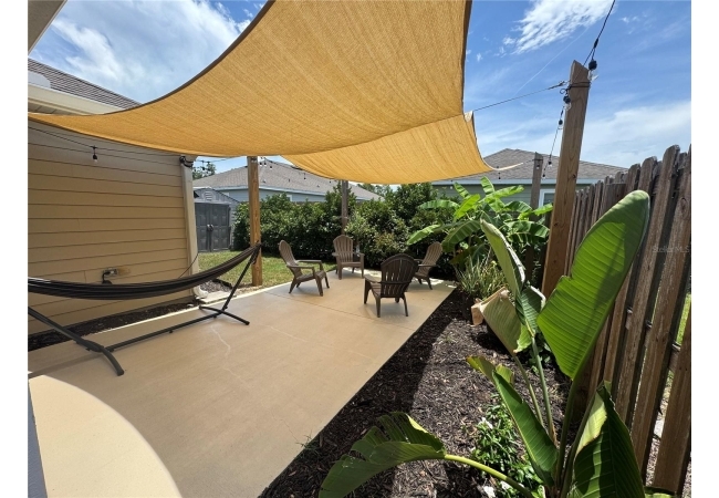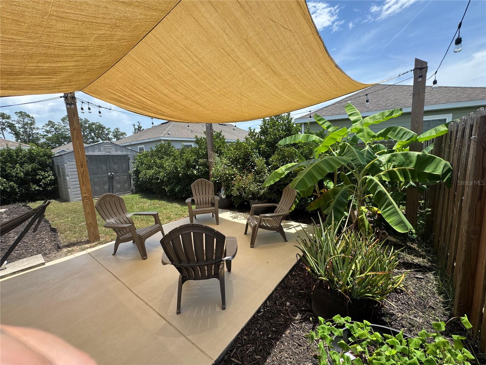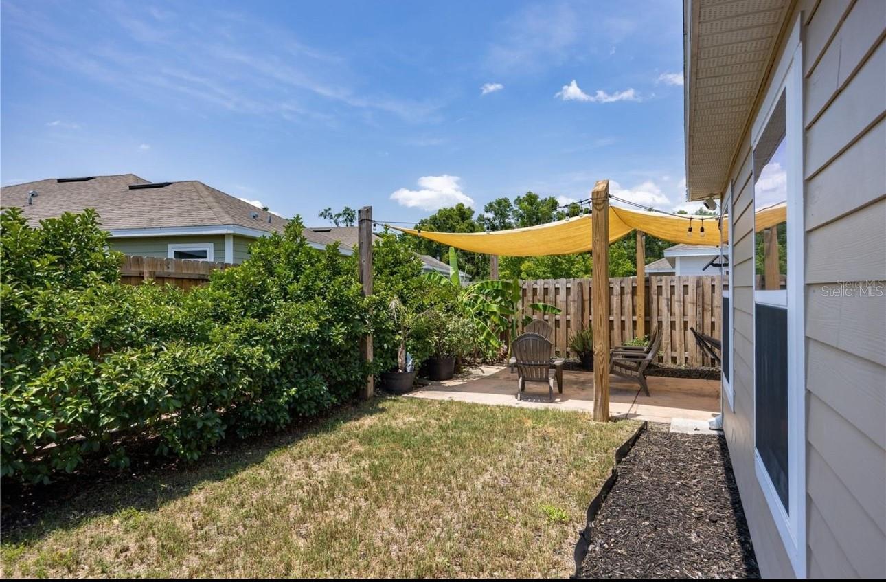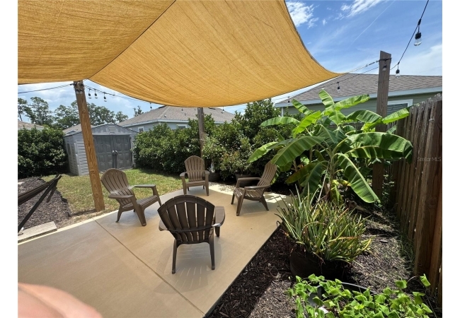 Enjoy outdoor living in the fully fenced backyard featuring a patio awning for shade, a storage shed, and a peaceful setting ideal for relaxing or entertaining.