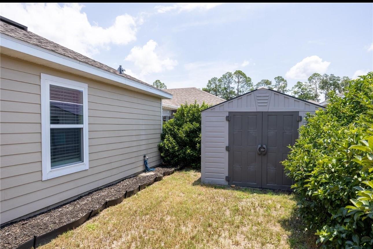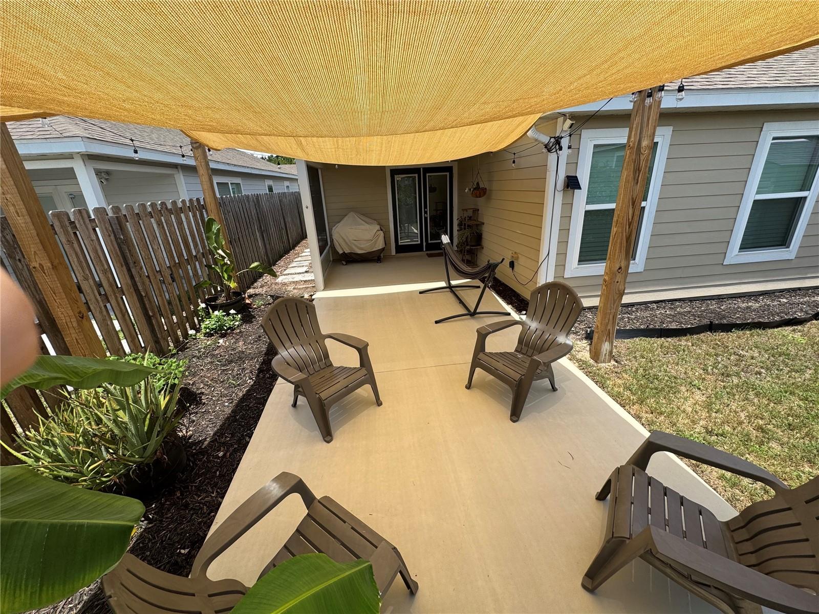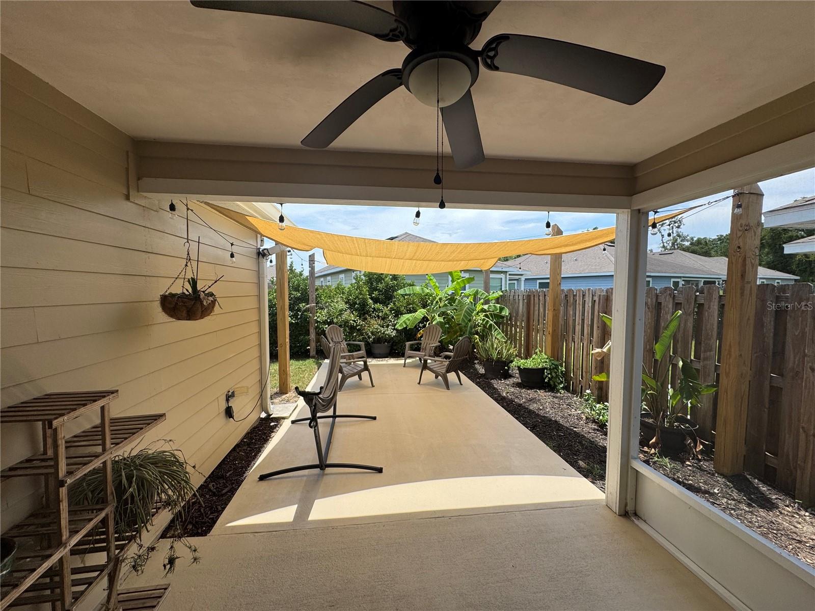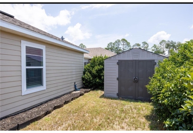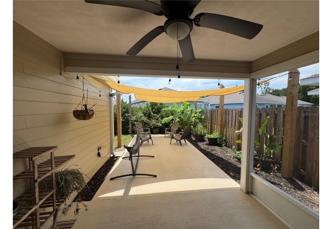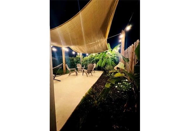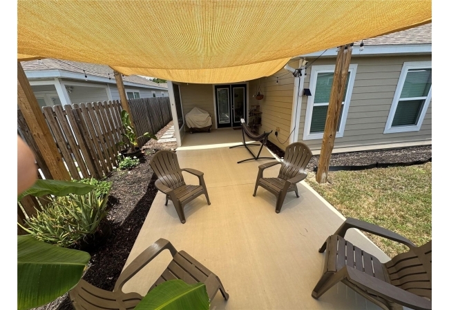 Enjoy outdoor living in the fully fenced backyard featuring a patio awning for shade, a storage shed, and a peaceful setting ideal for relaxing or entertaining.