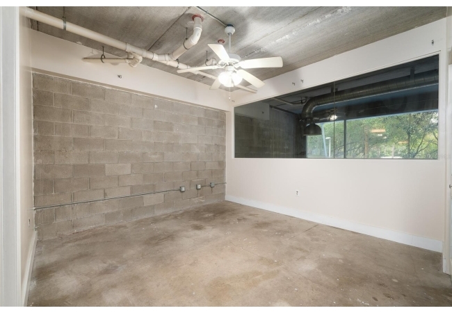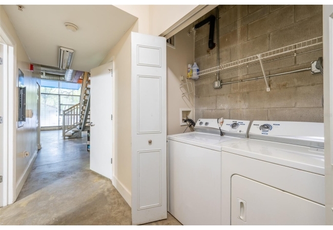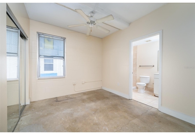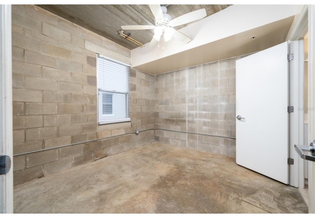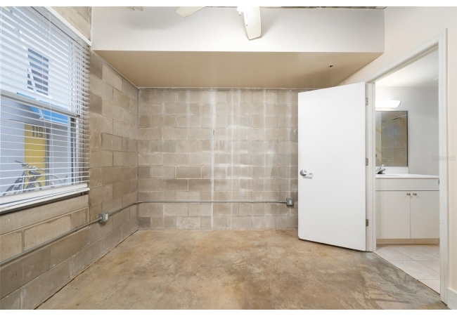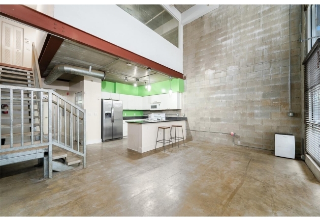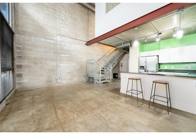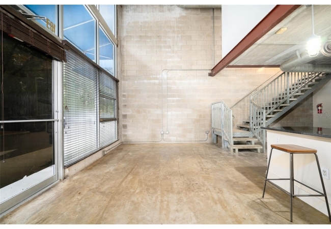 The open living space features concrete floors throughout—no carpet, concrete block walls, and a modern, industrial aesthetic. One bedroom is conveniently located on the main level, while the remaining two are upstairs, including a loft-style bedroom overlooking the living area, creating a bright and airy feel.