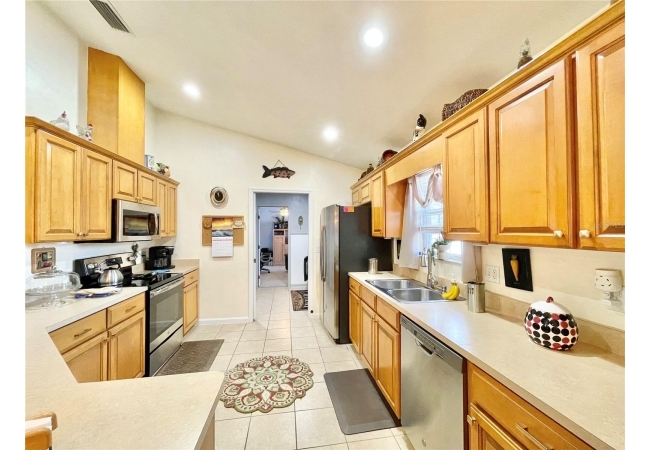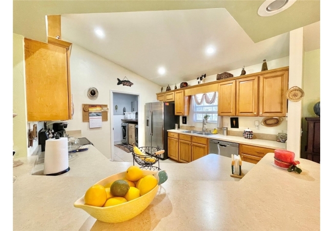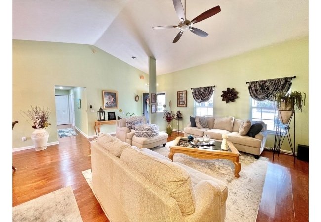 Brick beauty in Newberry’s desirable Country Way subdivision! This spacious 4-bedroom, 2-bath home offers a bright, open layout with laminate flooring throughout the great room, dining area, hallway, and three bedrooms. A vaulted ceiling fills the main living areas with natural light, creating an inviting flow from the great room to the dining area and kitchen. The kitchen features abundant counter space and cabinetry, with an adjacent indoor laundry room and convenient access to the side-entry 2-car garage and the 4th bedroom—ideal for guests or a home office. The primary suite includes a walk-in closet and an en-suite bath with double vanities, a jetted tub, and a separate shower. Off the dining area, two French doors open to a screened, covered lanai overlooking a large backyard complete with a storage shed and wood deck—perfect for outdoor living. The side-entry garage provides a long, paved driveway with plenty of room for a boat or RV. No HOA fees! Roof replaced in 2025 with architectural shingles. Just minutes from dining options, Bravo Supermarket, and the new Publix Marketplace.